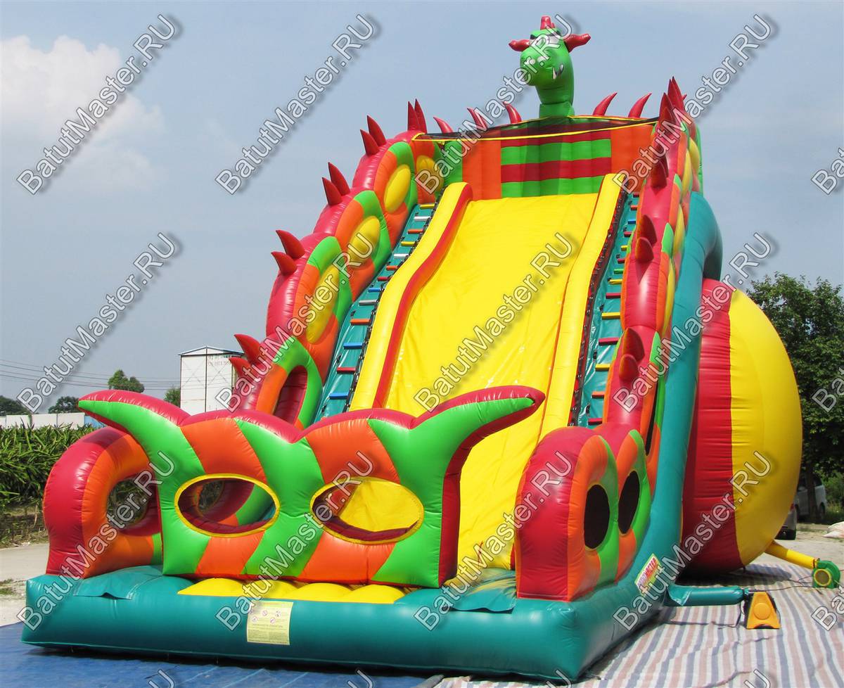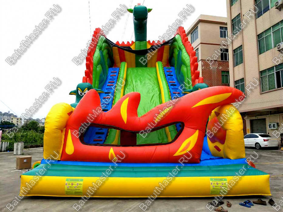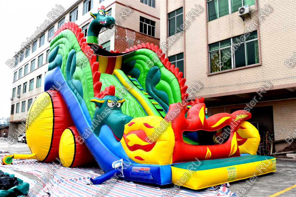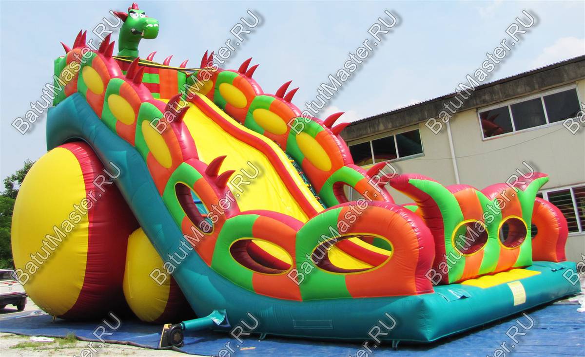 Надувной батут в виде высокой и широкой горки всей своей структурой и расцветкой напоминает туловище настоящего дракона. А что может быть интересней, чем побывать в гостях у настоящего дракона, да еще и развлечься на высокой горке? Внимание детей эта площадка для бизнеса еще и приковывает своей пестрой расцветкой, а фасадная стена из желтого и красного ПВХ действительно напоминает языки пламени огня, которые традиционно выпускают из своей пасти знаменитые драконы, согласно мифам и легендам.