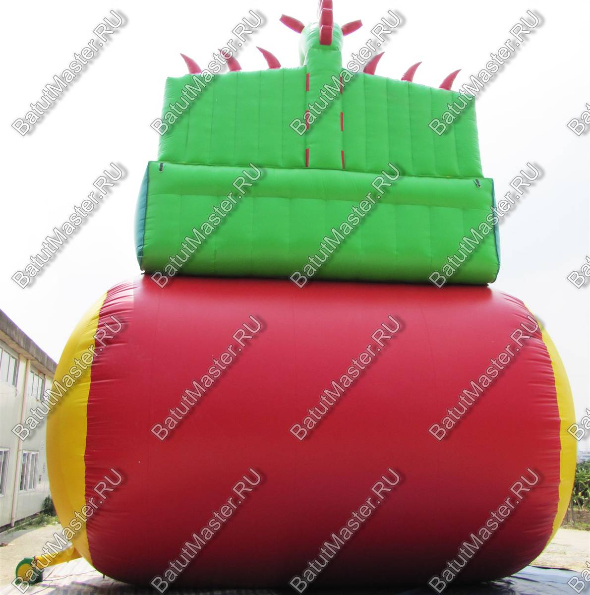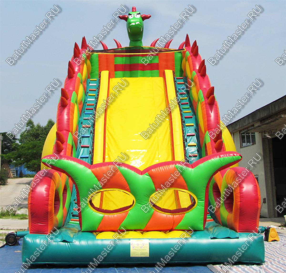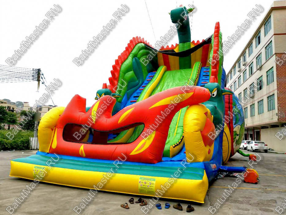 Надувной батут в виде высокой и широкой горки всей своей структурой и расцветкой напоминает туловище настоящего дракона. А что может быть интересней, чем побывать в гостях у настоящего дракона, да еще и развлечься на высокой горке? Внимание детей эта площадка для бизнеса еще и приковывает своей пестрой расцветкой, а фасадная стена из желтого и красного ПВХ действительно напоминает языки пламени огня, которые традиционно выпускают из своей пасти знаменитые драконы, согласно мифам и легендам.