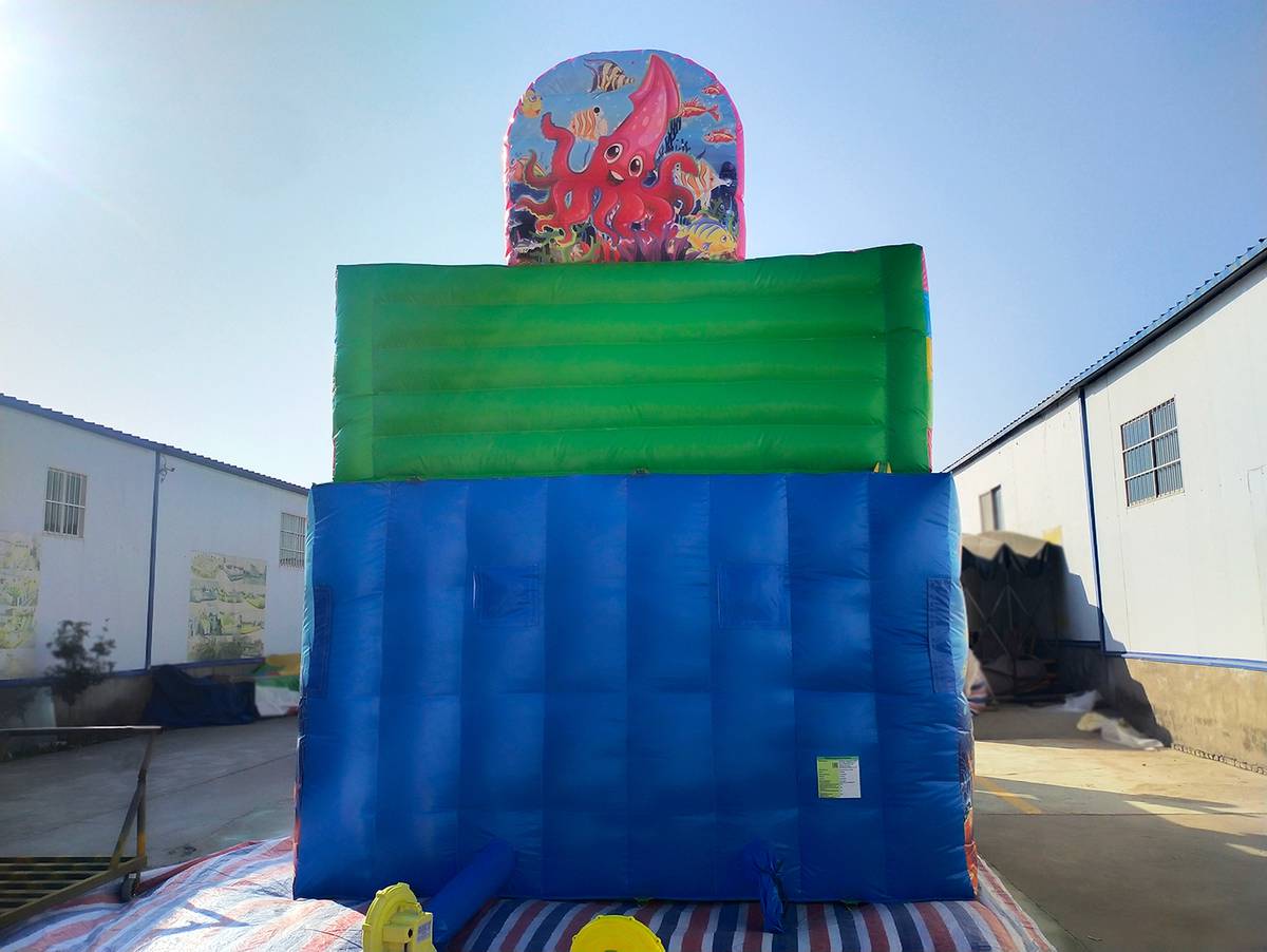 На входе ребят сразу встречает розовый морской обитатель – осьминог. Детки могут попытаться проползти через него или же просто обойти, чтобы быстрее достичь главной цели – горки. Но просто так обойти рыбку не получится, придётся проползти под ней, чтобы дойти до лесенок, ведущих наверх. Самые ловкие и юркие без проблем справятся с этим небольшим испытанием.