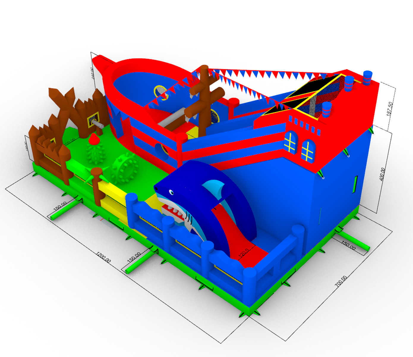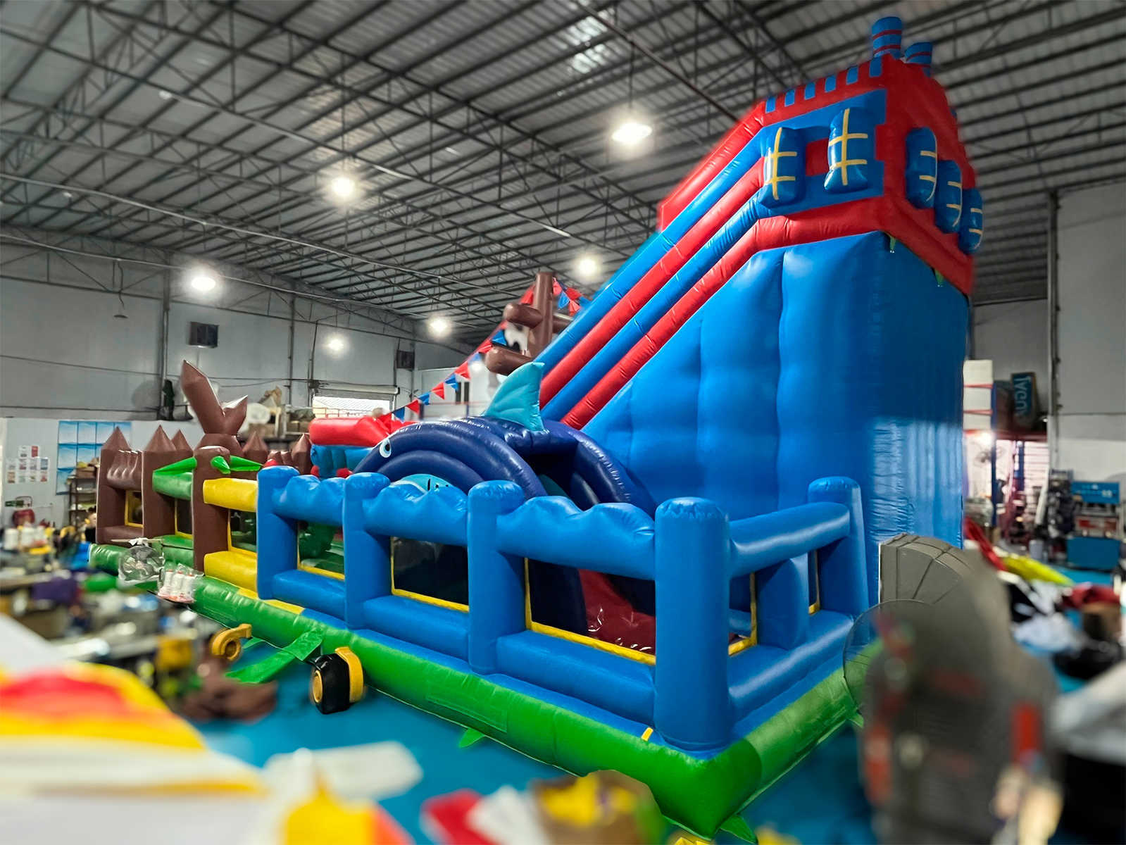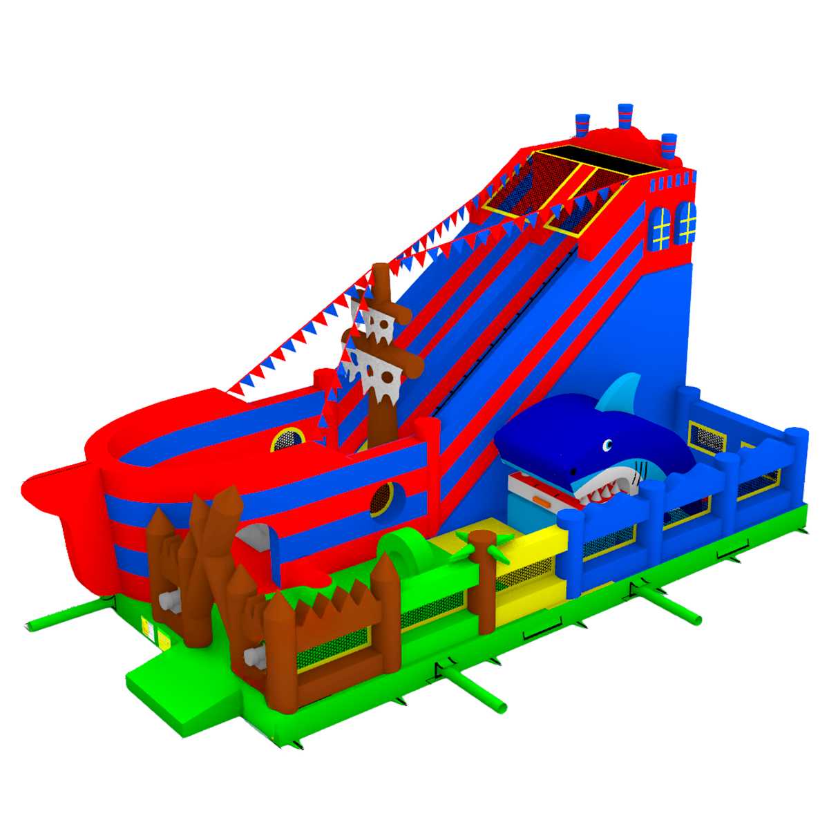 Надувной батут-корабль «Говорящая акула» — это целый мир детских приключений, воплощённый в формате коммерческого надувного аттракциона. Его яркий дизайн в морской пиратской тематике мгновенно захватывает внимание детей: огромная горка, пестрящие флажки, канаты, деревянные мачты и, конечно, акула, выглядывающая из борта, будто охраняет вход на корабль.