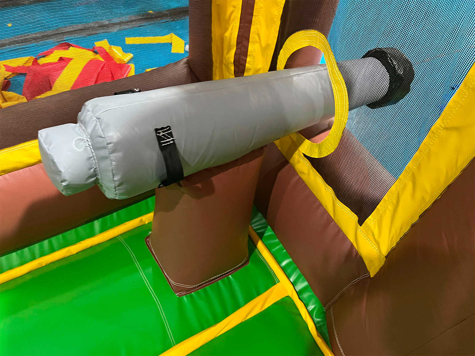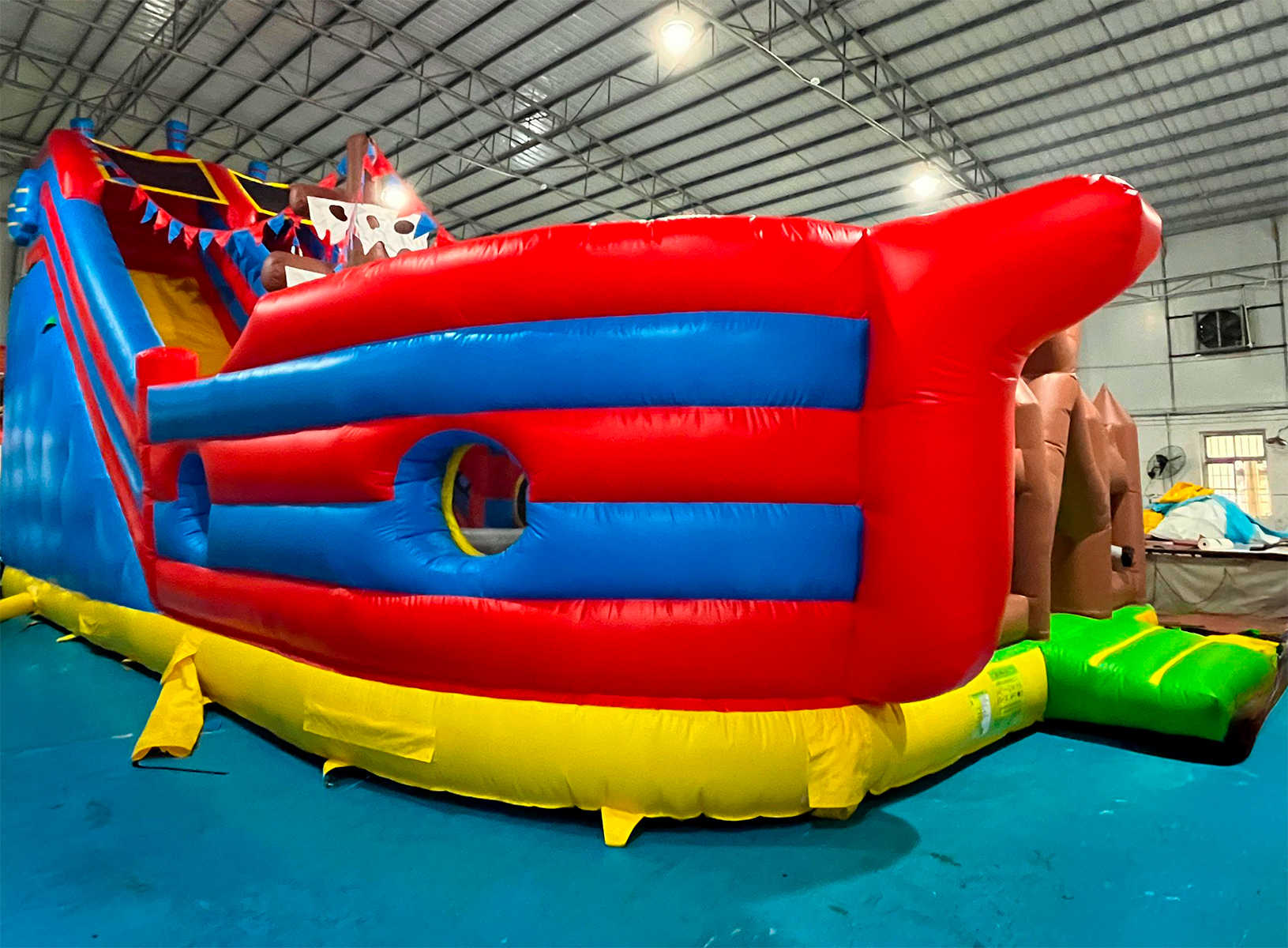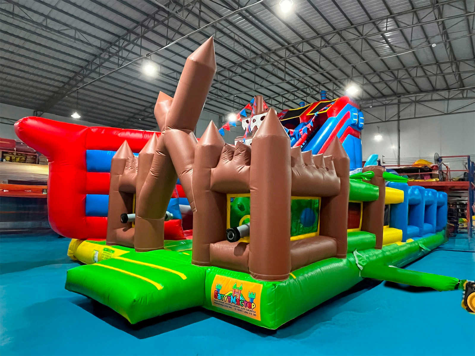 Надувной батут-корабль «Говорящая акула» — это целый мир детских приключений, воплощённый в формате коммерческого надувного аттракциона. Его яркий дизайн в морской пиратской тематике мгновенно захватывает внимание детей: огромная горка, пестрящие флажки, канаты, деревянные мачты и, конечно, акула, выглядывающая из борта, будто охраняет вход на корабль.