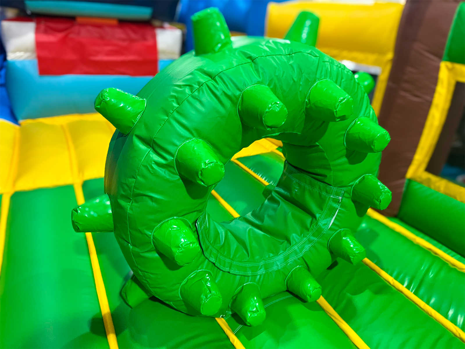 Вся площадь — 84 м² — превращена в игровую зону с разделениями на зоны: скалодрома нет, зато есть стартовая горка высотой 3,5 метра, мягкие игровые элементы, арки и тоннели. При этом конструкция односекционная, что упрощает установку и перемещение.