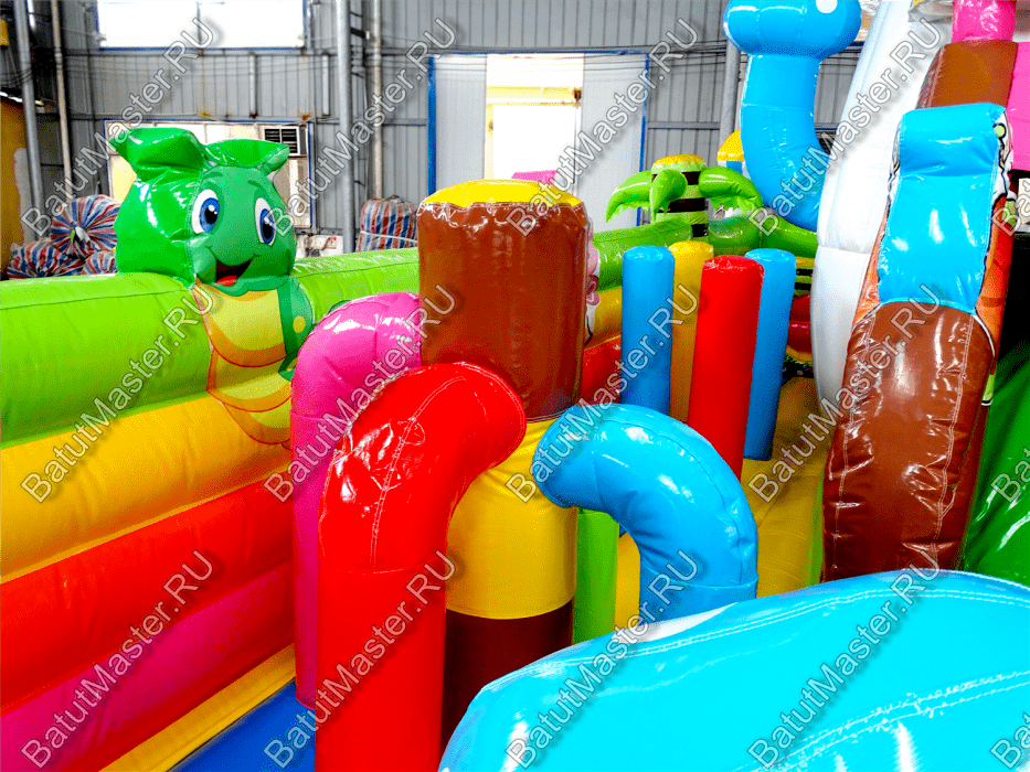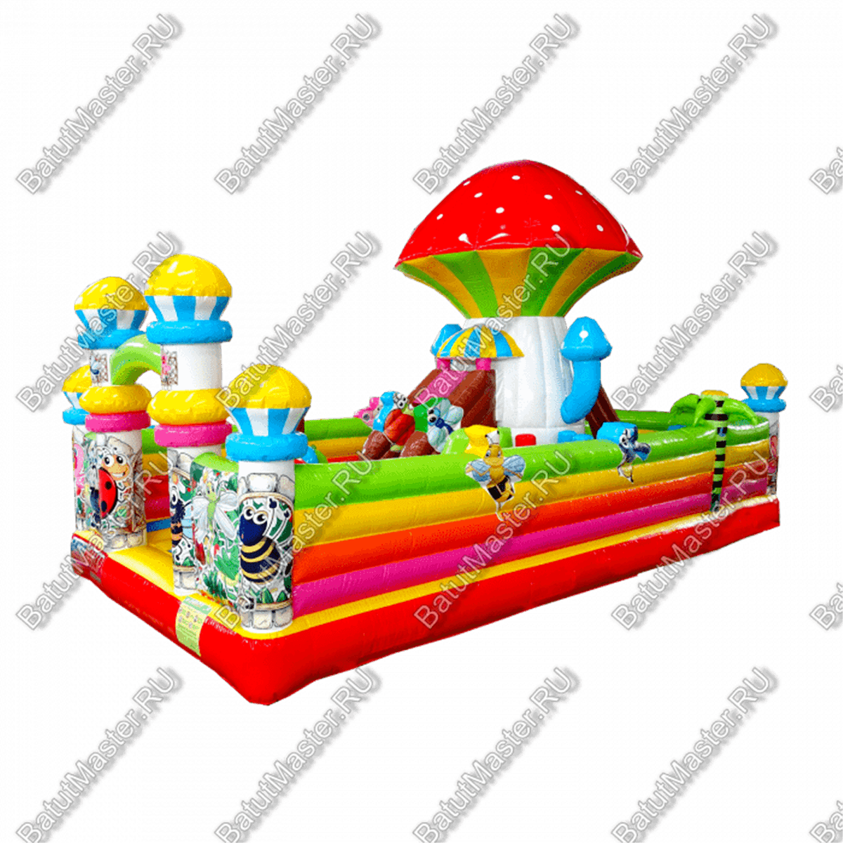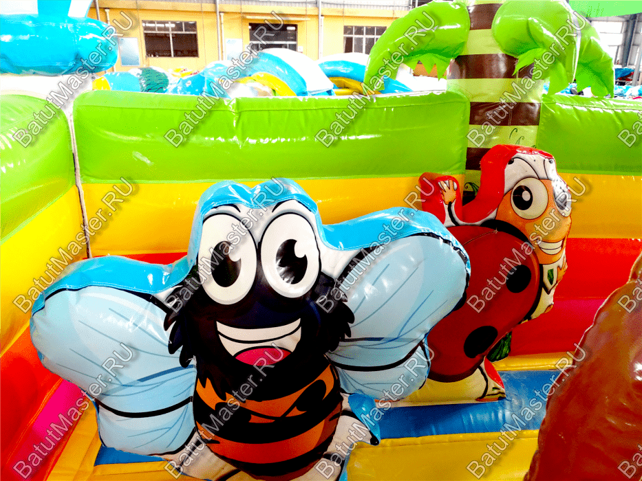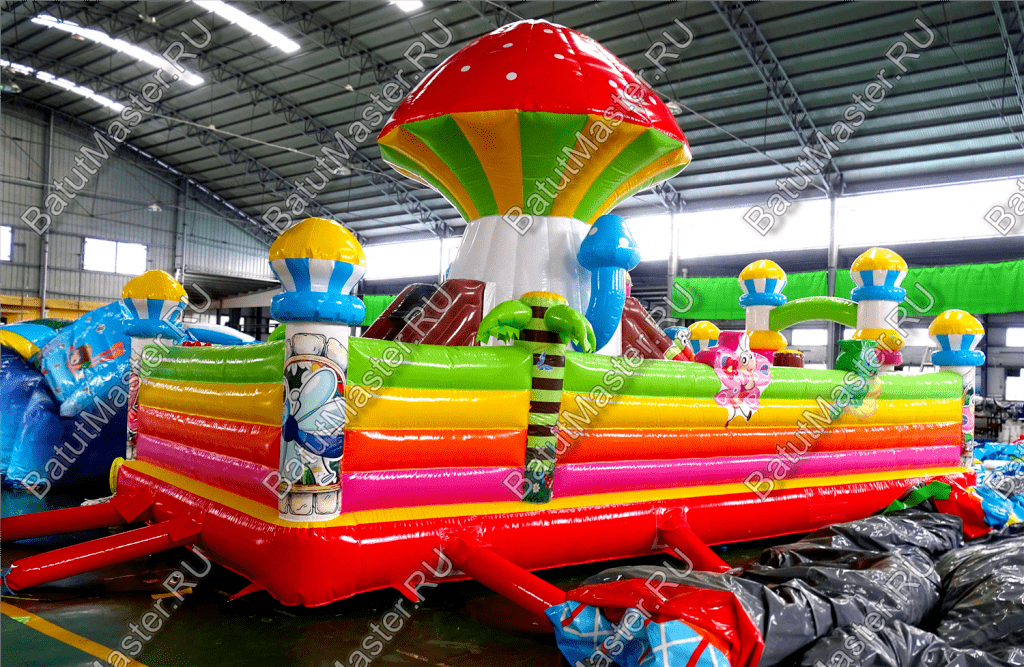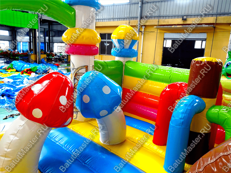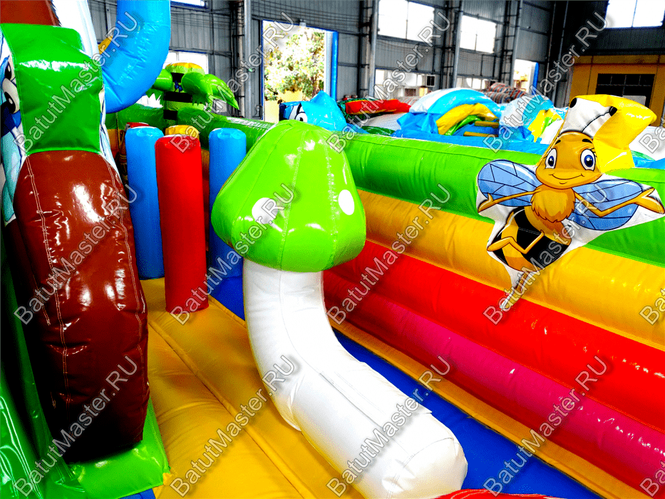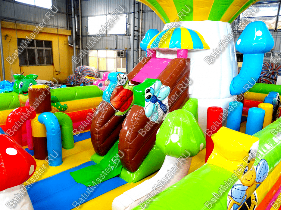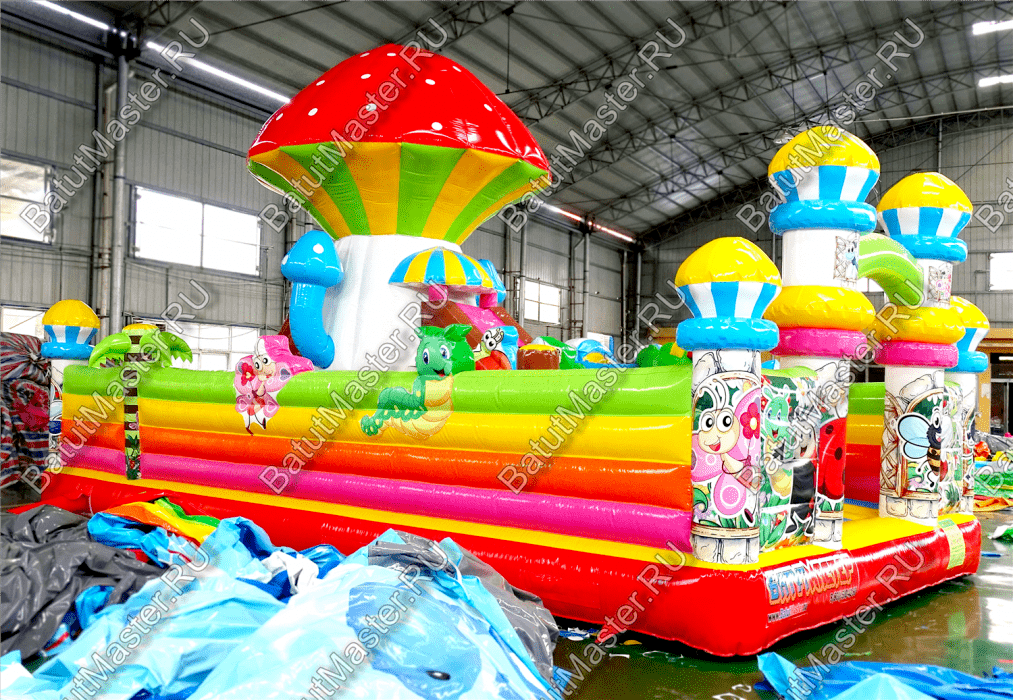 Попав внутрь батута, у ребёнка не останется сомнений в том, что он находится на сказочной лесной полянке с разноцветными грибами и забавными букашками. Батут изобилует игровыми фигурами и надувными грушами, с которыми очень весело играть. Огромный гриб на полянке является ещё и горкой, что добавит веселья в игру.