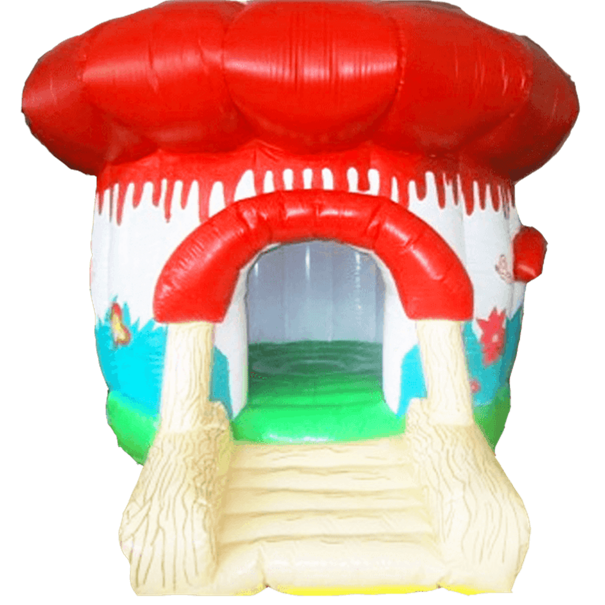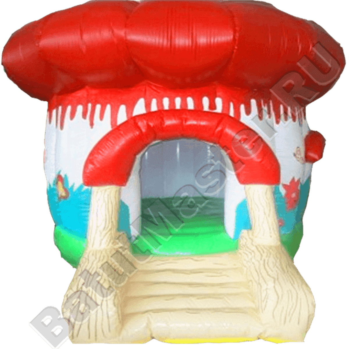 Вход в него тоже надувной и выполнен в виде бежевых мягких ступеней, которые ведут внутрь гриба. Крыша в приплюснутой шляпке красного цвета станет надежной защитой от дождя или солнца. Может показаться, что этомаленький надувной батут, но это не так, он позволяет в себя вместить достаточно малышей, чтобы как можно раньше окупиться.