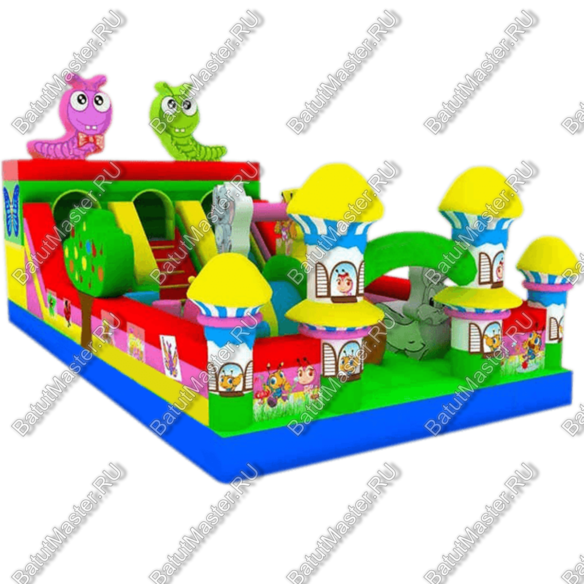 Этот многофункциональный батут на самой верхней точке украшают 2 гусенички ярко зеленого и фиолетового цвета. Все животные и насекомые излучают радость и веселье в своих глазах и улыбках. Любимая детская достопримечательность – горки спускаются с задней стенки. По середине их разделяет лестница вверх с забавным слоником. После того, как ребенок поднимется на самую верхнюю точку, его ждет небольшой туннель или домики с арками для выхода на горки. Игровые фигуры встречаются по всей площадке, найдется даже озорной зайчик.