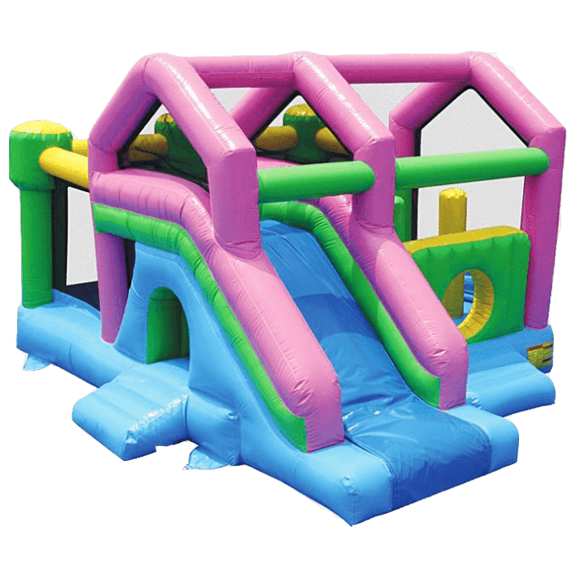 Начинается аттракцион с традиционной подушки безопасности, но сам вход выполнен необычно – в виде тоннеля, который приводит детей на открытую игровую площадку. Конструкция, которая напоминает дом, изготовлена из нежно голубого ПВХ, но внутреннее пространство – из светло зеленого. Задняя площадка – это место для прыжков и бега с внешними стенками из сетки. В этой части батута установлены игровые фигуры в виде спортивных препятствий, поэтому простые прыжки могут быстро перерасти в настоящее соревнование. Именно с этой зоны можно подняться на верхний этаж аттракциона и попасть на стартовую площадку. Эта часть батута для бизнеса оборудована сеткой и полностью безопасная для детей любого возраста. Прямо над ней проходит сиреневый остов, напоминающий крышу.