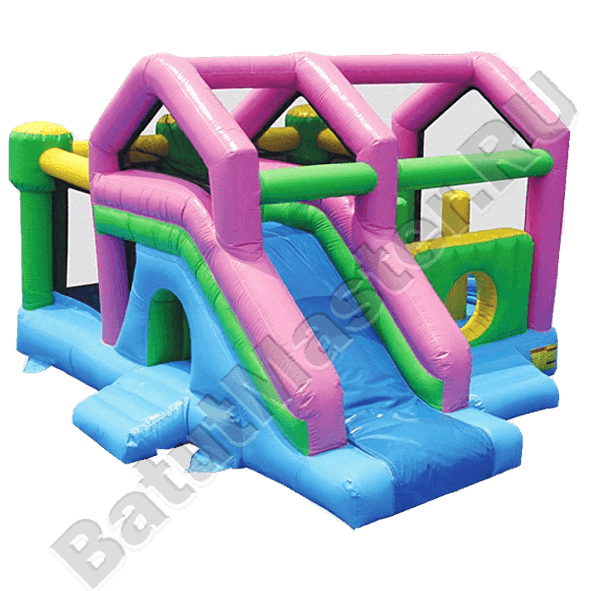 Оригинальное сочетание нежных оттенков сиреневого, голубого, зеленого и желтого цветов делает надувной батут заметным и более эффектным. Основная конструкция напоминает настоящий дом с надувными балками крыши, но без основного покрытия, которое бы укрывало верхнюю часть коммерческой площадки.