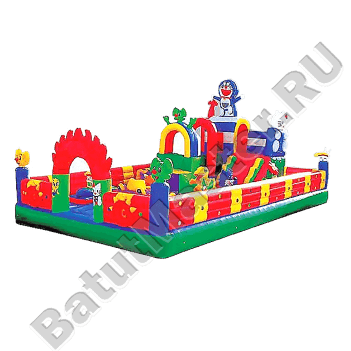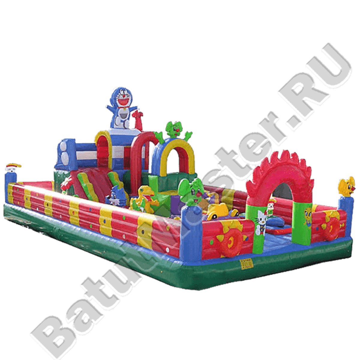 Качественный надувной батут произведен из высокопрочного неаллергенного материала, цвета покрытия не тускнеют под воздействием солнца и не выгорают. А все фигурки растений и животных выдерживают прыжки и весовые нагрузки. Основа разработана в сине-зеленой цветовой гамме. Вход на аттракцион ограничен огненной аркой и надувным порогом, что позволяет повысить безопасность игры на площадке. Дугообразные элементы высоких переходов красного, синего и желтого цветов делают путешествие более увлекательным.