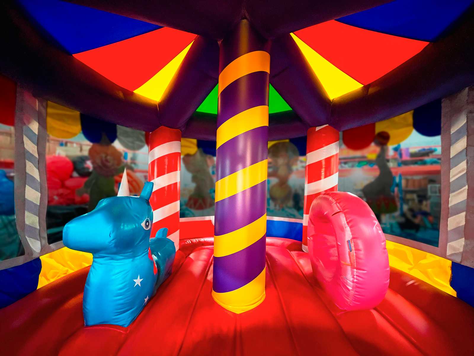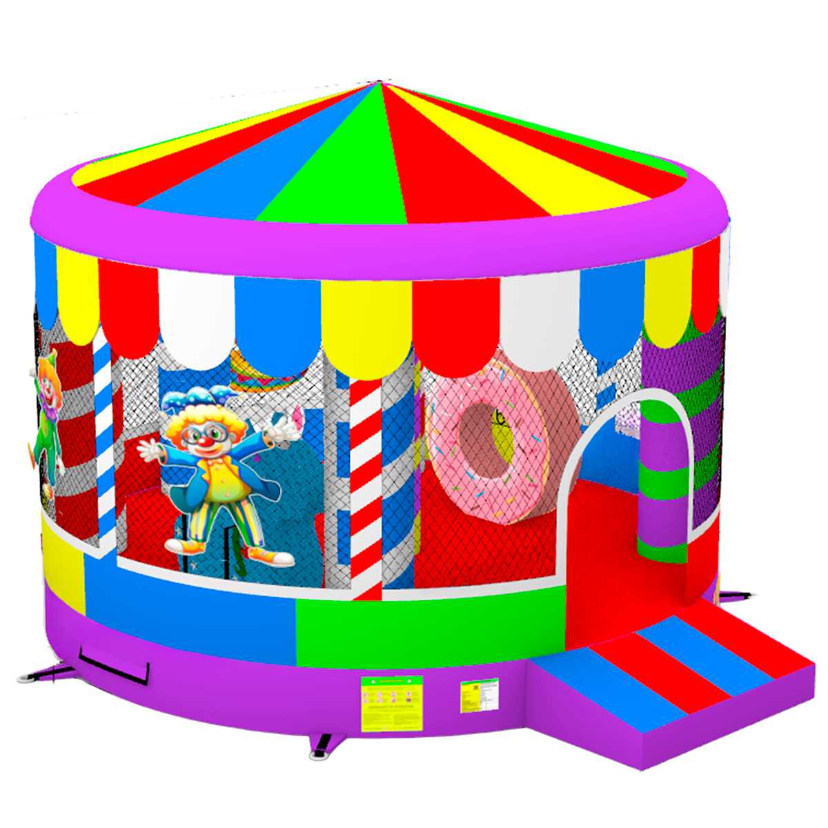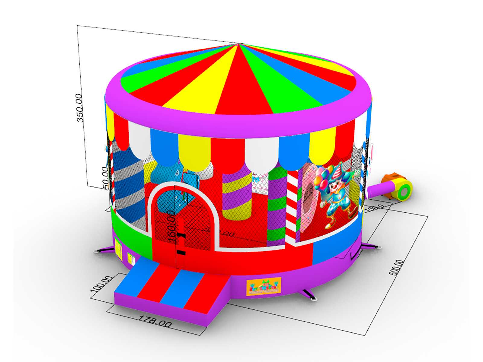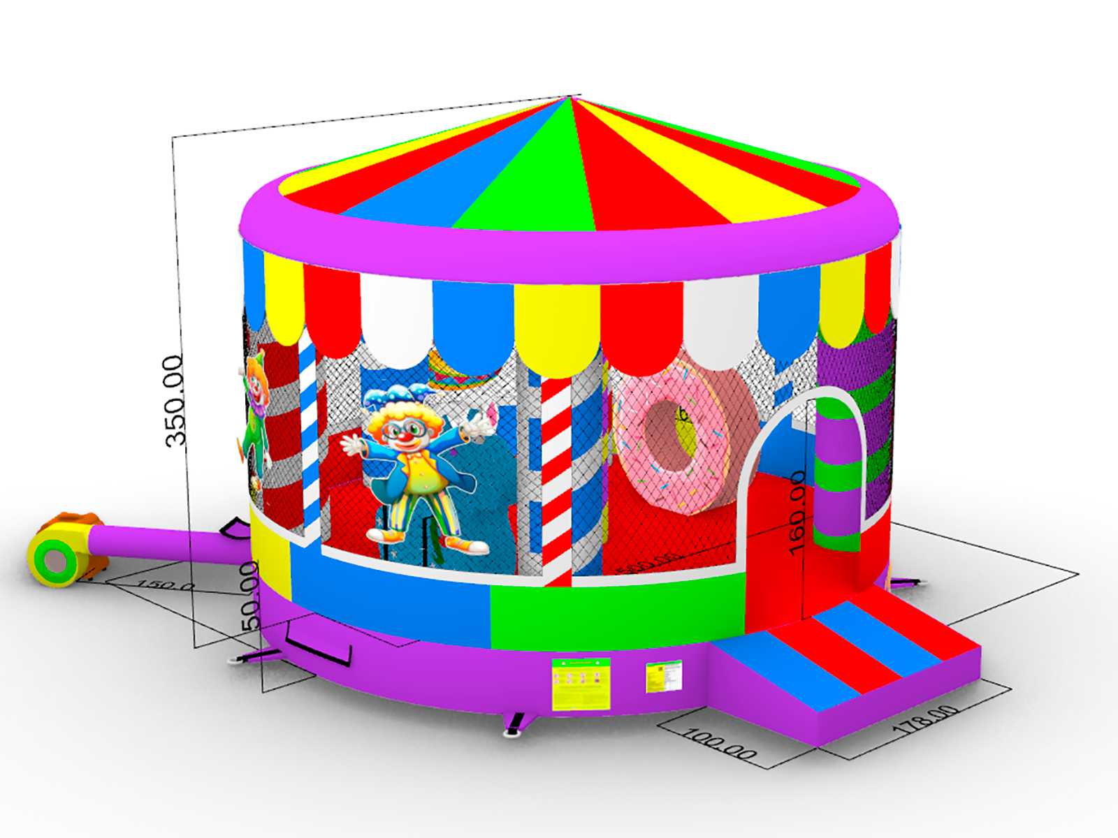 Добро пожаловать в атмосферу ярмарки, смеха и разноцветных шатров! Надувной батут «Карамельное Чудо» 5x5x3.5 — это идеальное решение для владельцев бизнеса в сфере детских развлечений. Дизайн батута выполнен в виде цирковой арены с куполообразной крышей и колоннами, напоминающими сладкие трости. Внутри — игровое пространство, где дети могут прыгать, бегать, взаимодействовать с надувными зверята в виде единорога, котёнка и сладкого почника. Батут выполнен из прочного армированного ПВХ толщиной 0,55 мм, способного выдерживать интенсивную эксплуатацию. Это идеальный формат для установки в парках, на городских праздниках, в торговых центрах, спортзалах и даже школьных дворах.