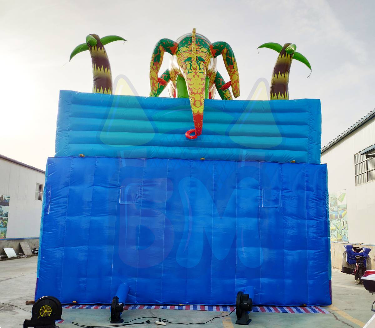 Вход батута украшают надувные модули в виде клыков динозавра, надувные пальмы и рисунки ледникового периода. Детям понравятся фигуры обезьян, динозавров, которые размещены по всему комплексу. Здесь есть большой скалодром с домиком наверху и горкой, надувной тоннель, а в конце батута две широкие горки с трамплином. Наверху таких горок также есть домики, где дети смогут поиграть в прятки. Здесь каждая деталь интересна и притягивает взгляд. Стоит отметить и большую зону для прыжков. Дети будут в восторге от такого батута и захотят посетить его снова и снова.