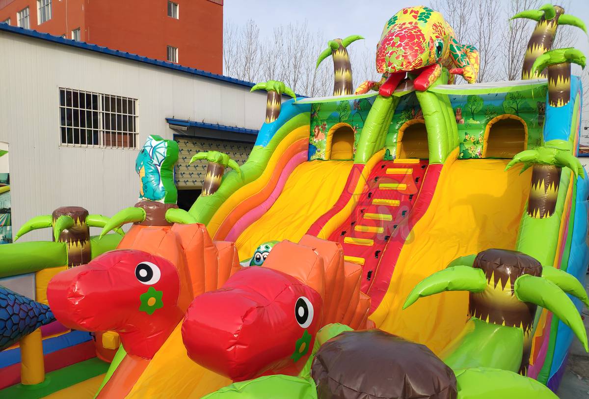Общая тематика взята из доисторического времени, эпохи динозавров, поэтому сразу после входа детей встречает огромная фигура синего динозавра. Немного правее для малышей установлена горка, и тоже выполненная в виде 2 динозавриков. На просторной территории аттракциона собрано целое множество различных игровых фигур и даже препятствий. Здесь можно найти горку с пауком, турники, качалку, солнце с клыками, зебру, тоннели и даже еще один выход с правой стороны батута.