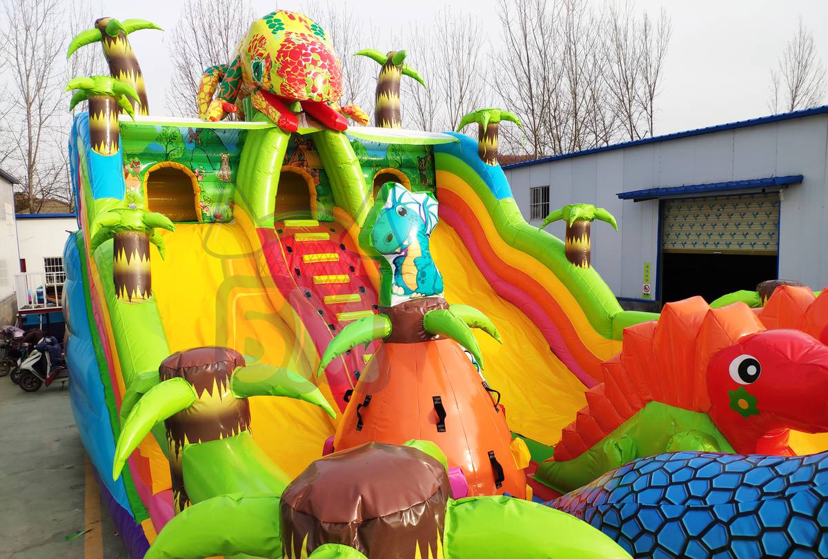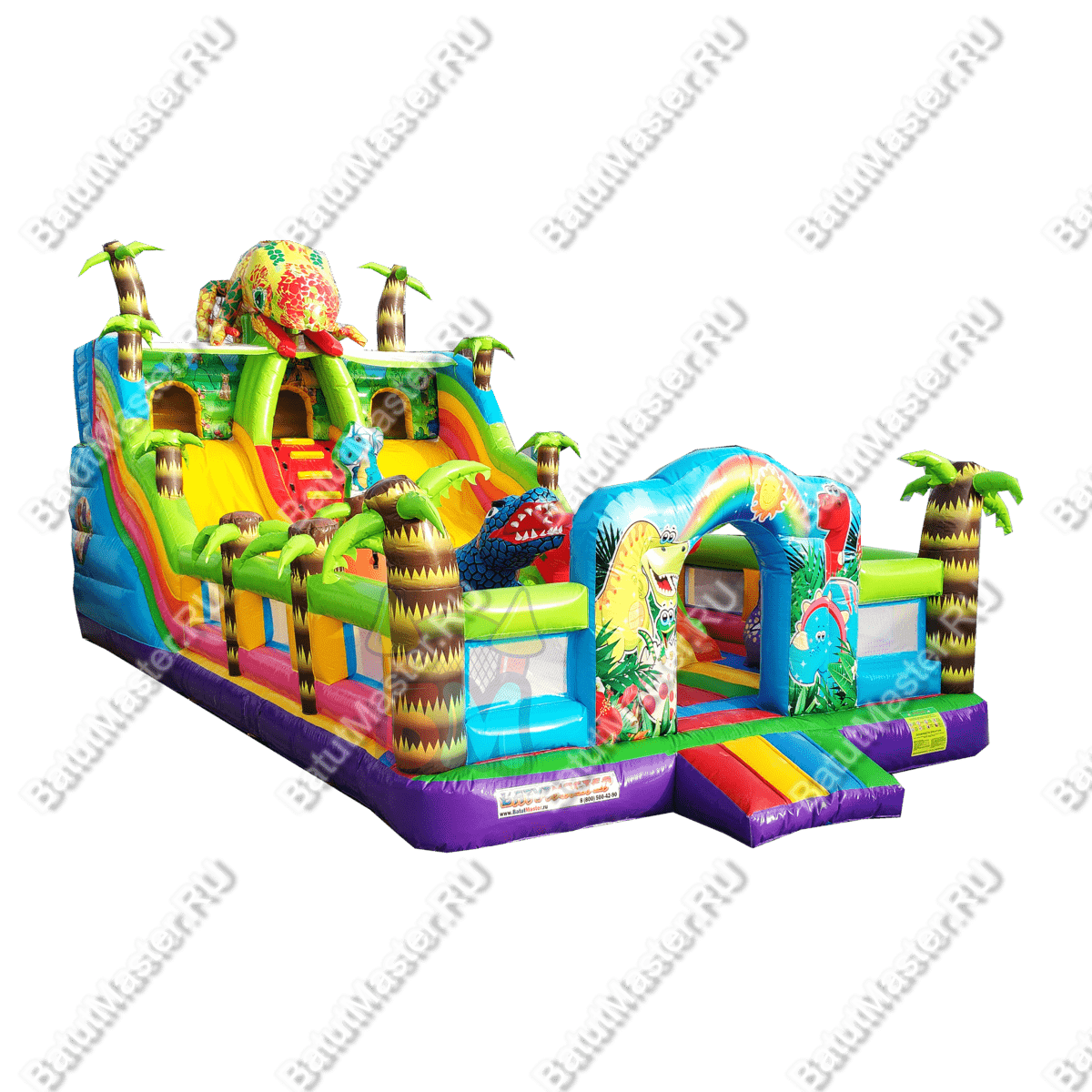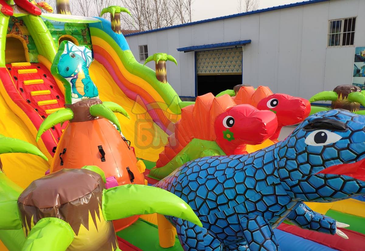 Войти на батут для бизнеса можно через входную арку в виде огромных надувных клыков. Дальше юных путешественников встретит высокая фигура синего надувного динозавра и рядом стоящая невысокая горка, выполненная в виде двух оранжевых динозавриков.