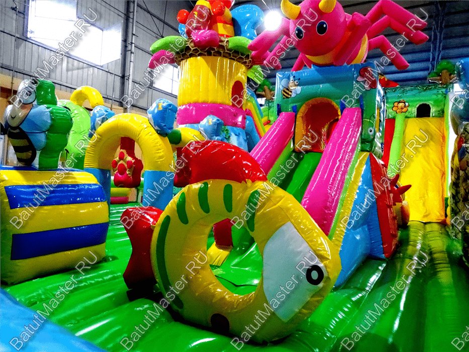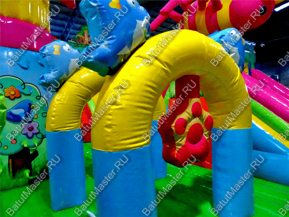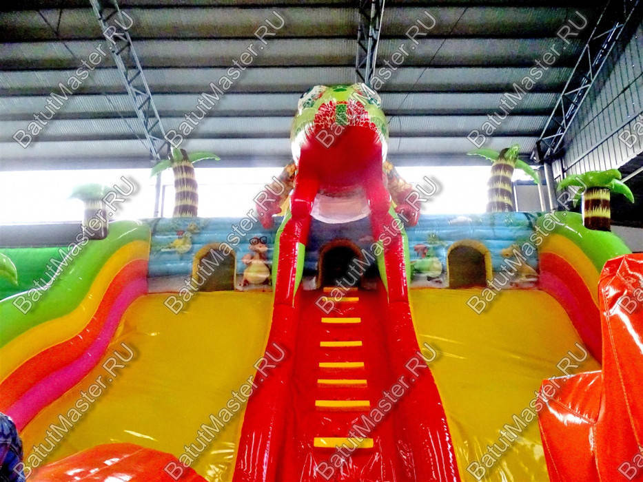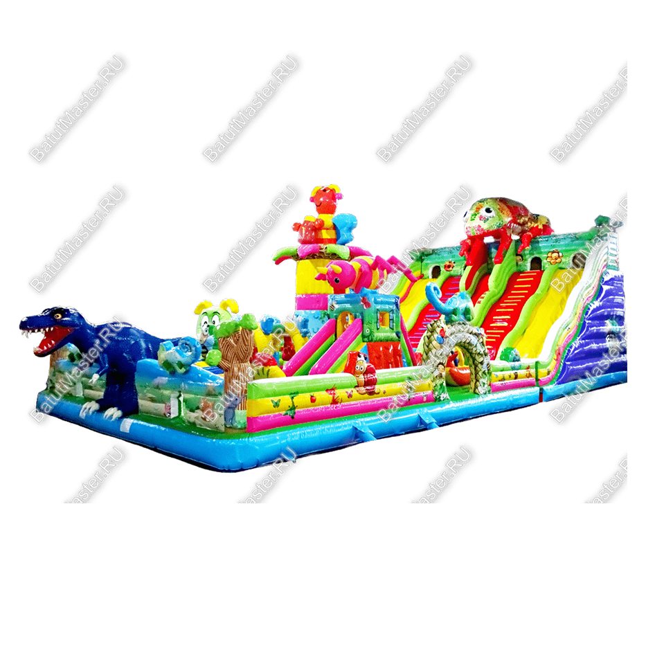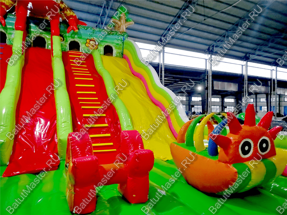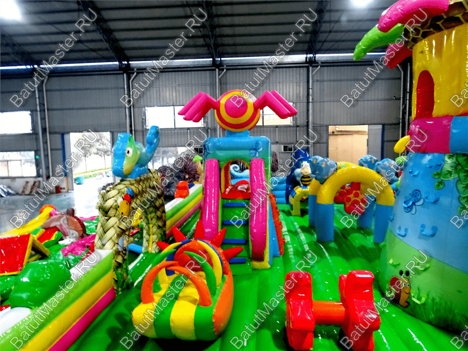 Представленный надувной батут «Хамелеон и динозавры» в габаритах 20 на 10 м с максимально высокой точкой на высоте 7 м представляет собой многофункциональную площадку для бизнеса, насыщенную различными надувными фигурами. На территории этого коммерческого аттракциона смогли разместиться персонажи из разных сказок, просто животные или спортивные препятствия.