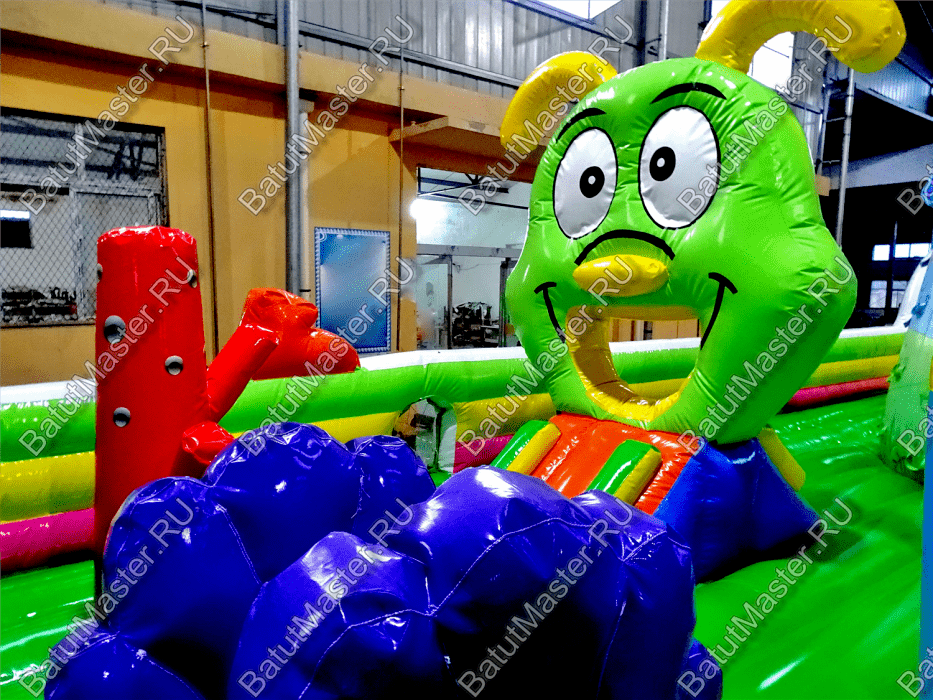 И все же ключевая роль в аттракционе отведена высокой горке с высотой стартовой площадки 4 м. Верх этой конструкции украшает огромная фигура надувного разноцветного хамелеона. Полотно всей зоны разделено на 3 склиза, где центральное место принадлежит лестнице.