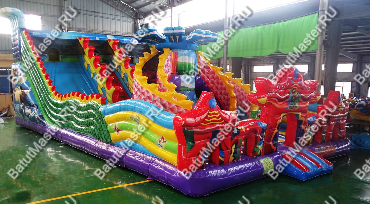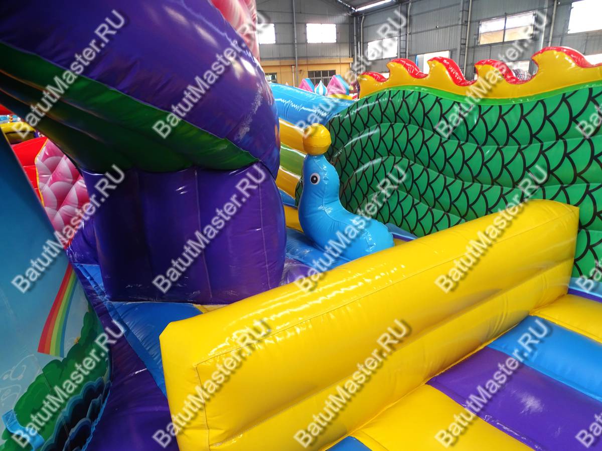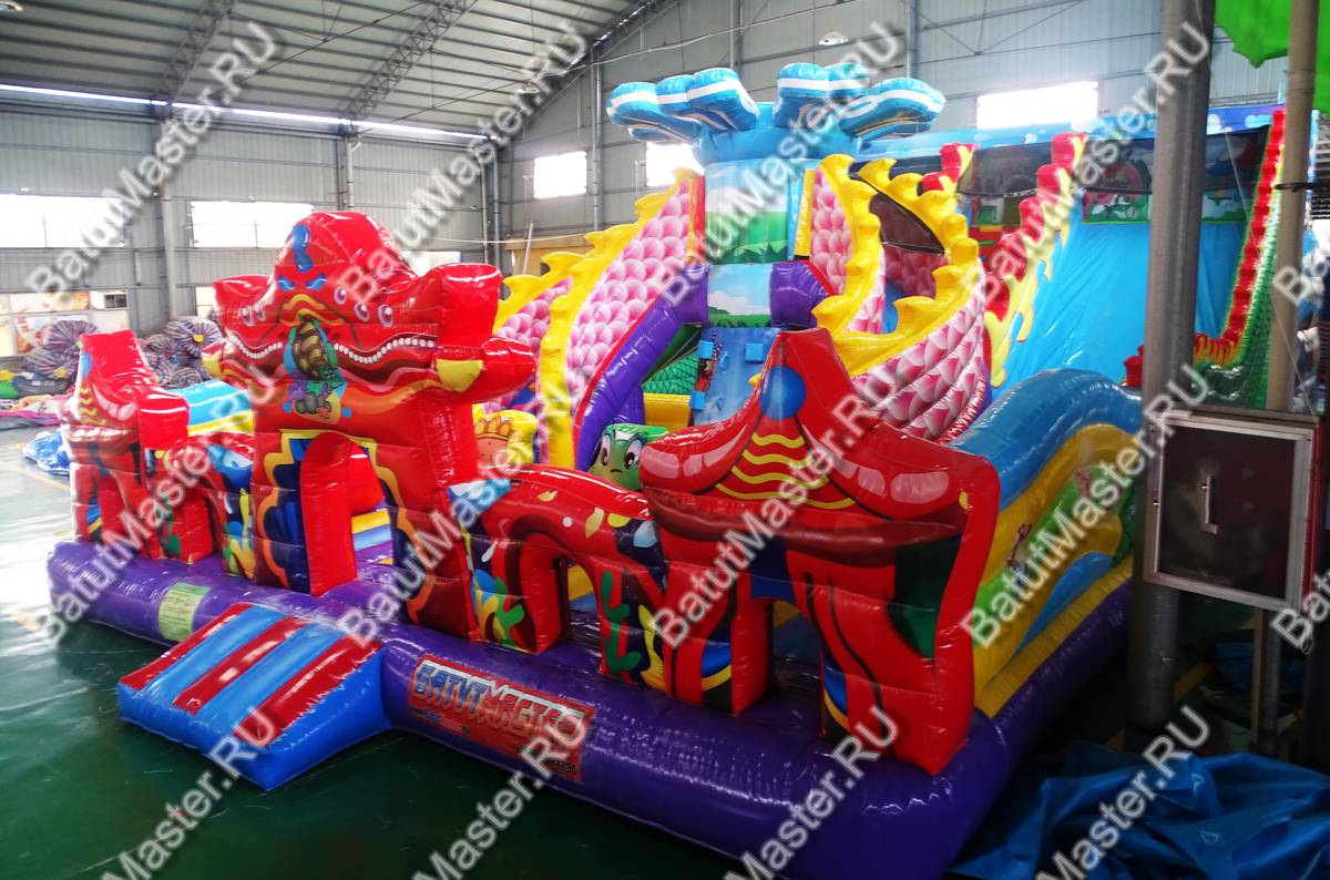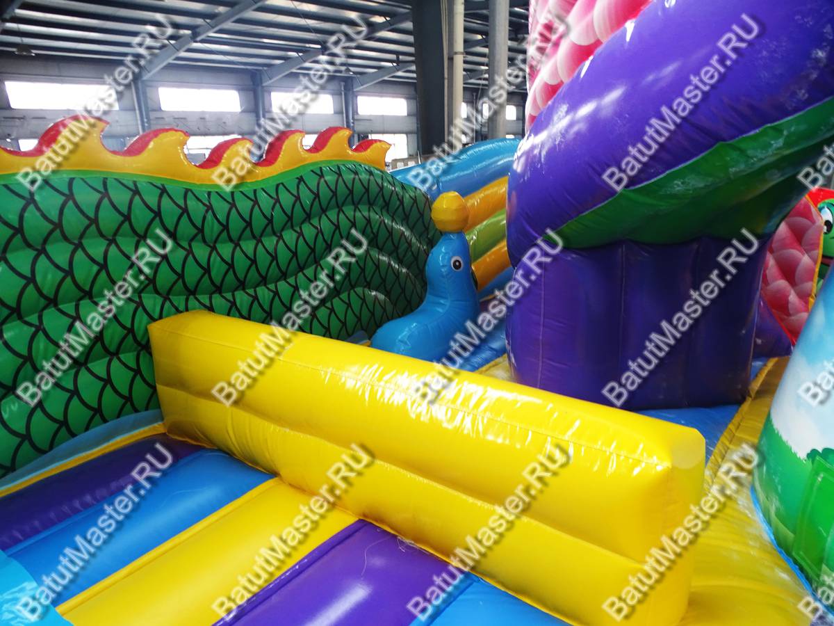 Мега просторный надувной батут создан из самых пестрых элементов, создающих многофункциональный комплекс развлечений. Фронтальная стена сразу говорит об основной тематике коммерческого аттракциона, море, так как создана в стиле ракушек с жемчугом и морских звезд. Всего эта стена вмещает пять красочных арок из синего и красного ПВХ, и только центральная арка является входной, остальные четыре – это сетчатые «окна». Боковые стороны – волнистые разноцветные ярусы, плавно перетекающие в хвост дракона ближе к задней стене батута.