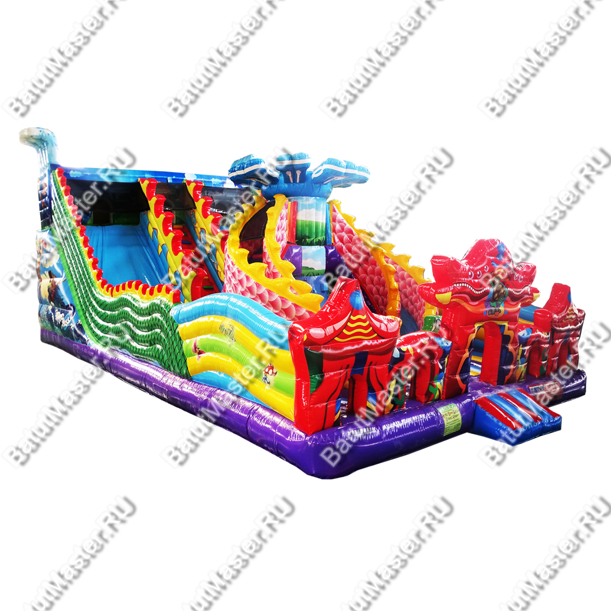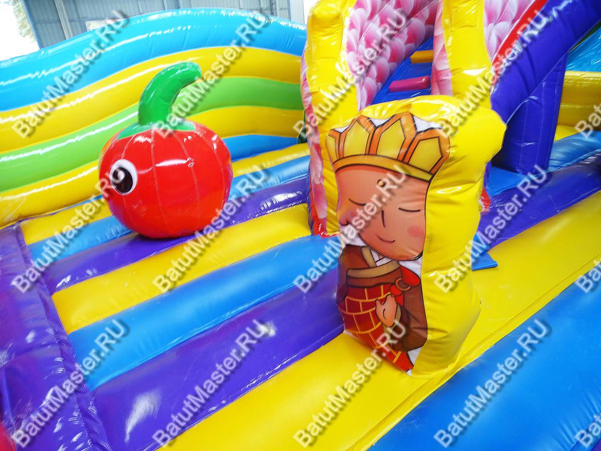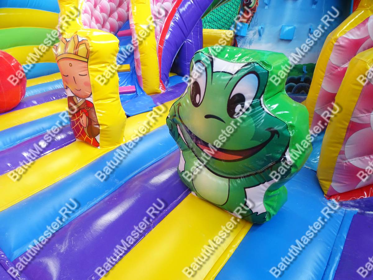 Мега просторный надувной батут создан из самых пестрых элементов, создающих многофункциональный комплекс развлечений. Фронтальная стена сразу говорит об основной тематике коммерческого аттракциона, море, так как создана в стиле ракушек с жемчугом и морских звезд. Всего эта стена вмещает пять красочных арок из синего и красного ПВХ, и только центральная арка является входной, остальные четыре – это сетчатые «окна». Боковые стороны – волнистые разноцветные ярусы, плавно перетекающие в хвост дракона ближе к задней стене батута.