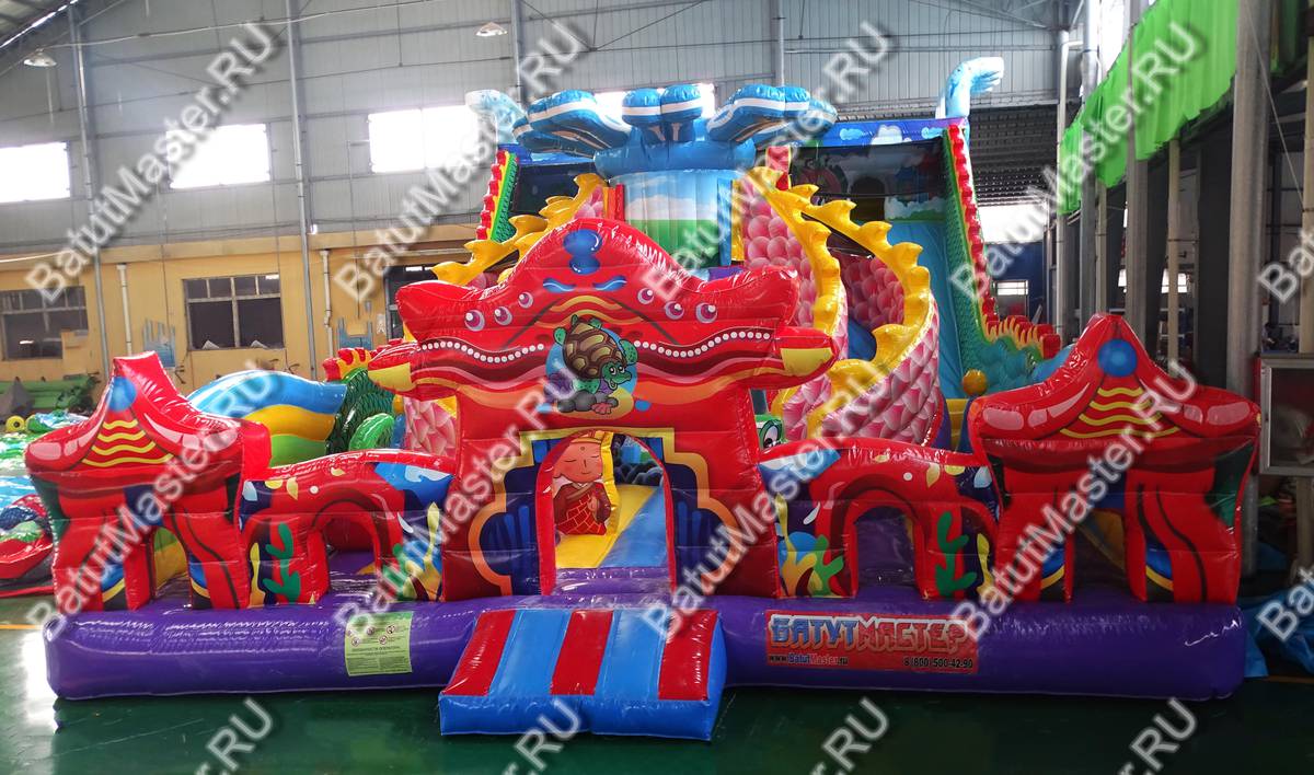 На основной прыгательной площадке установлены надувные фигуры драконов, морских звезд, тюленей, также здесь поместилось множество арок и даже горка для малышей в виде грозной акулы. Сразу за этими фигурами из надувной розовой чешуи формируется высокая горка с изгибом в самом спуске и лестнице. Верх этой конструкции украшает высокая фигура насекомого. И на заднем плане коммерческого аттракциона расположилась самая увлекательная зона: высокая горка под огромной головой дракона с закрытой стартовой площадкой. Лестницы этой конструкции проходят полукругом по заднему периметру аттракциона, стенки обрамляют красно-желтые зубцы хвоста дракона.