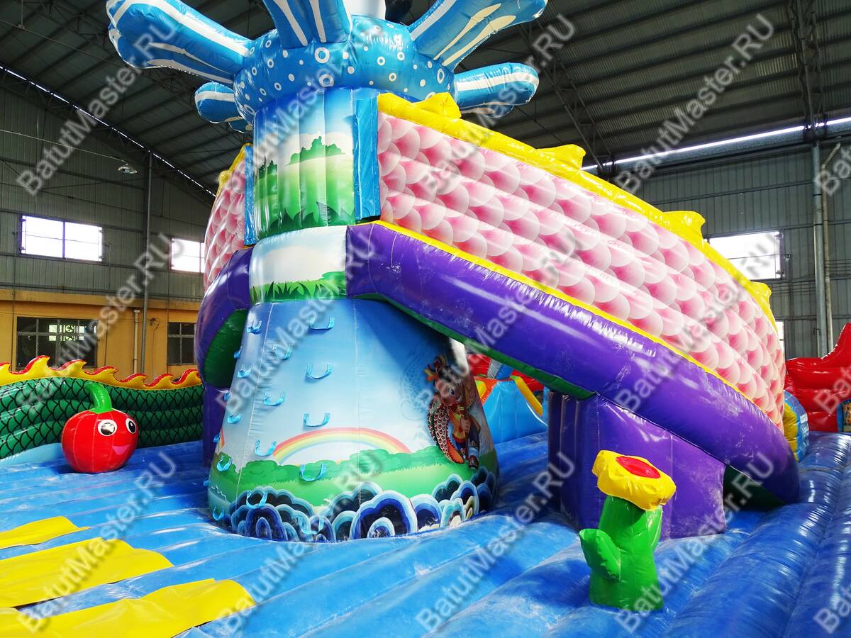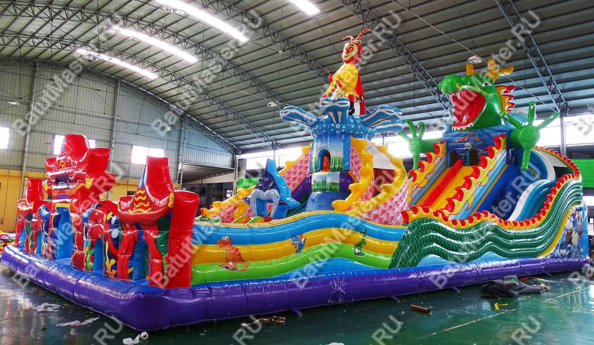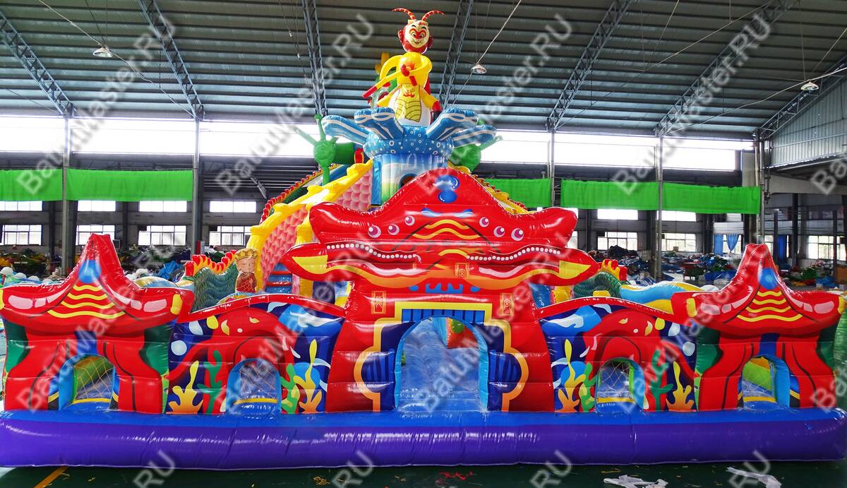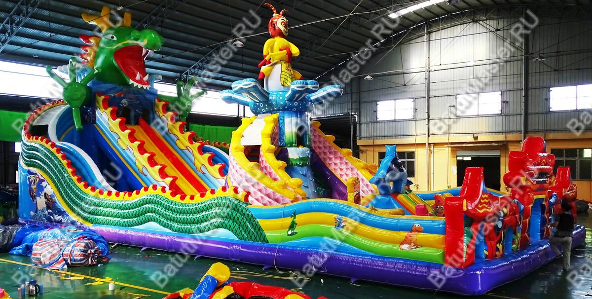 Интересный, красочный и современный комплекс «Хижина дракона» привлечет внимание детей разного возраста. Это не просто надувной батут, это целая арена для невероятных приключений, где дети получат незабываемые эмоции. Здесь есть скалодром, надувные лягушки, овощи, мишки и другие животные, на которые можно забираться и весело падать вниз на мягкую основу. Стоит отметить несколько горок разной величины, а также подъемы, оборудованные мягкими ступеньками. Здесь есть огромное поле для прыжков, игр в догонялки и прятки. Вход оборудован в виде китайского домика с драконом, который и задает тематику батуту.
