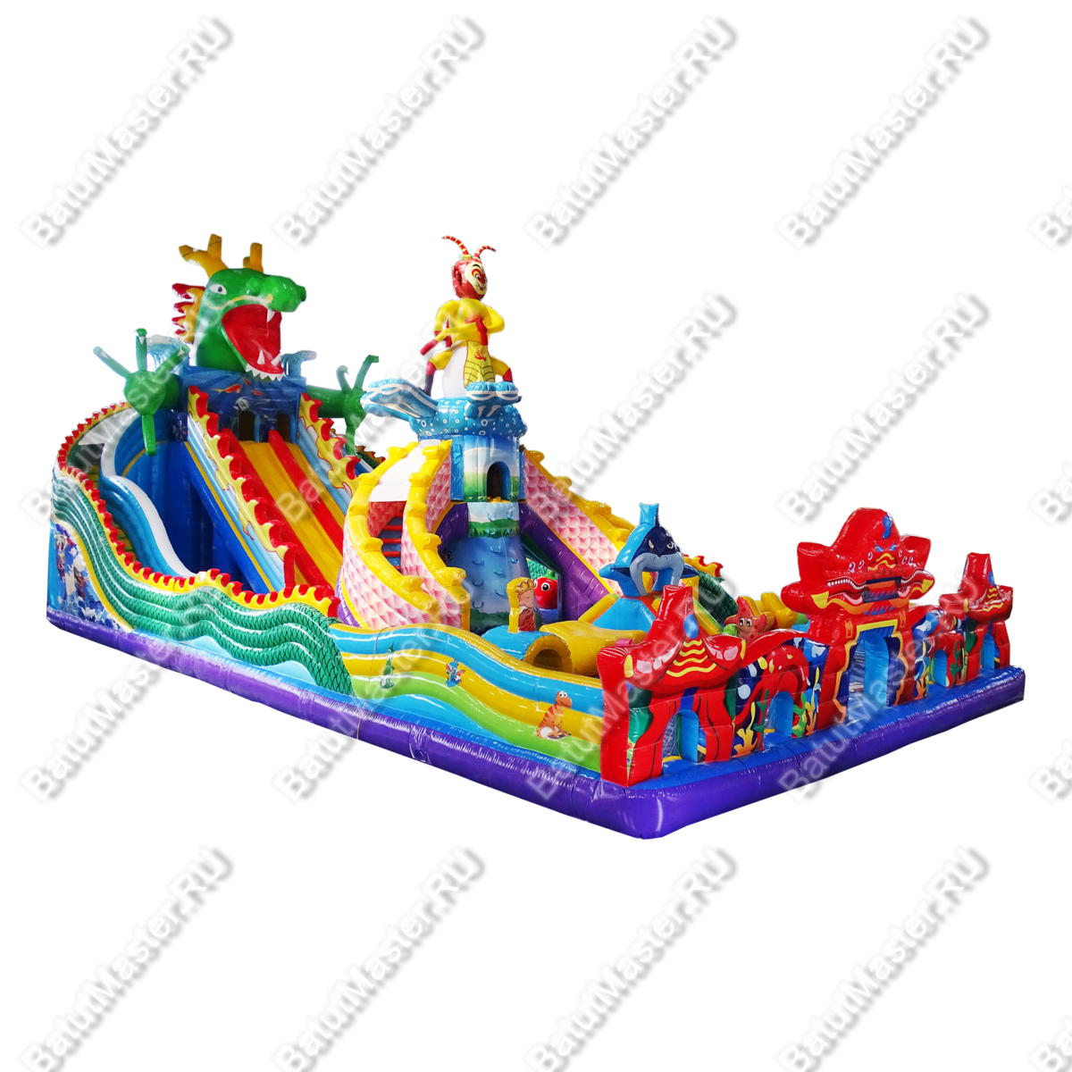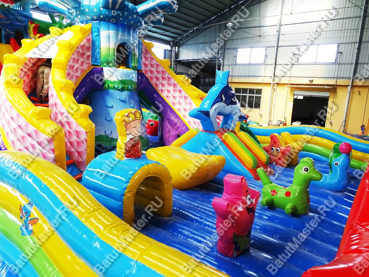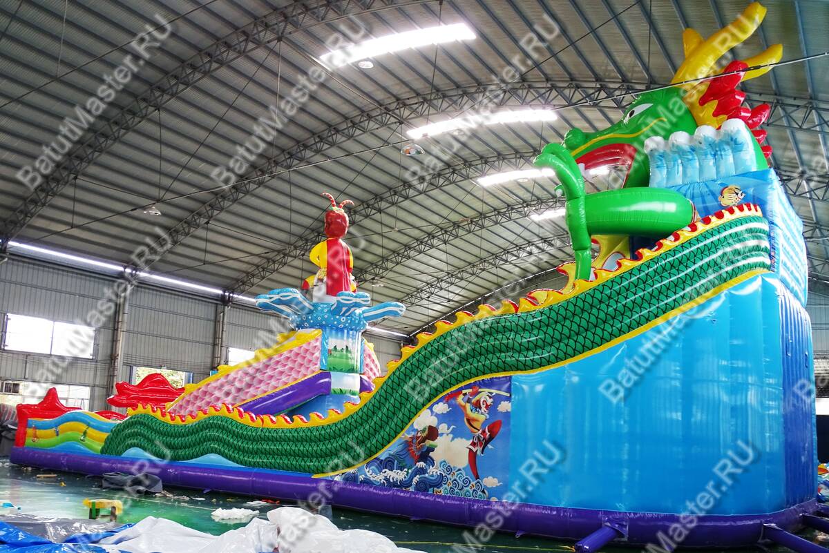 Интересный, красочный и современный комплекс «Хижина дракона» привлечет внимание детей разного возраста. Это не просто надувной батут, это целая арена для невероятных приключений, где дети получат незабываемые эмоции. Здесь есть скалодром, надувные лягушки, овощи, мишки и другие животные, на которые можно забираться и весело падать вниз на мягкую основу. Стоит отметить несколько горок разной величины, а также подъемы, оборудованные мягкими ступеньками. Здесь есть огромное поле для прыжков, игр в догонялки и прятки. Вход оборудован в виде китайского домика с драконом, который и задает тематику батуту.