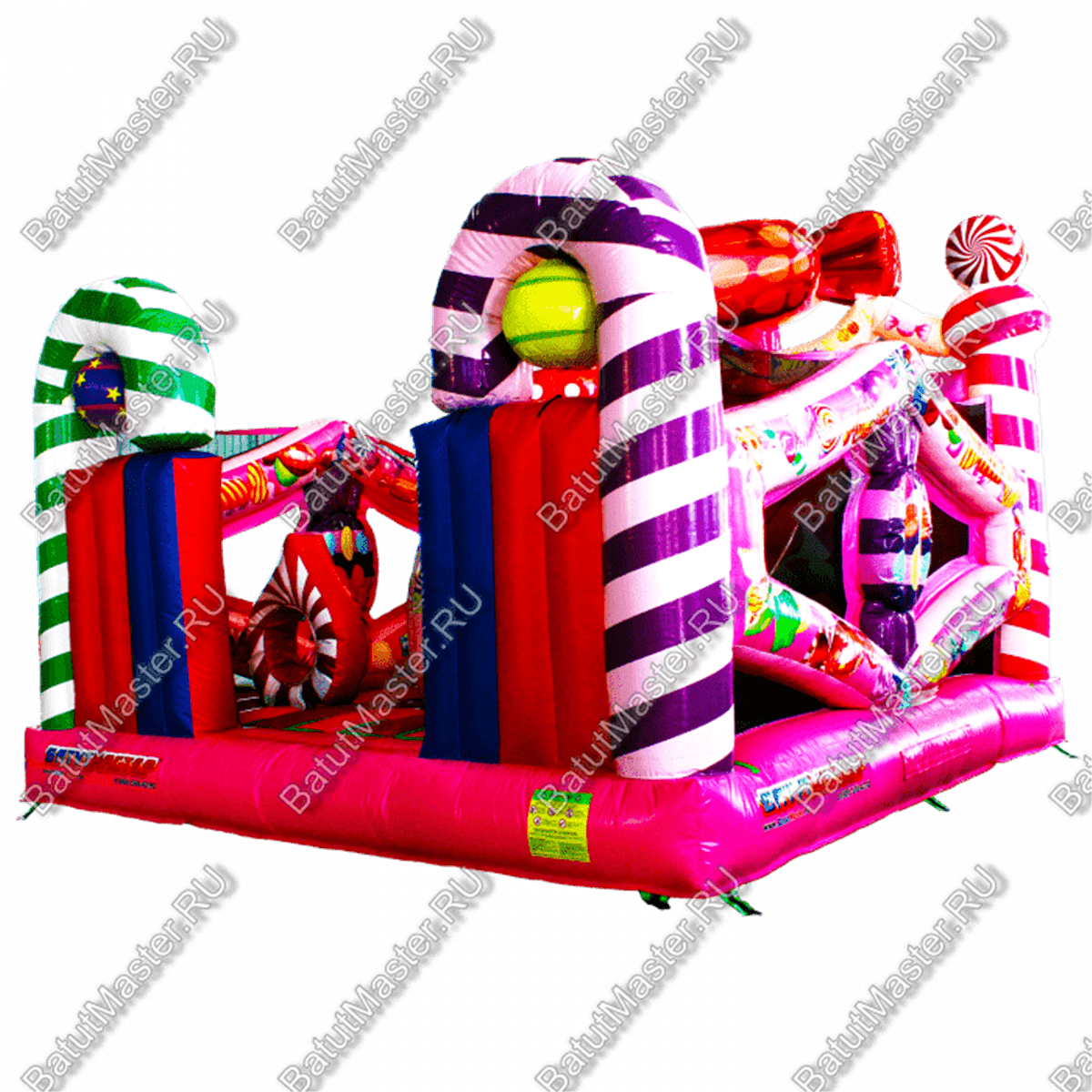 Зайдя внутрь батута, дети окажутся в настоящем сладком королевстве. Все игровые фигуры также выполнены в виде различных сладостей. Бегая среди больших конфет и пирожных, дети будут в восторге. Большинство игровых фигур имеют отверстия, сквозь которые можно ползать.