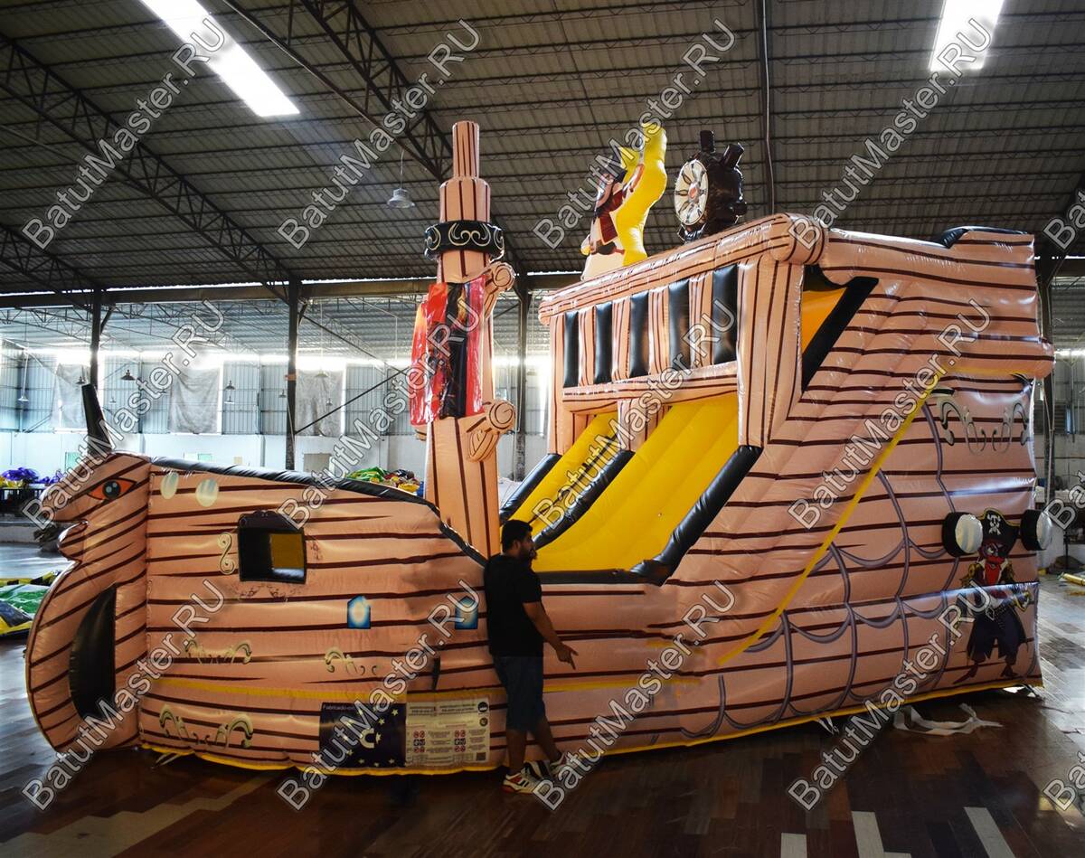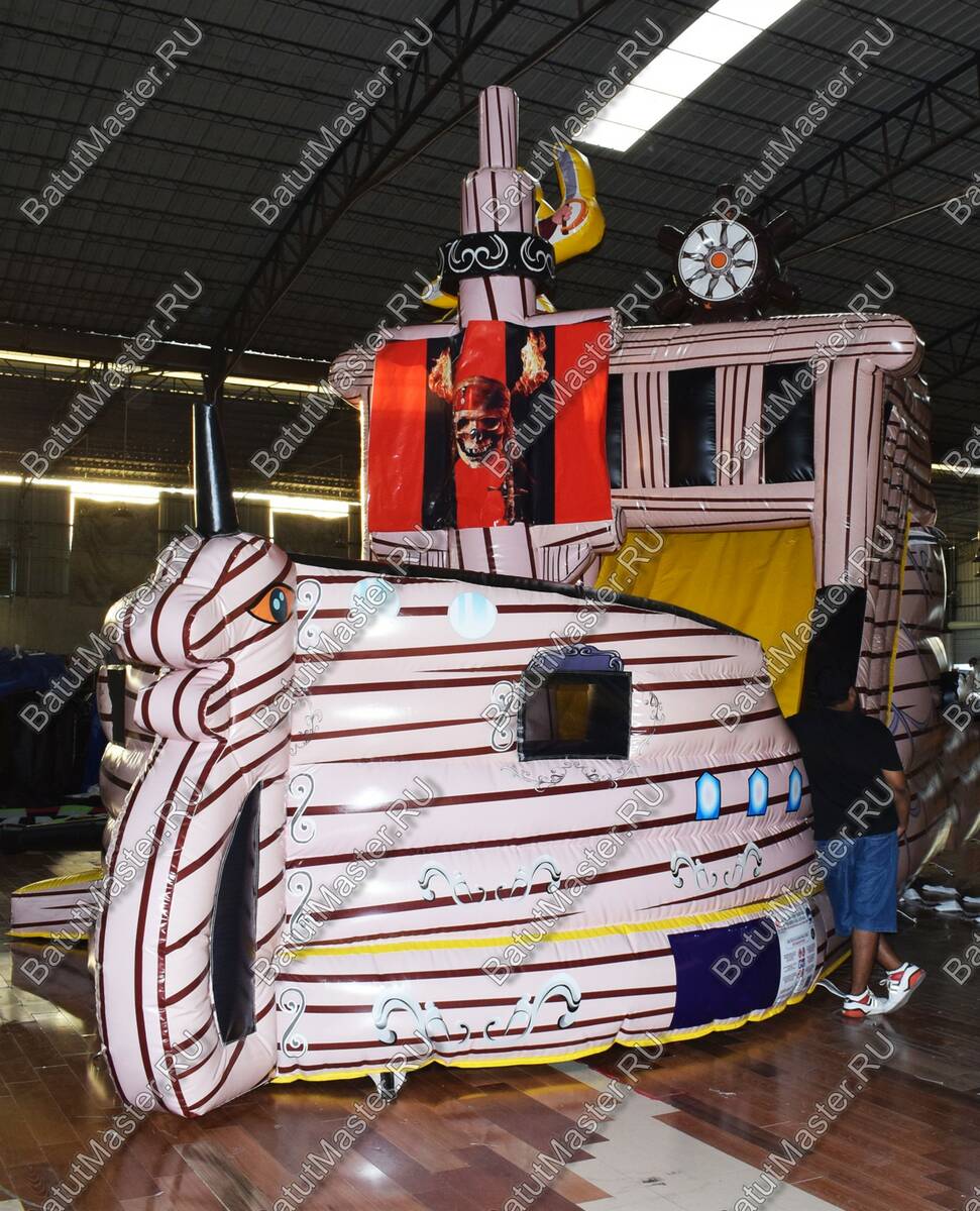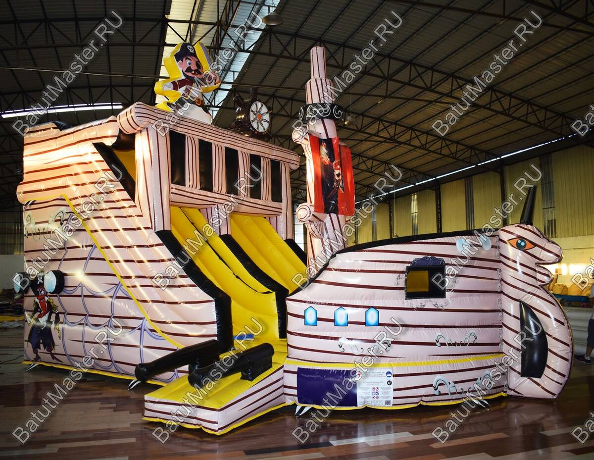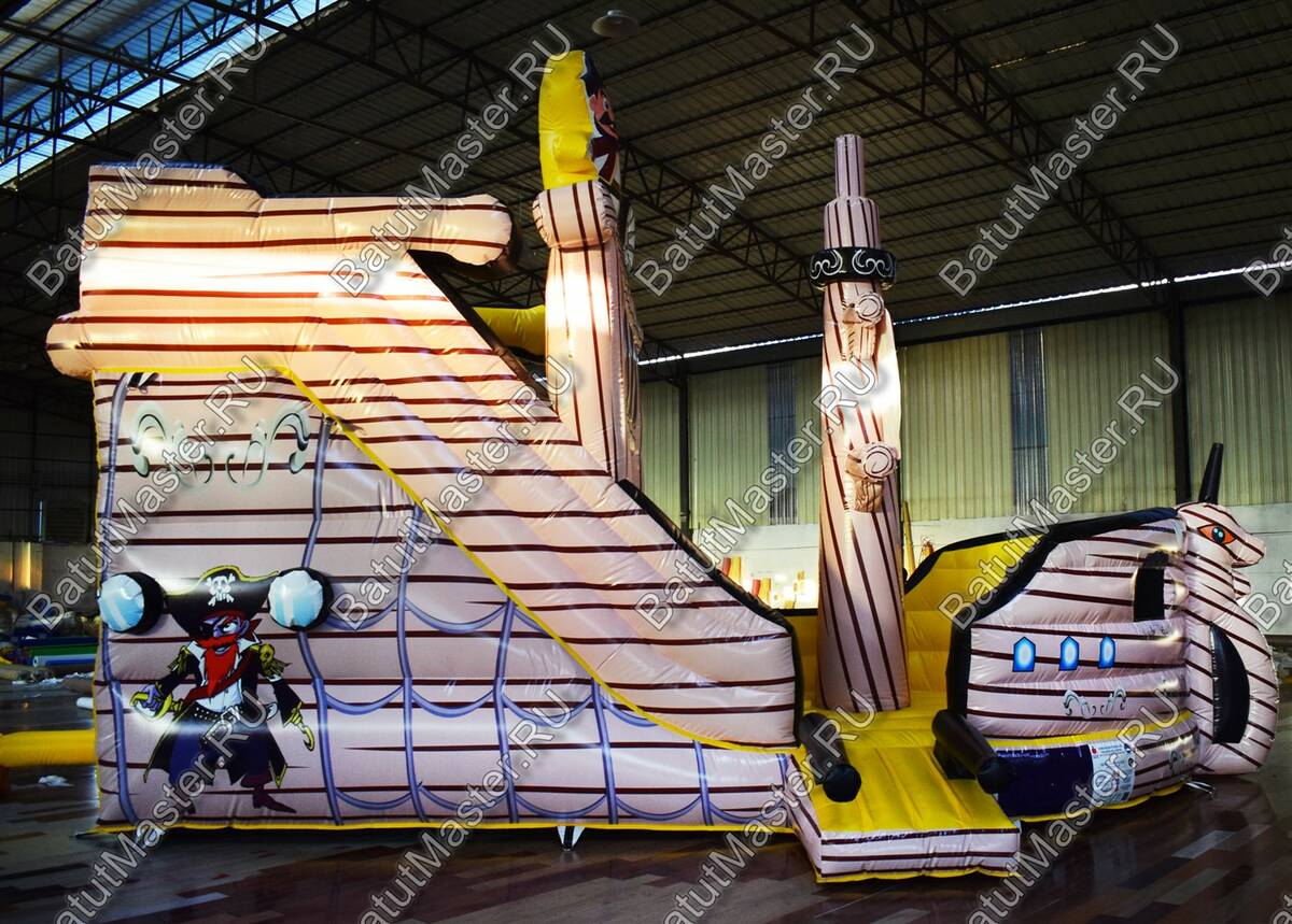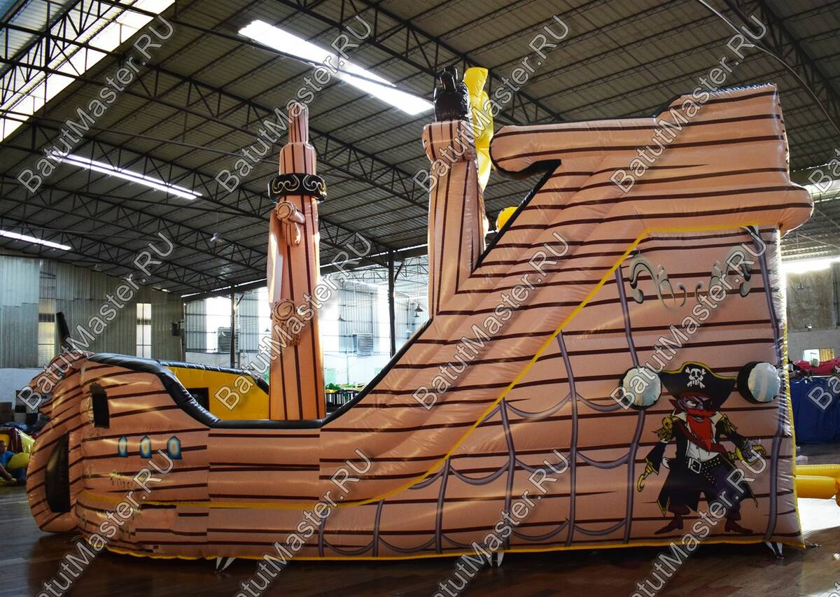 Каждому ребенку наверняка станет интересно, узнать подробнее, что представляет из себя корабль. Надувной батут в данной модификации представляет собой судно пиратского корабля, где можно не только узнать много интересного, но и весело провести время. Здесь есть несколько высоких горок, подъем с мягкими ступеньками, а также большое поле для прыжков и других подвижных игр. На горке стоит надувной пират, а посередине комплекса – пиратский флаг.