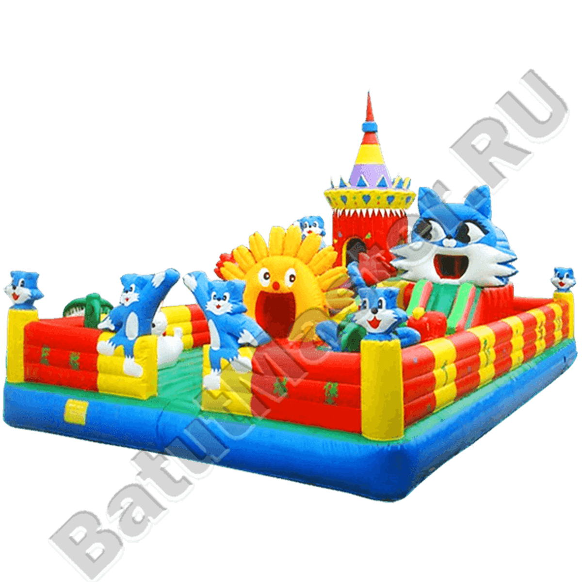 «Кошкин дом» - хороший надувной батут с высоким желто-красным забором по периметру. При входе и внутри площадки находятся мультяшные кошки, одни из которых весело машут лапами, встречая гостей, другие - играют роль препятствий и декораций.