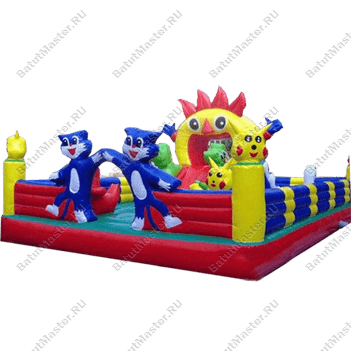 Внутри батута для бизнеса детей ждет несколько игровых фигур в виде желтой кошки и красной утки, сзади расположены круглые игровые лазы красно-синего цвета. Учитывая небольшие размеры всех фигур, простоту конструкции и сплошное защитное ограждение по периметру, можно предположить, что батут предназначен для детей младшего возраста, хотя просто попрыгать и покувыркаться здесь смогут ребята и постарше.