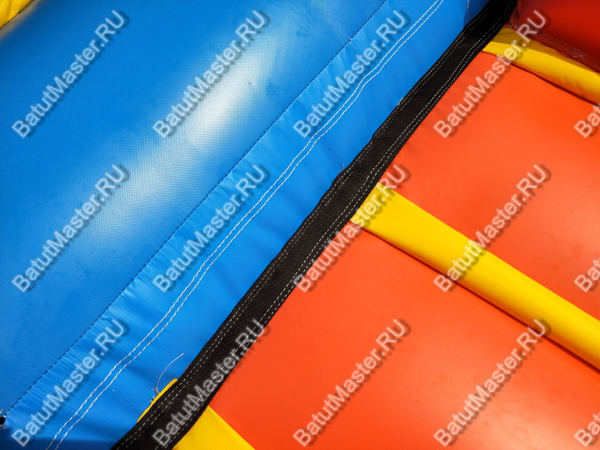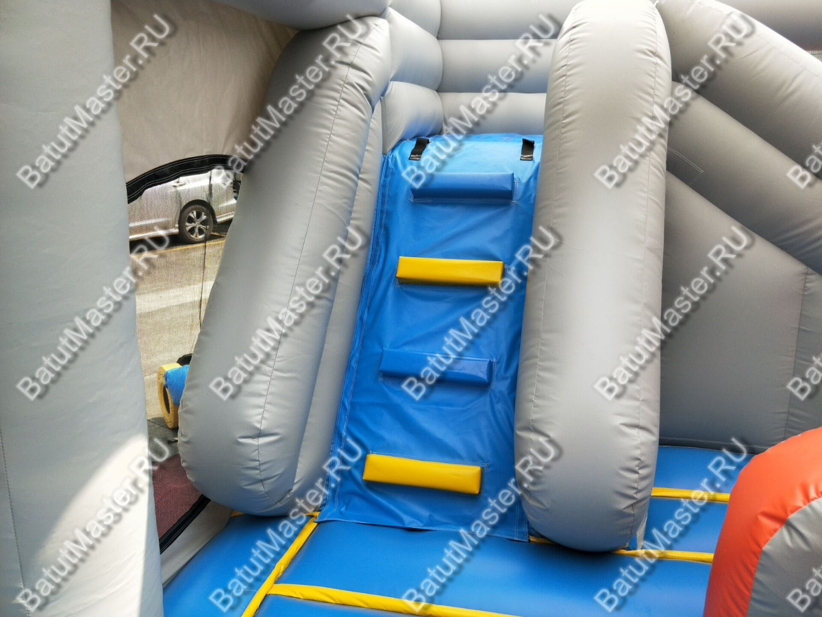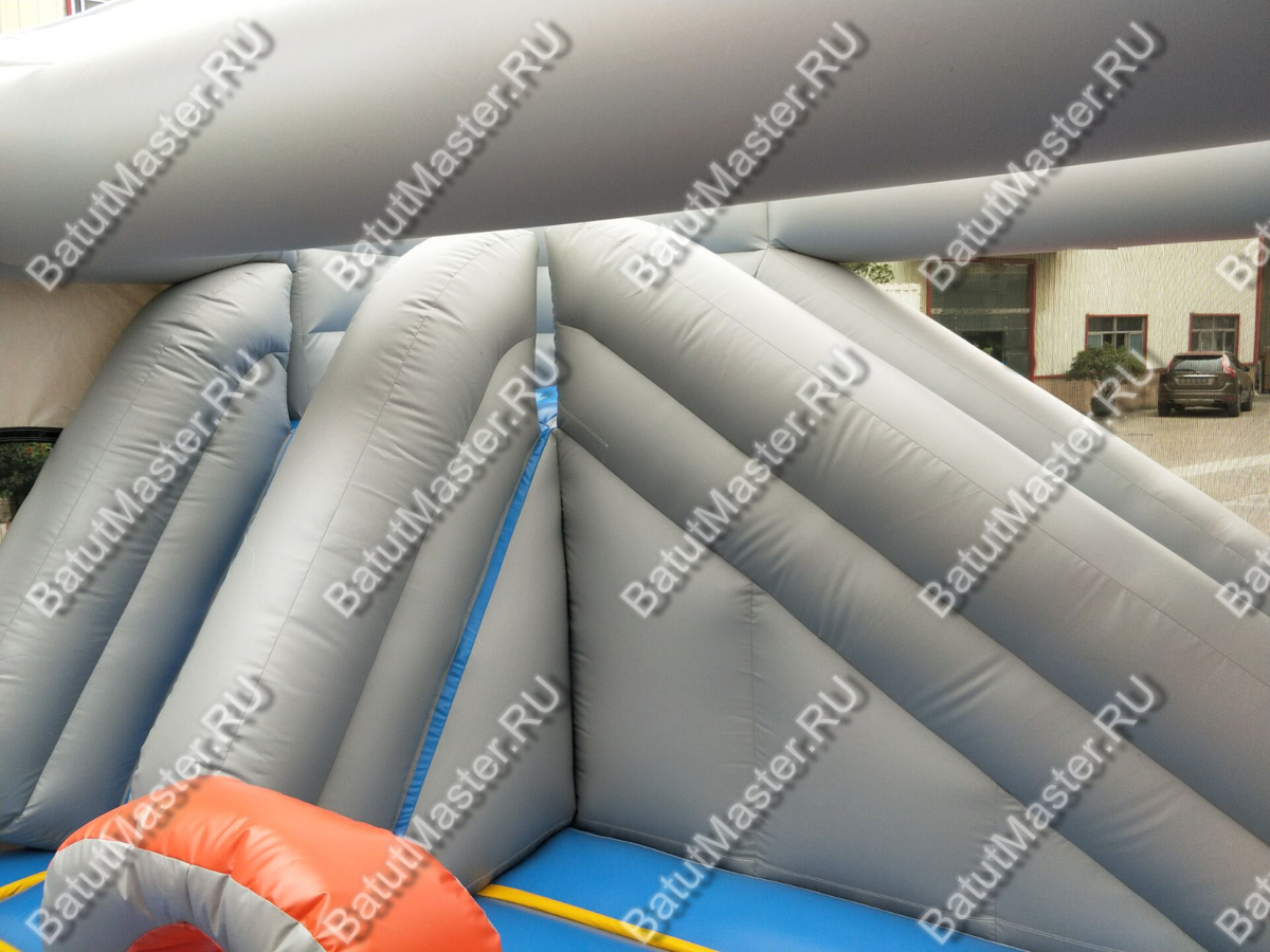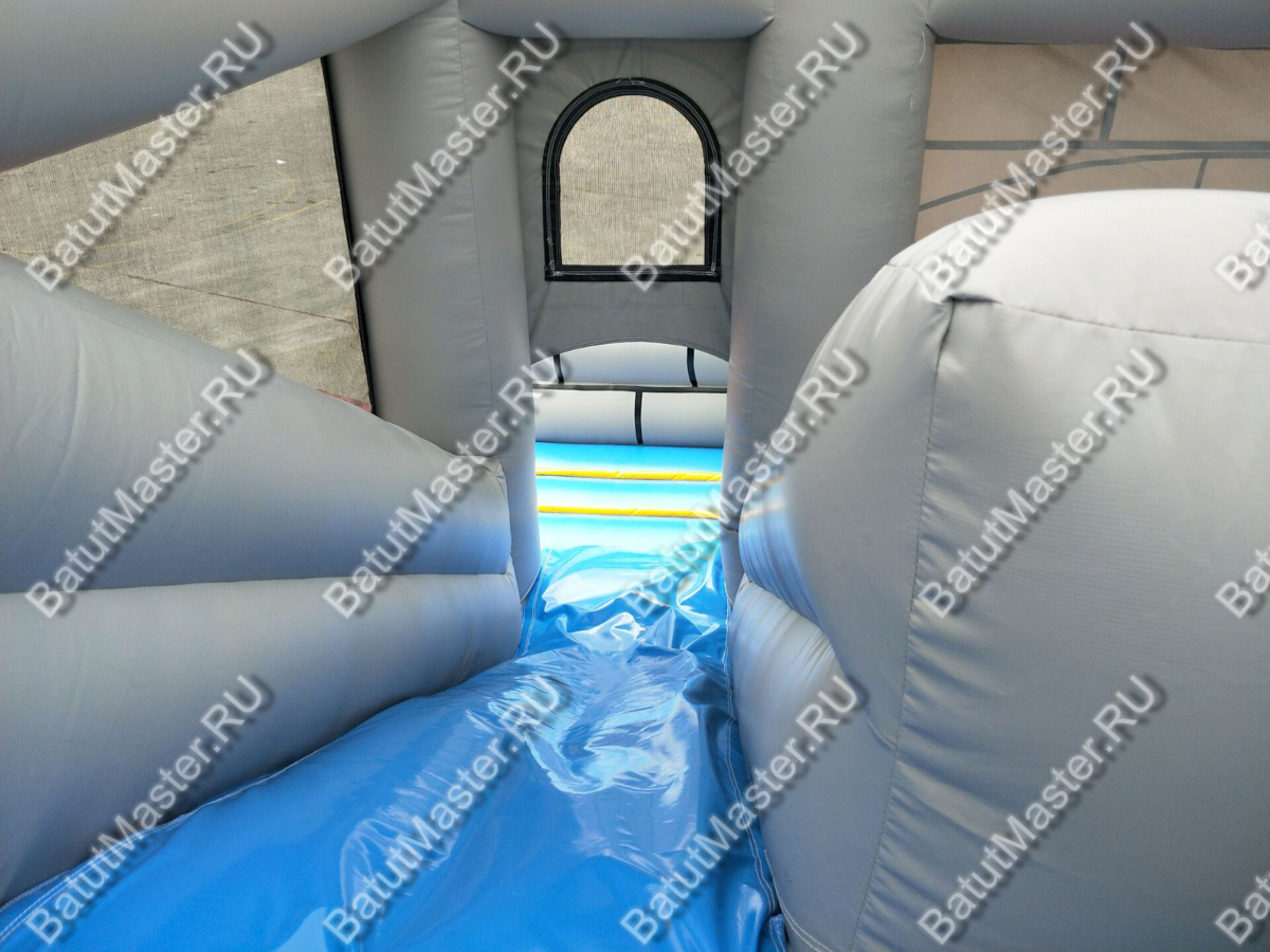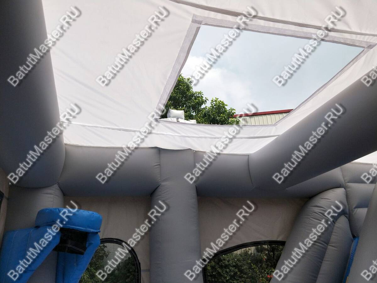 Внутри батута детей ждут игровые фигуры и небольшая горка, которая выходит наружу конструкции. Также есть место для активных игр, прыжков и бега.