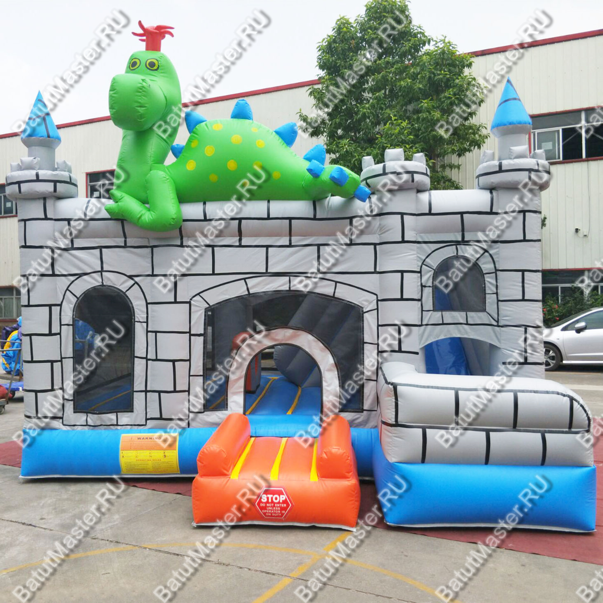 Внешний вид батута завораживает взгляд, и ни один ребёнок не останется равнодушным к настоящей надувной крепости, ну, и, конечно, огромного зелёного дракона. Вся конструкция выполнена в виде замка: присутствуют декоративные башенки и бойницы, окна и арочные ворота. Принт на батуте представлен в виде кирпичной кладки, что ещё больше взбудоражит воображение детей. Над всей конструкцией возвышается фигура большого зелёного дракона, который охраняет крепость. Это главная фишка аттракциона.
