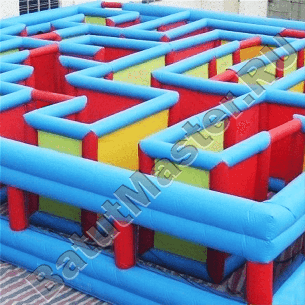 Коммерческий надувной батут «Лабиринт» выполнен из надувных столбов и перегородок синего, красного и желтого цвета. Вся плоскость игровой зоны разделена на дорожки и преграды, внешние стороны надувного лабиринта обтянуты плотной полупрозрачной сеткой, чтобы детки, заблудившись внутри, не испугались.