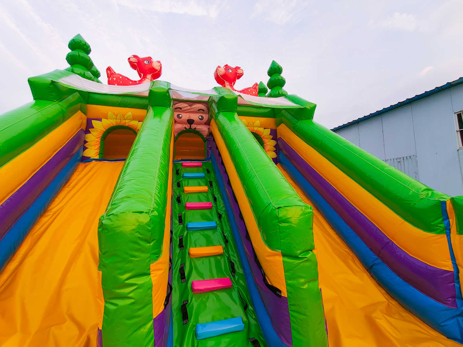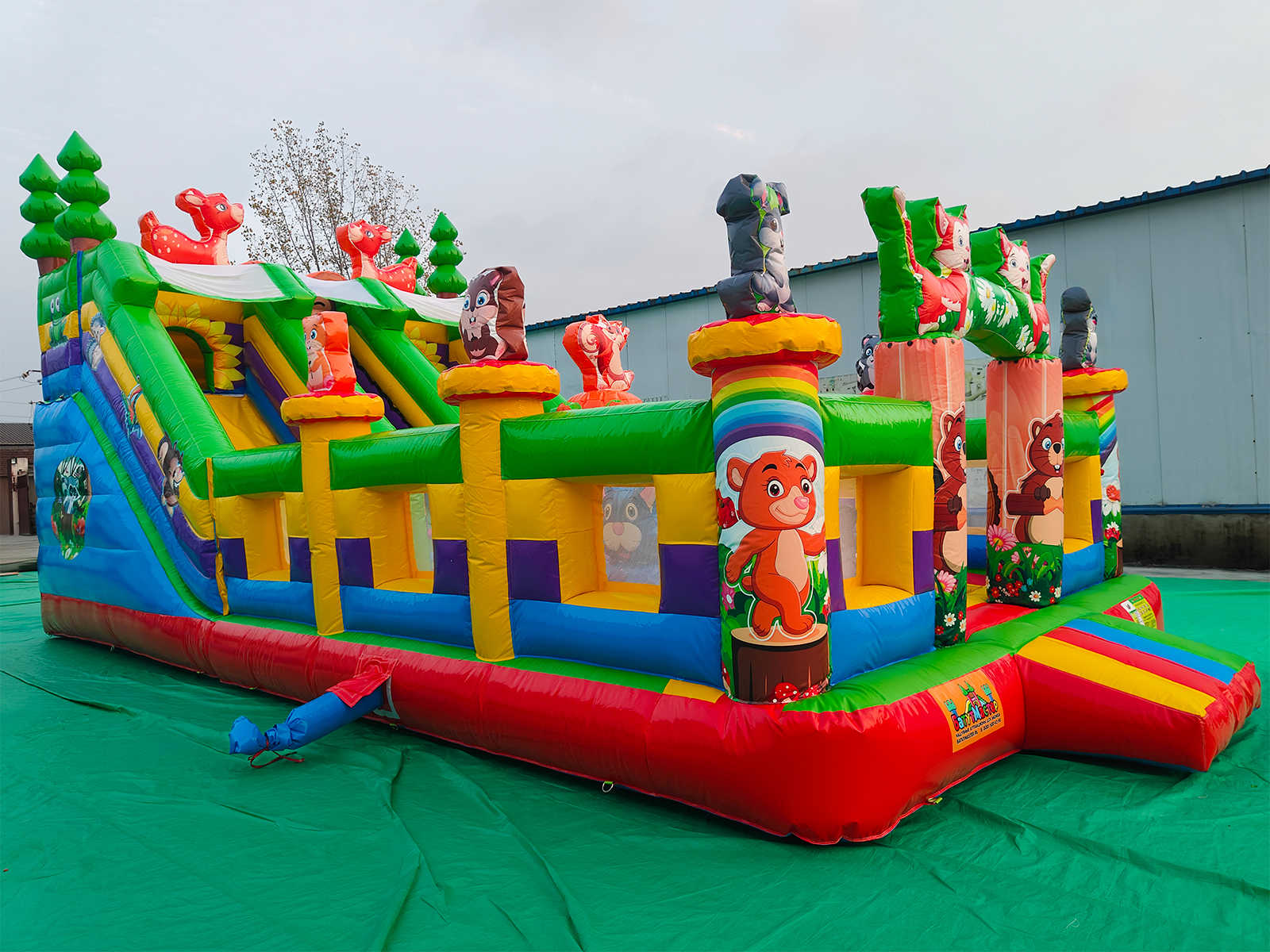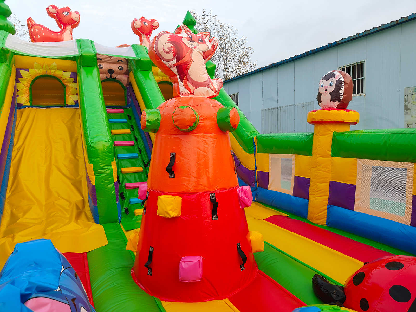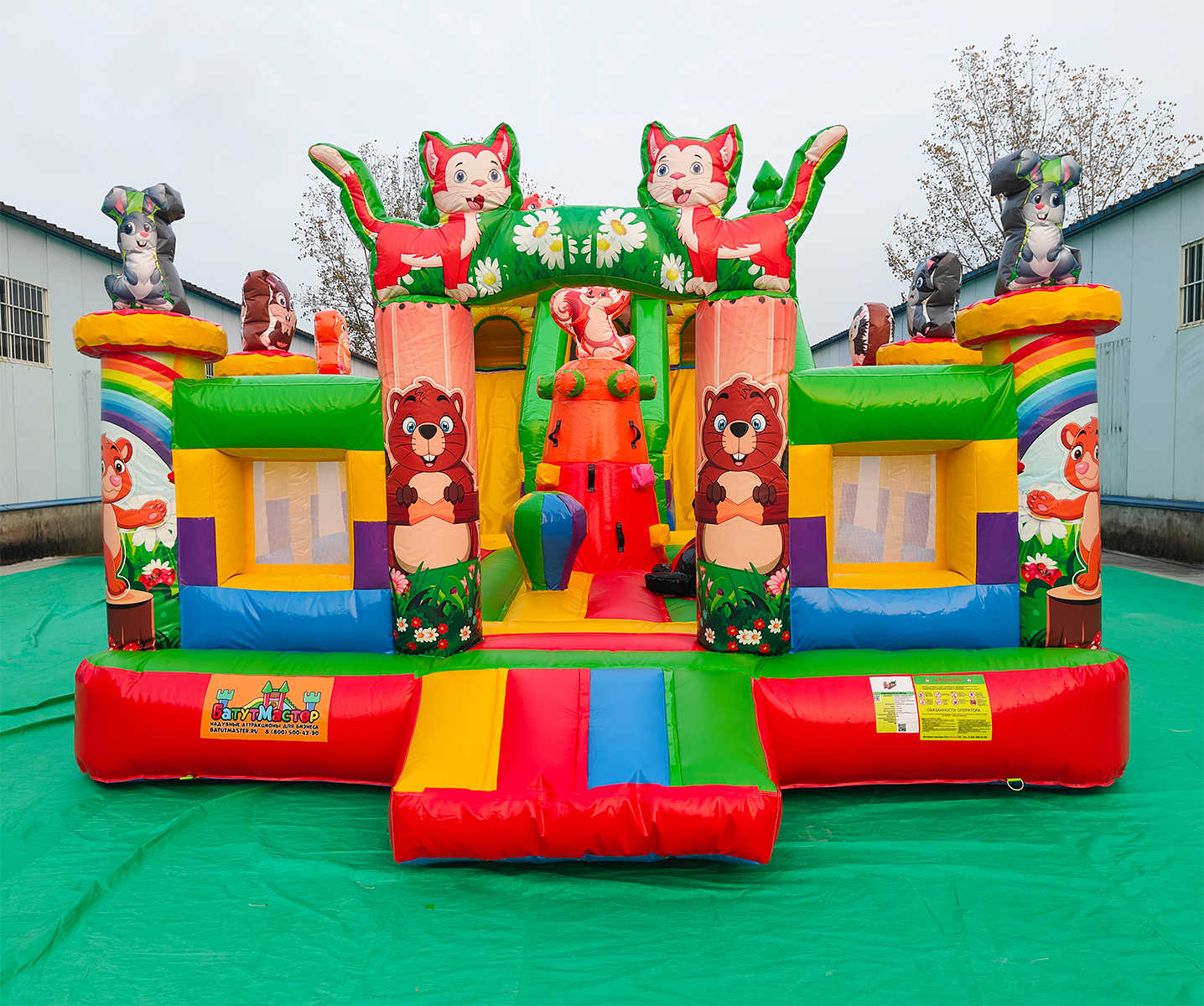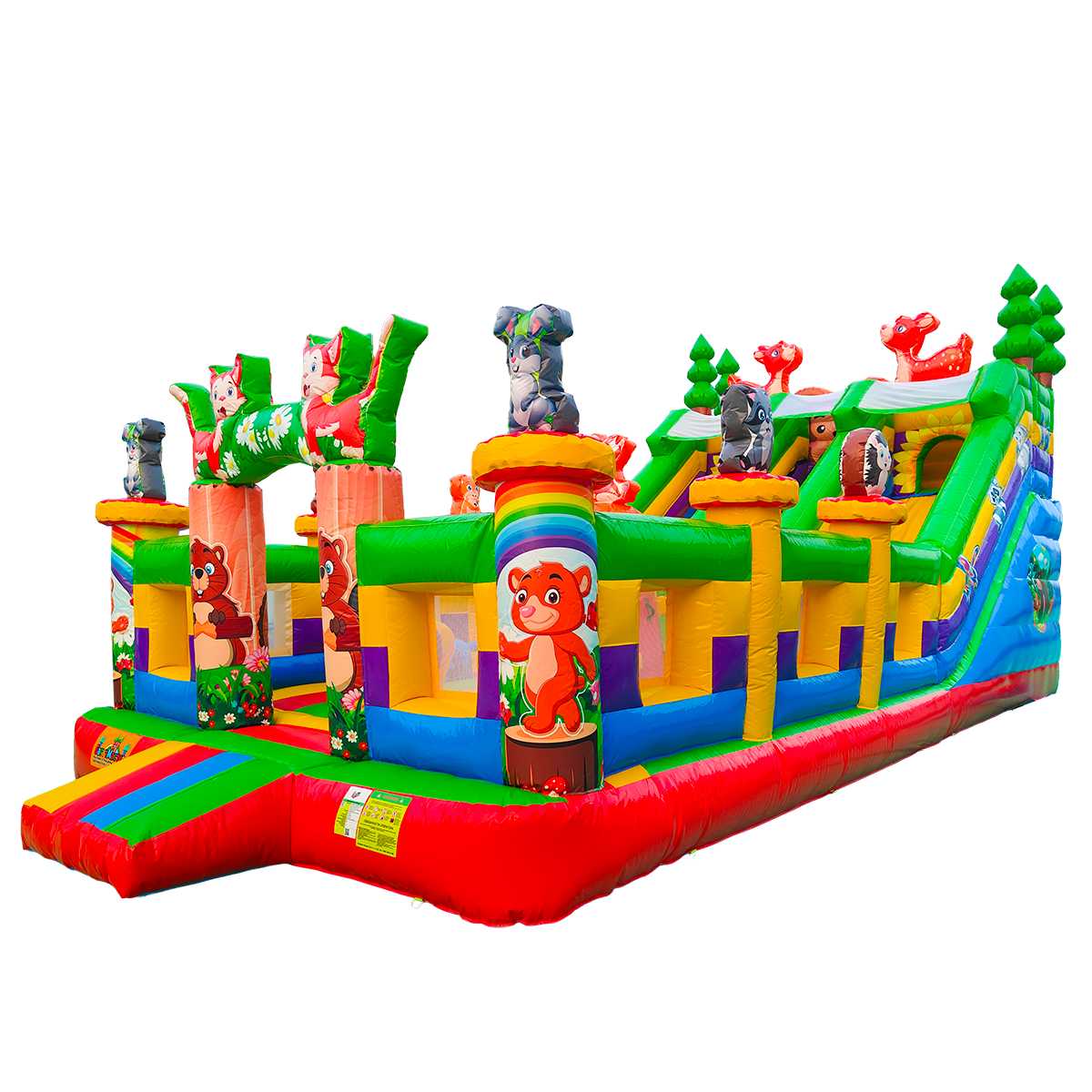 Коммерческий надувной батут «Лесная команда» – это полноценный игровой центр площадью 50 м², оформленный в тематике джунглей и дружелюбных лесных зверей. Его яркое оформление в зелёных, красных, жёлтых и синих тонах моментально привлекает внимание детей и превращает любую площадку в мир веселья и движения. На его территории дети могут прыгать, бегать, преодолевать мягкие препятствия, взбираться на мини-скалодром и скатываться с безопасной горки.