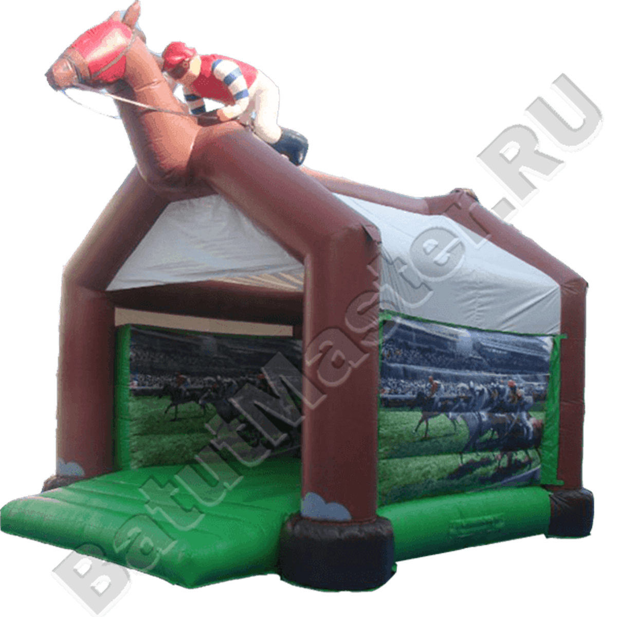 Батут с тентом в виде огромной лошади и надувного наездника сверху– креативно и свежо. Тем более что даже те, кто не знаком с ипподромом или не любит езду на лошадях, сможет насладиться замечательными фото на стенах. Они просто напечатаны на полотне ПВХ и надуты. Оттуда Вы и поймете, какие бывают скачки на самом деле. Ваш малыш обязательно проявит желание стать таким же «мастером-наездником».