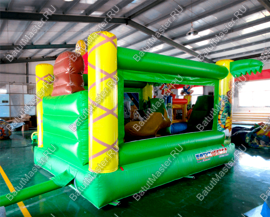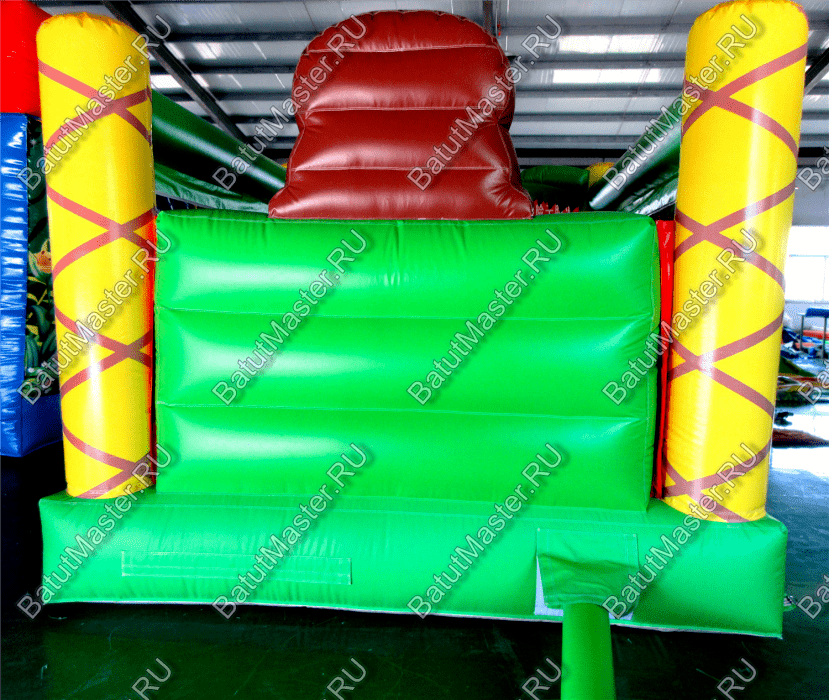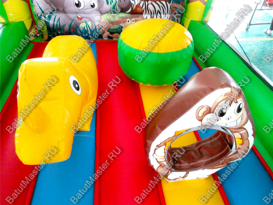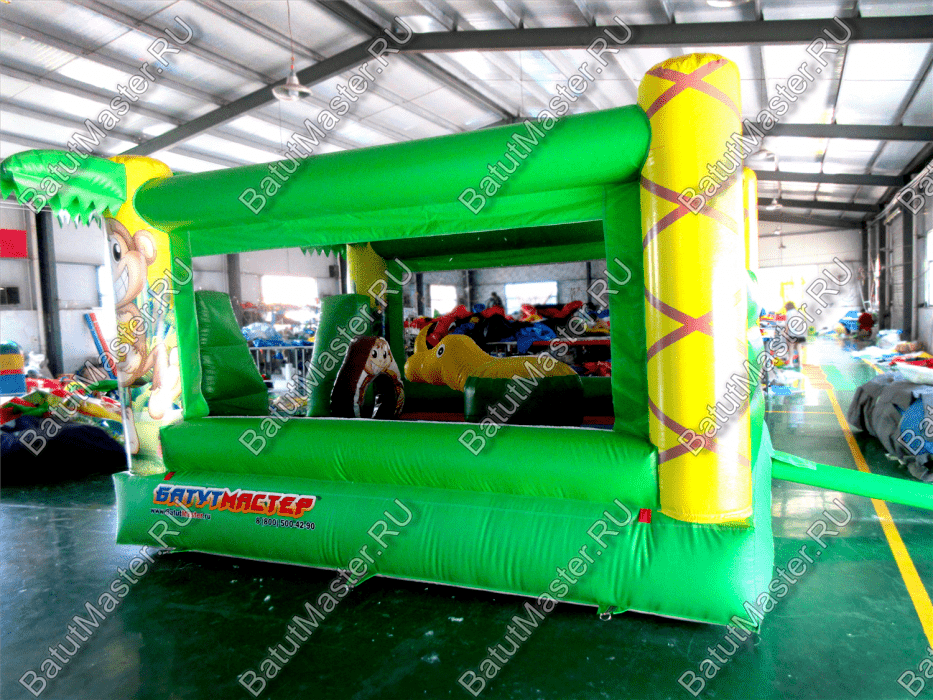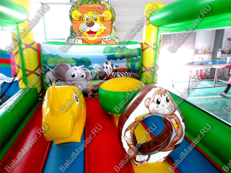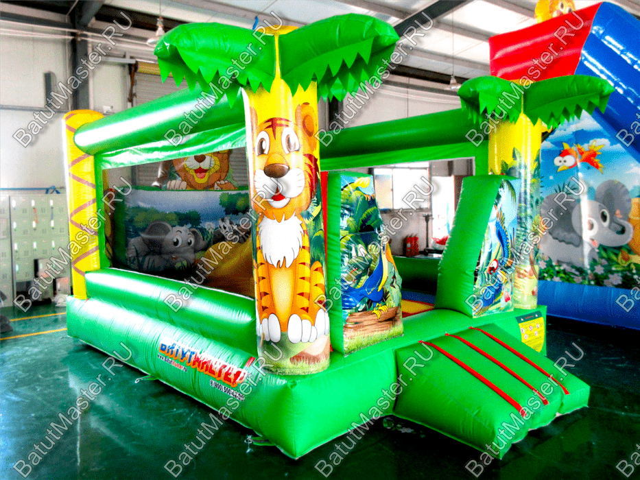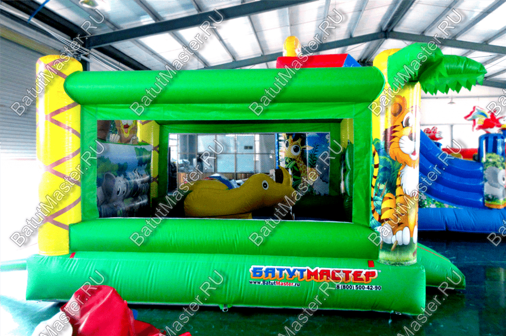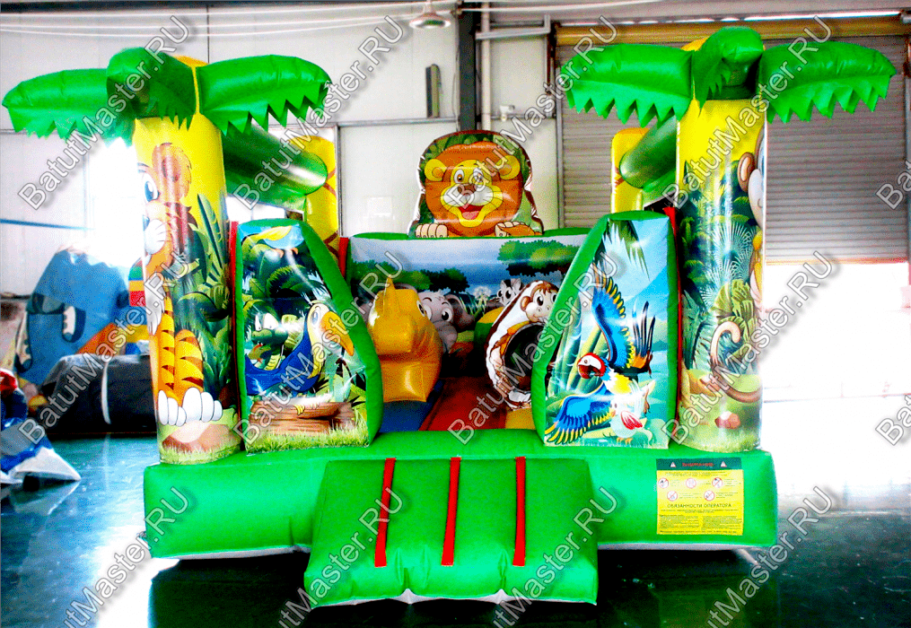 Преобладающий цвет в конструкции – зеленый. Дизайн батута очень напоминает мир джунглей, поэтому на фасадных колоннах в виде пальм изображены тигренок и обезьяна, а внутри площадки есть рисунок с зеброй и слоном. Над задней стенкой установлена фигура веселого льва. Боковые стены аттракциона создаются при помощи сетки. Фасад – свободный проем на всю стенку, украшенный двумя надувными фигурами, на которых красуются изображения ярких птиц.