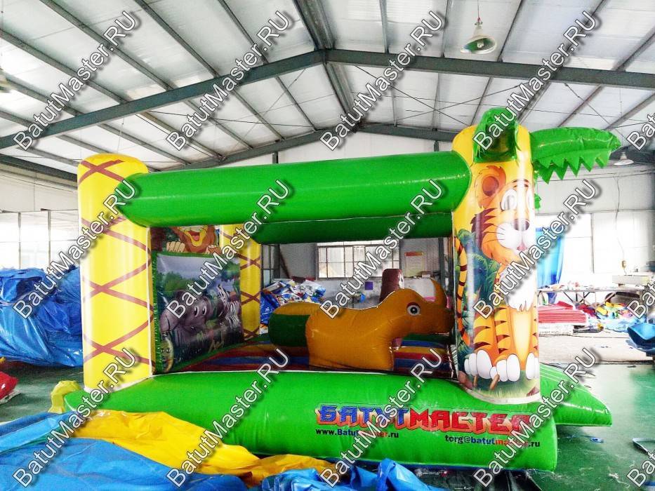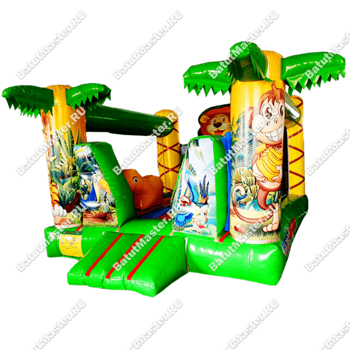 Надувной батут по доступной цене может стать лучшим предложением для вас, если вы ищете бюджетный проект для бизнеса. Основание аттракциона – надувная площадка квадратной формы с небольшой подушкой безопасности на входе. Боковые стены изготовлены из сетки, которая прочно крепится к надувным желтым колоннам, изготовленным в виде пальм. Такие стены позвояют циркулировать воздуху и удобно следить за играми детей. Вход в батут не имеет четких линий, но на этом участке установлены 2 надувные фигуры с изображениями ярких птиц. Задняя стена – сплошной надувной элемент с рисунком слона и зебры, а также с надувной фигурой львенка, будто выглядывающего из-за стенки.