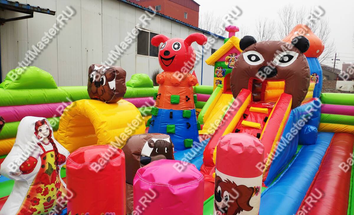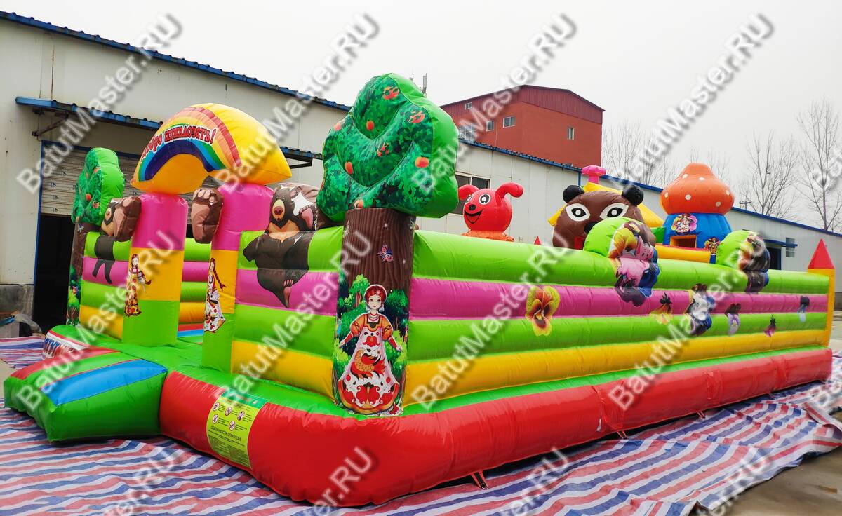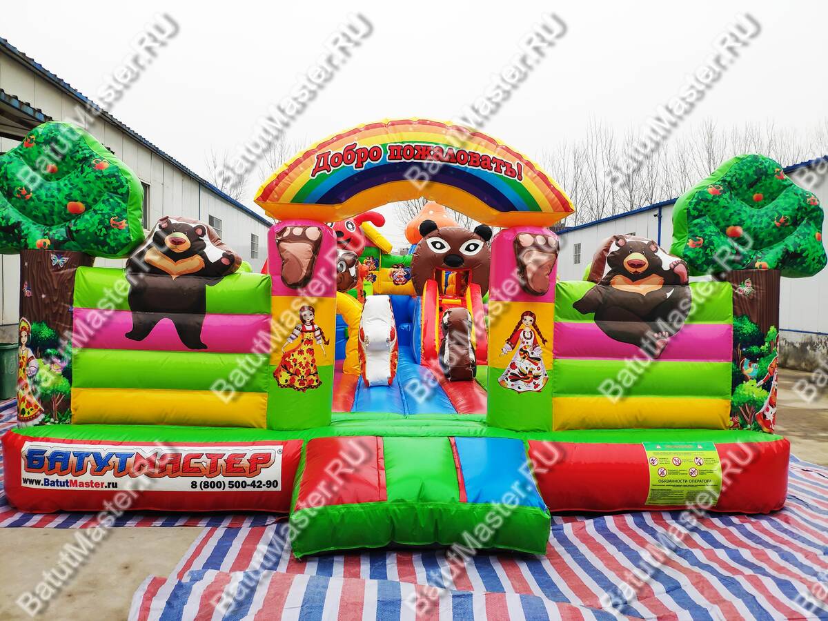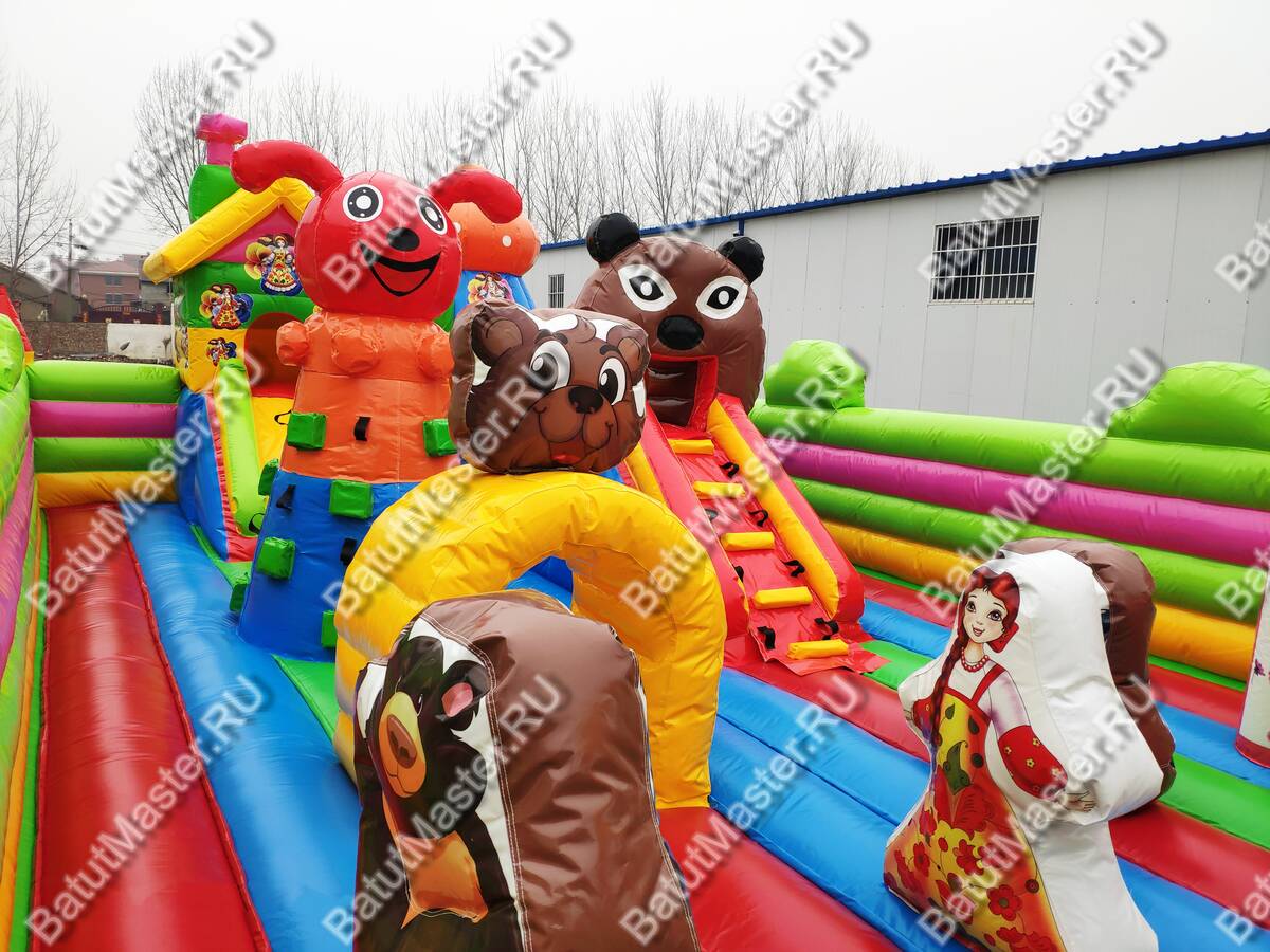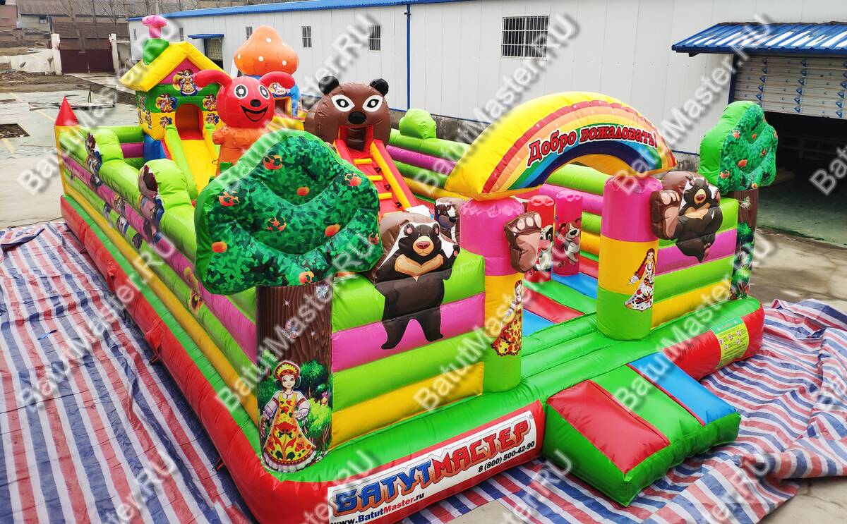 Здесь все похоже на сказку, которую родители на ночь обычно читают детям. Вход надувного батута коммерческого украшен изображениями мишки и Маши, а по бокам стоят колонны, выполненный в виде деревьев. Для бизнеса - это замечательный вариант. Коммерческий надувной батут для бизнеса оснащен горками, одна из которых трансформирована в домик, а сверху второй размещена голова мишки. Все вокруг яркое и невозможно оторвать глаз. Что касается безопасности, то тут она на должном уровне. Окошки здесь отсутствуют, зато вход широки и детей с легкостью смогут увидеть родители.