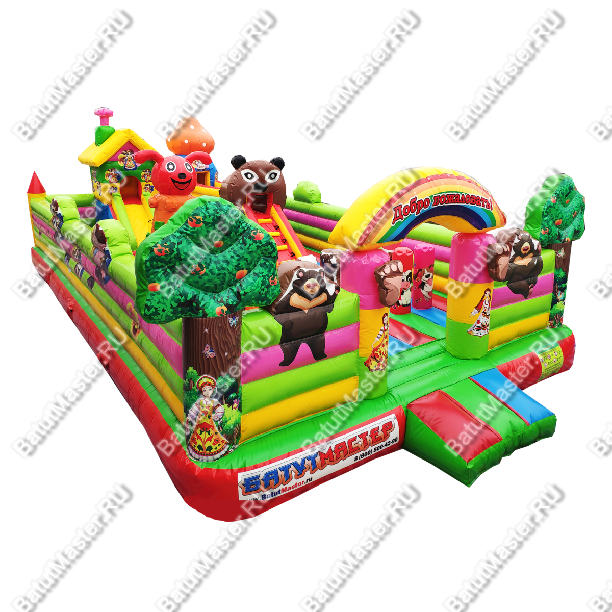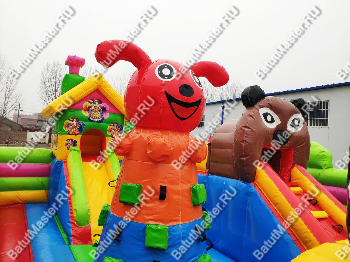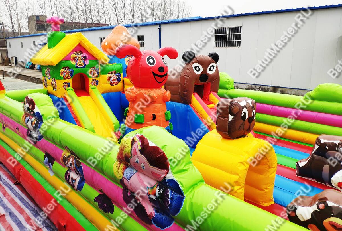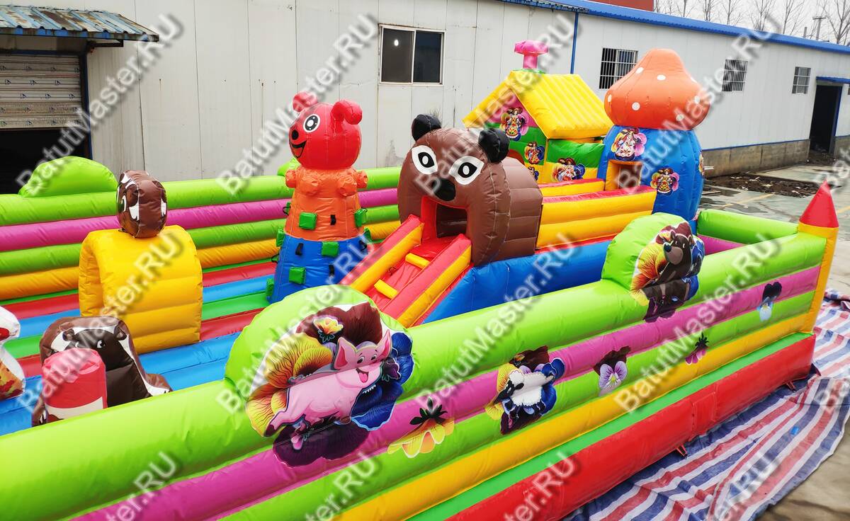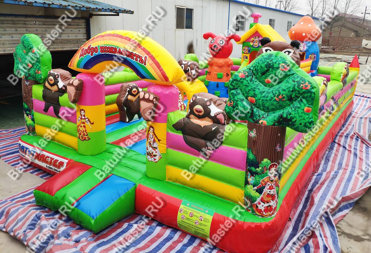 Здесь все похоже на сказку, которую родители на ночь обычно читают детям. Вход надувного батута коммерческого украшен изображениями мишки и Маши, а по бокам стоят колонны, выполненный в виде деревьев. Для бизнеса - это замечательный вариант. Коммерческий надувной батут для бизнеса оснащен горками, одна из которых трансформирована в домик, а сверху второй размещена голова мишки. Все вокруг яркое и невозможно оторвать глаз. Что касается безопасности, то тут она на должном уровне. Окошки здесь отсутствуют, зато вход широки и детей с легкостью смогут увидеть родители.