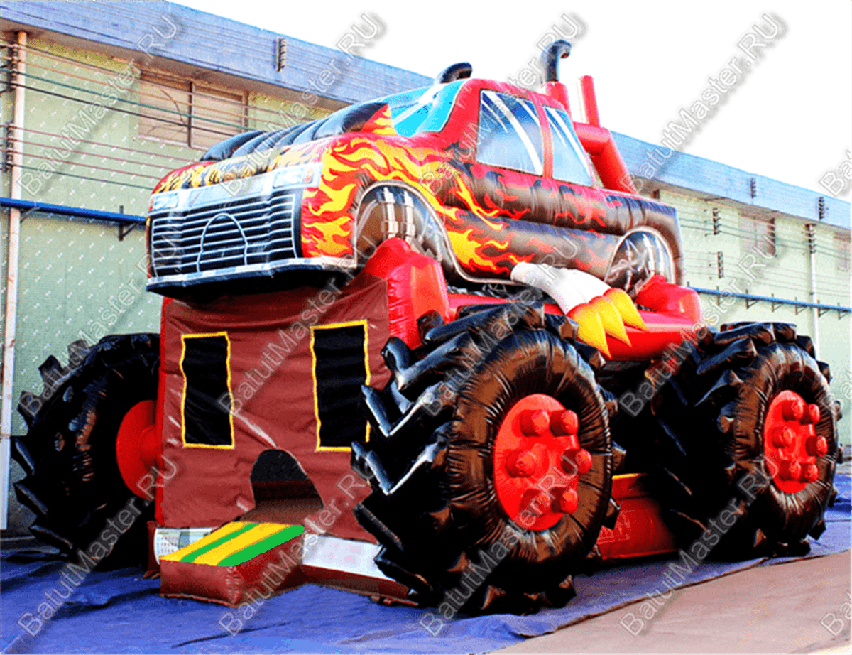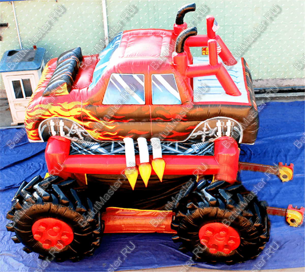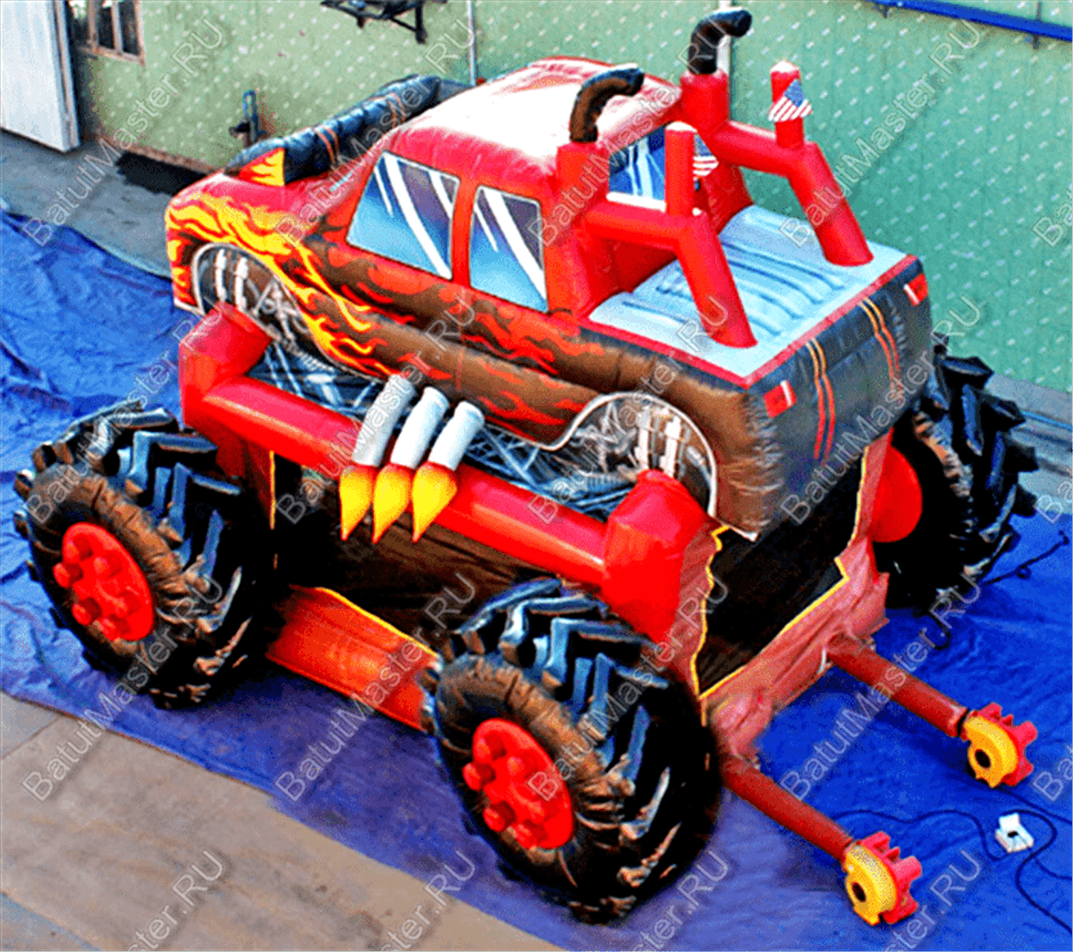 Коммерческий надувной батут «Машина монстр» поразит своим внешним видом, как мальчишек, так и девчонок, а также и их родителей. Такого громадного монстра можно заметить ещё издалека. Огромный красный джип с пламенной окраской возвышается над корпусом батута. Джип стоит на громадных чёрных колёсах, и дети смогут не только увидеть их, но и потрогать. У джипа есть и ещё одна особенность, от которой дети придут в восторг, – трубы с вырывающимся пламенем.