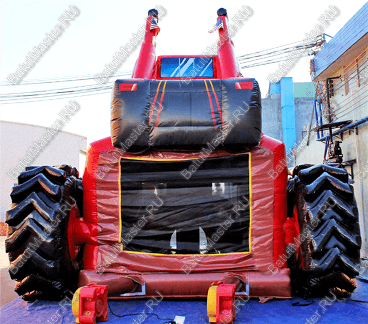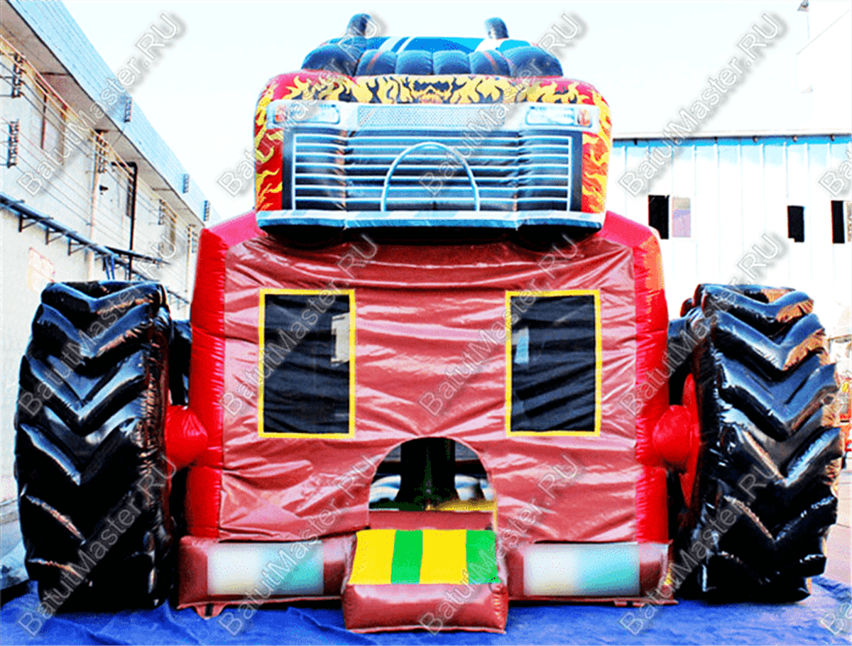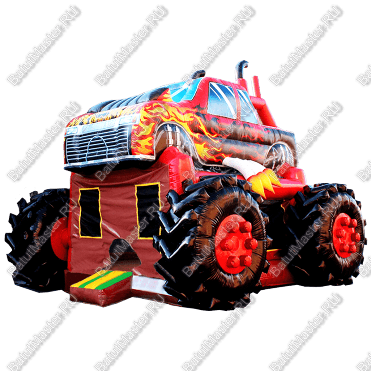 Коммерческий надувной батут «Машина монстр» поразит своим внешним видом, как мальчишек, так и девчонок, а также и их родителей. Такого громадного монстра можно заметить ещё издалека. Огромный красный джип с пламенной окраской возвышается над корпусом батута. Джип стоит на громадных чёрных колёсах, и дети смогут не только увидеть их, но и потрогать. У джипа есть и ещё одна особенность, от которой дети придут в восторг, – трубы с вырывающимся пламенем.