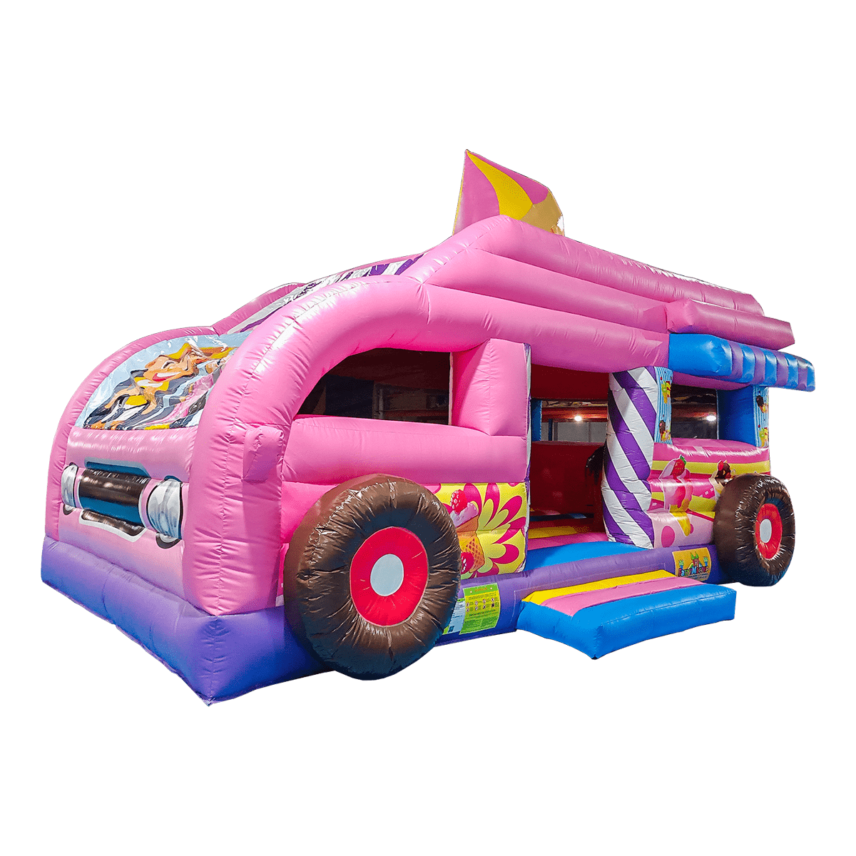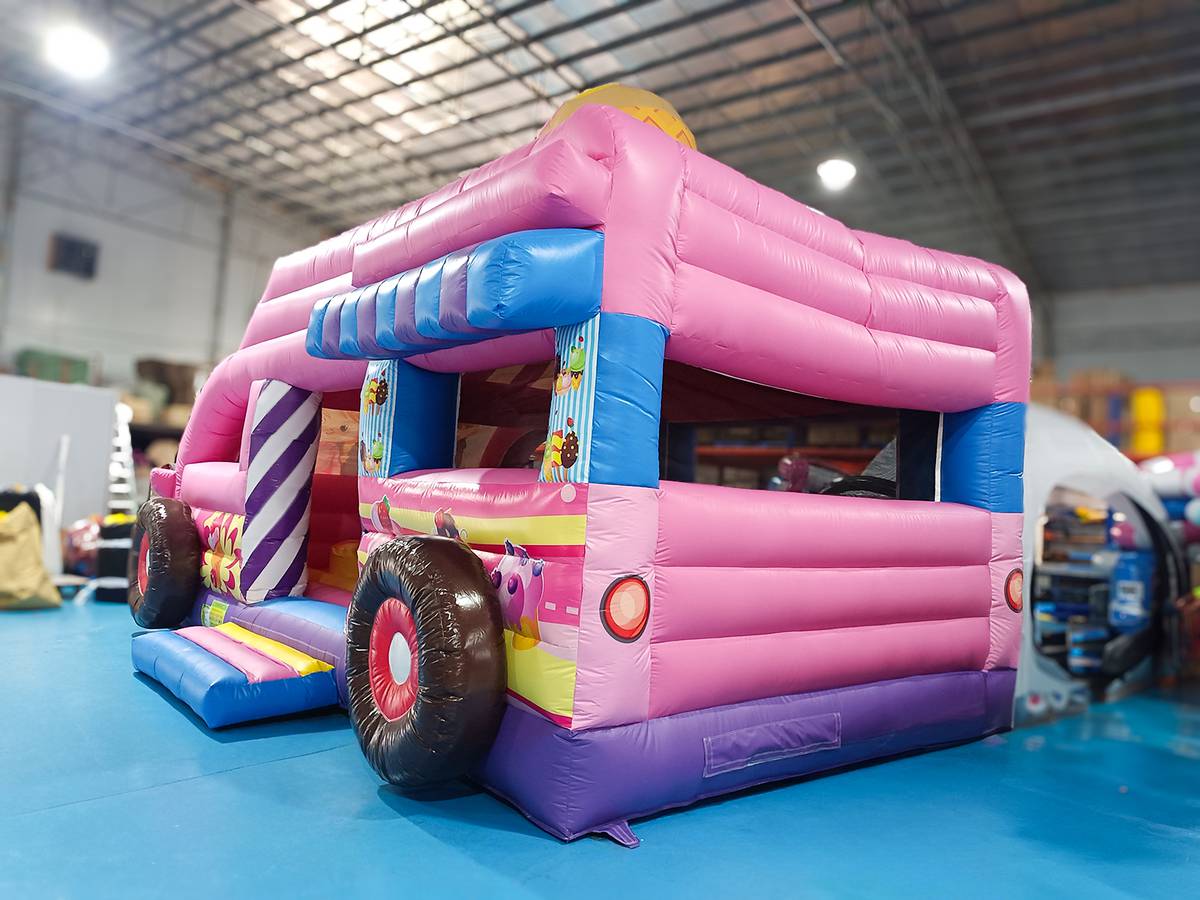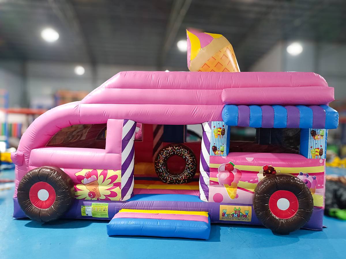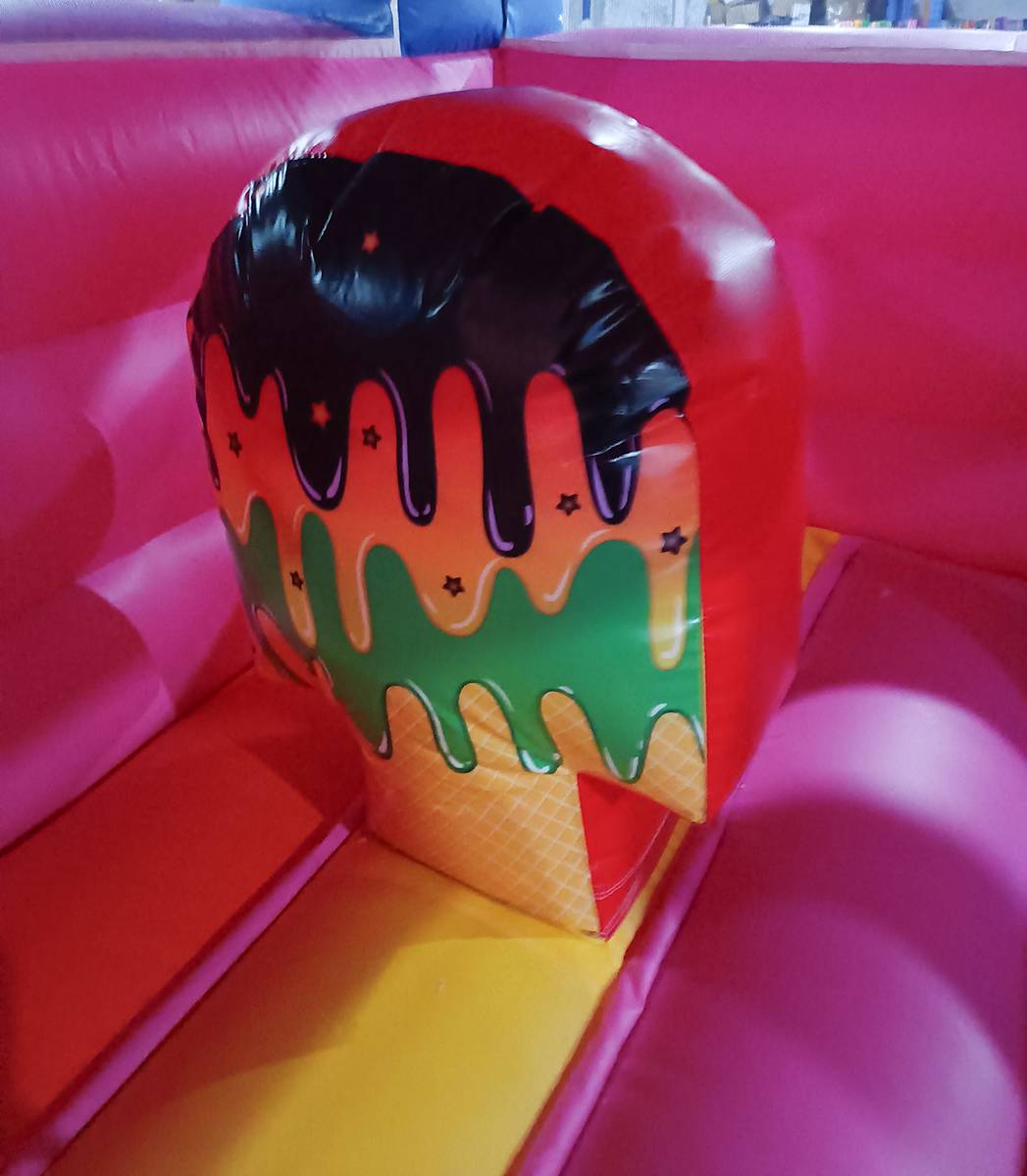 Этот яркий батут действительно можно назвать «вкусным», радостным и веселым. Настоящая батут-машина в розовых тонах станет увлекательным развлечением для ваших детей. Основная особенность заключается в том, что сверху надувной крыши размещается огромное мороженое-рожок, оно еще больше привлекает малышей посетить заманчивый аттракцион.