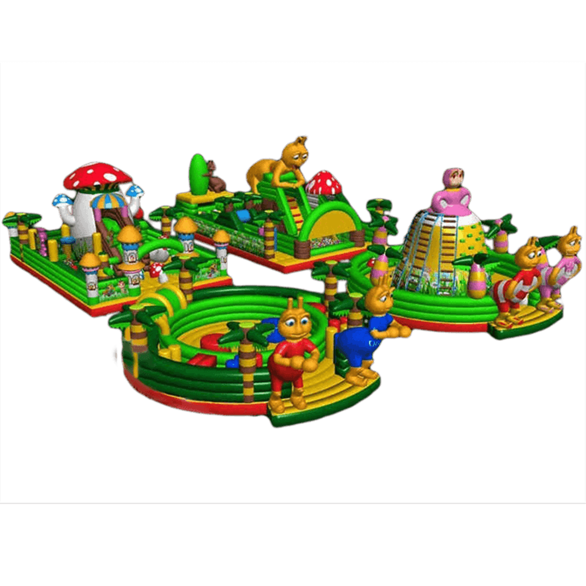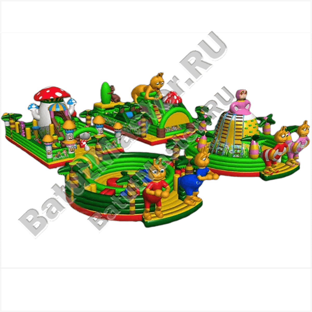 В качестве аксессуаров для оформления игрового городка применяются пчелки, их фигурками украшены входы в батуты, а изображения насекомых нанесены по всей поверхности отдельных деталей. В комплексе представлено много игровых элементов, а разнообразие составных частей городка обеспечивает высокую вместимость посетителей за один раз. Один такой батут заменяет целый парк развлечений, поэтому для ведения бизнеса данная модель будет очень кстати.