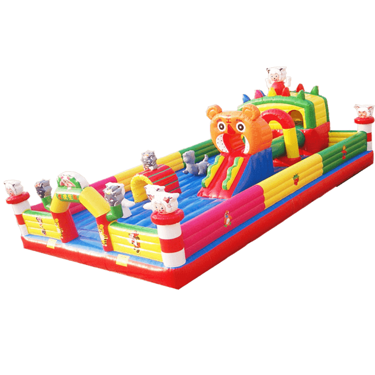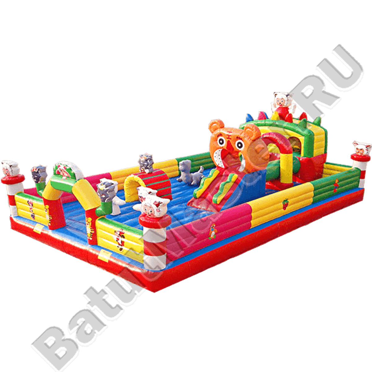 Все горки невысокие, с пологим спуском, снабженным бортиком для защиты от получения травм. Они окружены дополнительными надувными элементами декора, привлекающими посетителей и видимыми далеко за пределами батута.