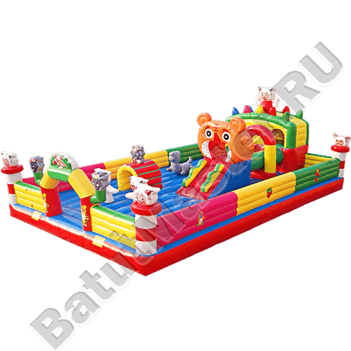 В центре мягкой подушки установлена невысокая горка в виде надувной головы медведя, поэтому чтобы спуститься вниз, придется побывать на стартовой площадке в виде пасти медведя. В задней части коммерческого комплекса размещена горка с закрытой стартовой площадкой, где дети могут играть, отдыхать и прятаться от дождя, ветра или солнца. И хотя аттракцион не имеет высоких или сложных элементов, он будет интересен для любой возрастной категории детей. Для более комфортного досуга над конструкцией может быть установлен навес, в этом случае материал не будет так накаляться, а сам батут будет защищен от попадания в него крупного мусора.