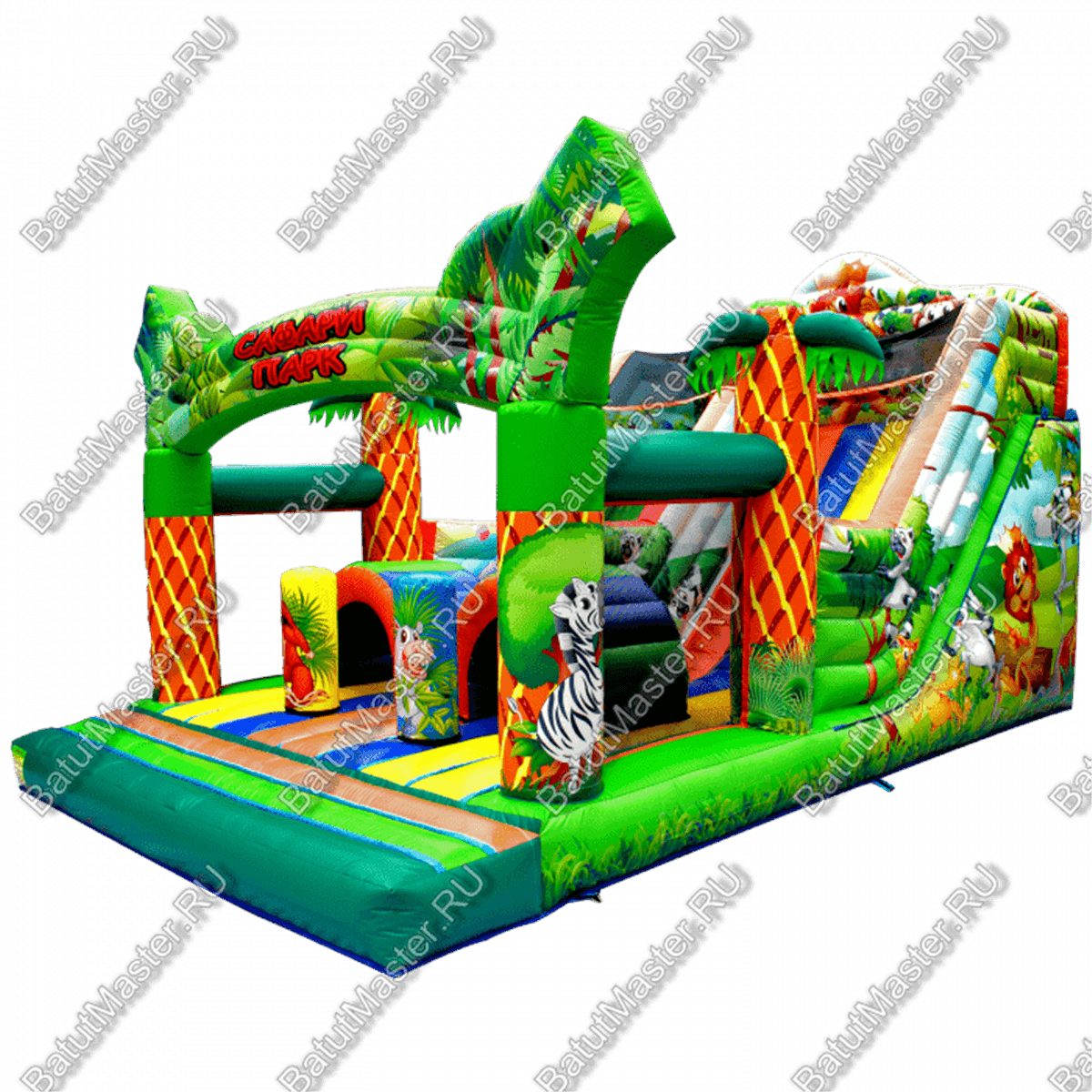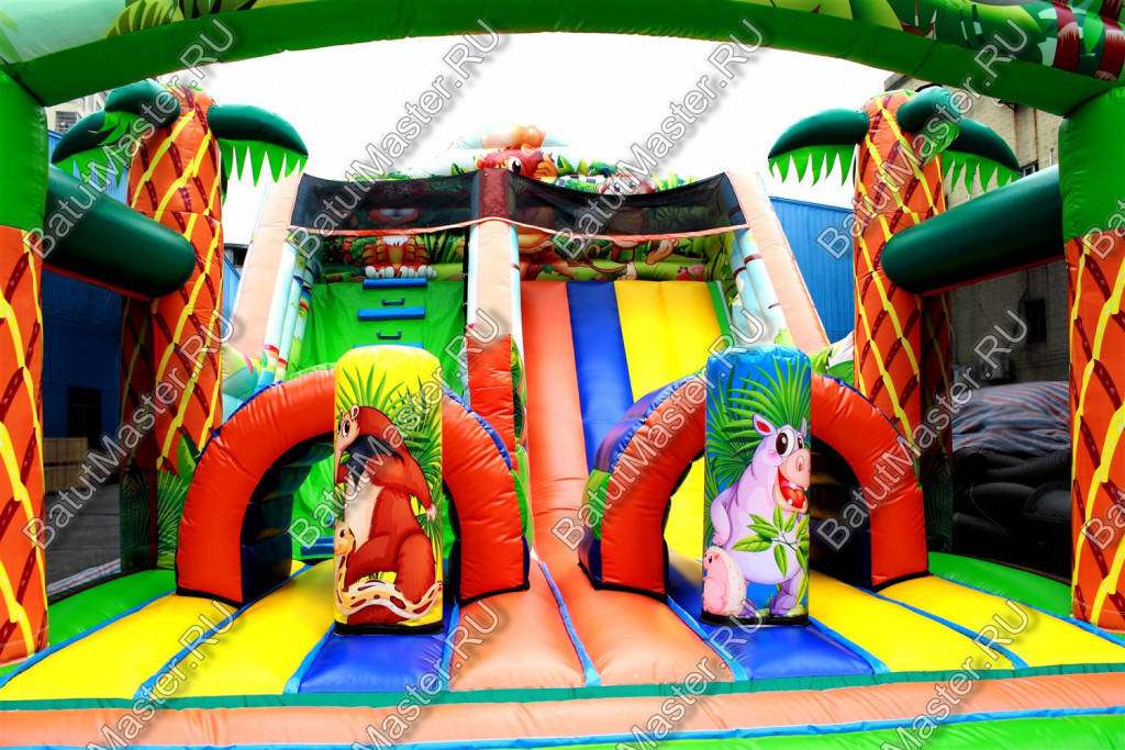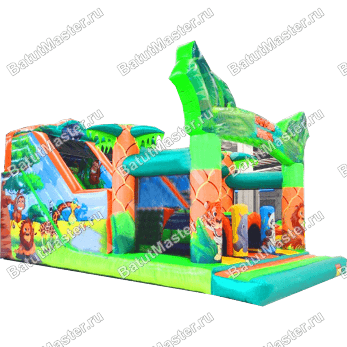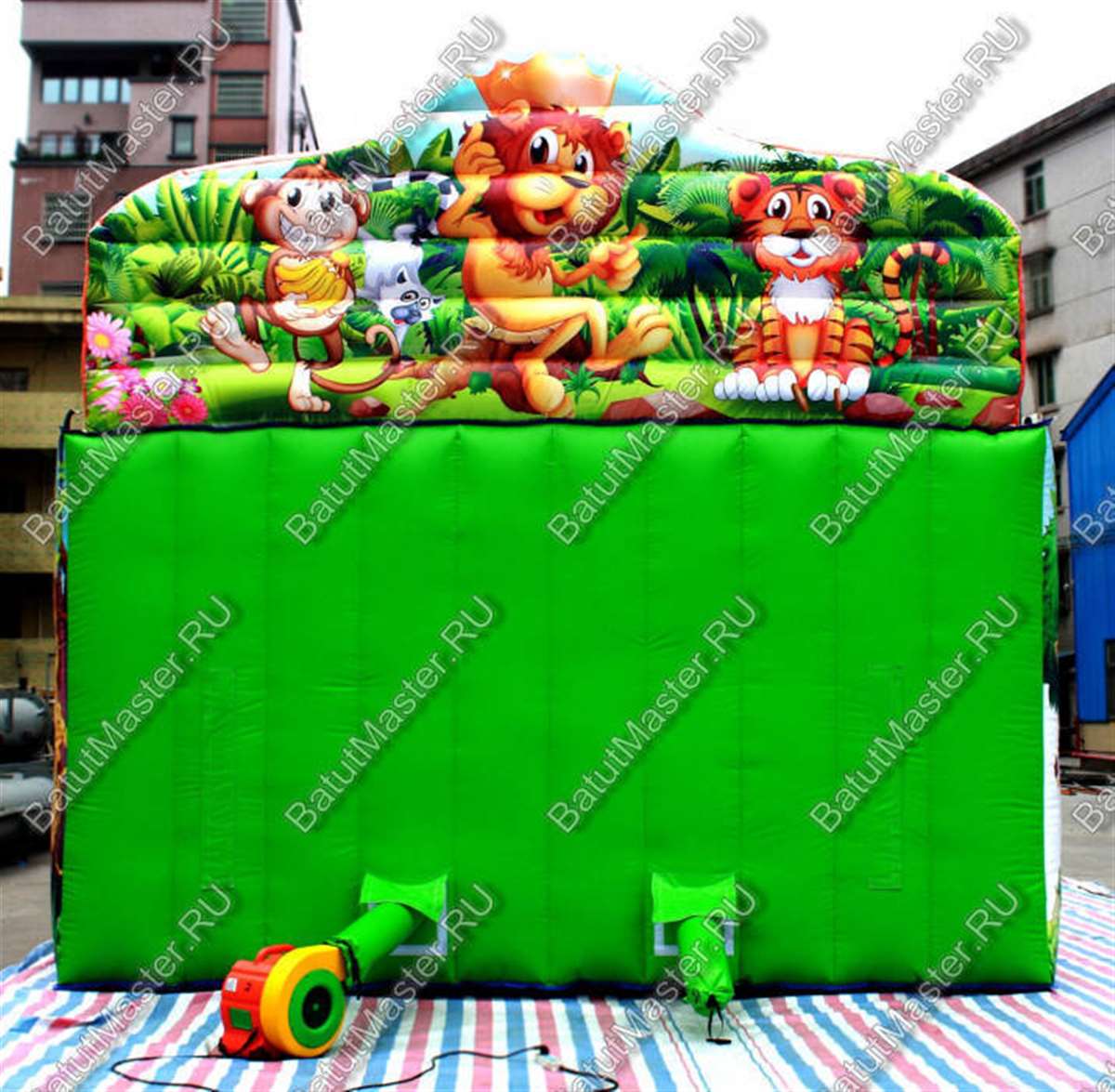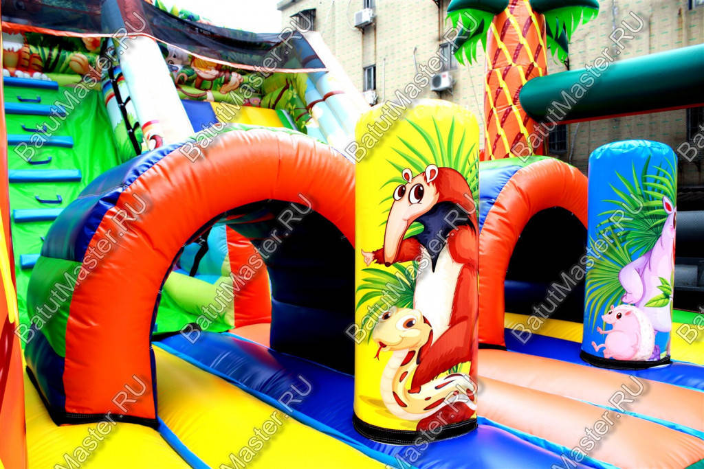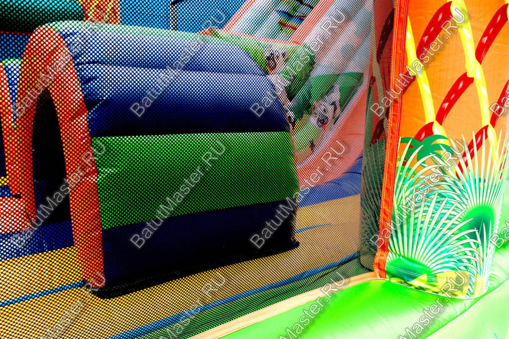 Интересный и познавательный надувной батут привлечет внимание маленьких детей. В юном возрасте забираться наверх мягких модулей, а потом спускаться вниз и снова забираться на них – это именно то, что нравится детям. Яркий, интересный, он оснащен модулями в виде тоннеля, колец, широкой горки. Здесь каждый ребенок найдет себе занятие по душе и с удовольствием проведет время. Он выполнен в стиле сафари парка, о чем говорят надувные модули с изображением обезьян, бегемотов, львов и других. Верх батута имитируют пальмы.