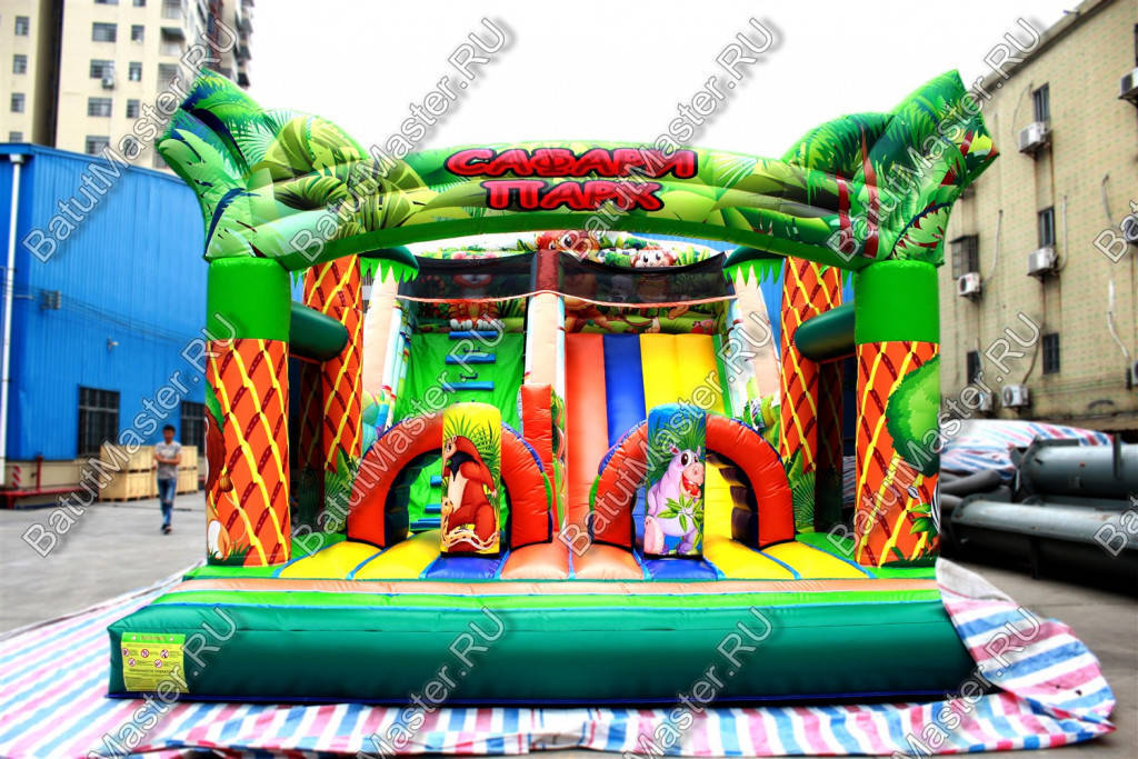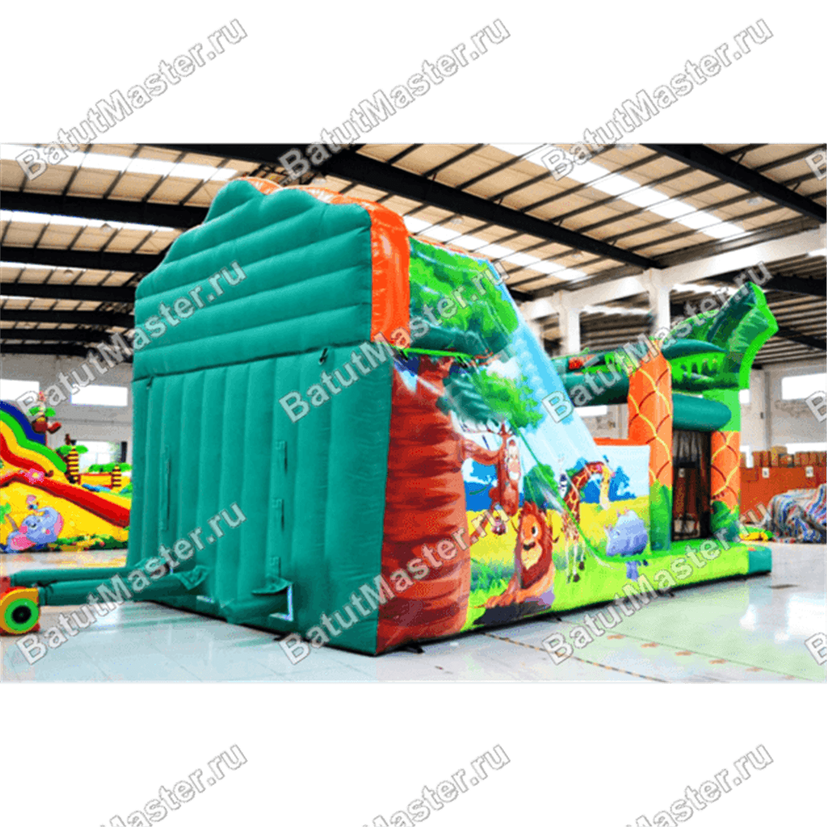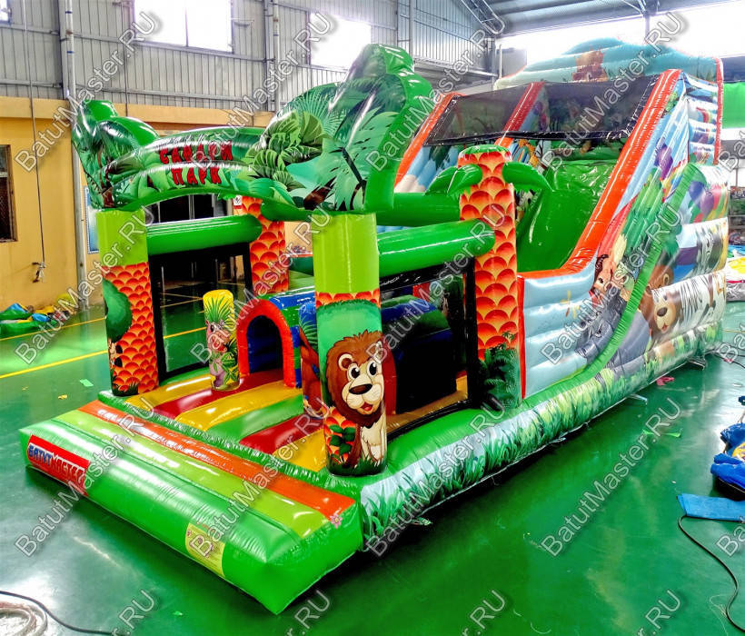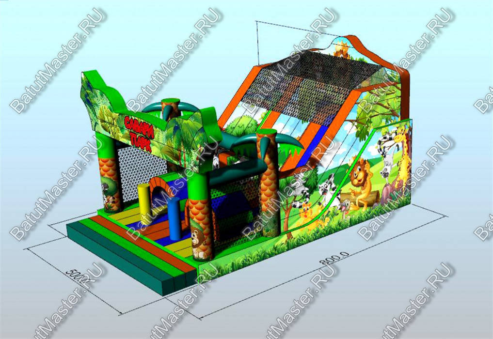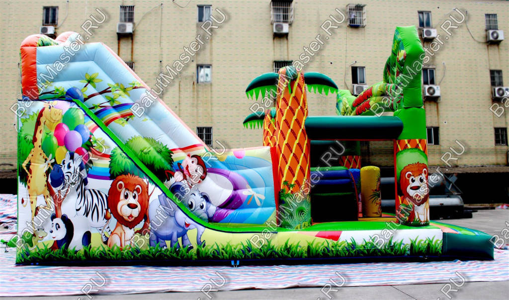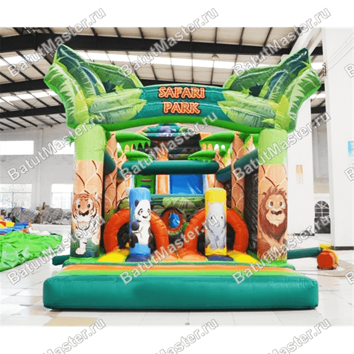 Интересный и познавательный надувной батут привлечет внимание маленьких детей. В юном возрасте забираться наверх мягких модулей, а потом спускаться вниз и снова забираться на них – это именно то, что нравится детям. Яркий, интересный, он оснащен модулями в виде тоннеля, колец, широкой горки. Здесь каждый ребенок найдет себе занятие по душе и с удовольствием проведет время. Он выполнен в стиле сафари парка, о чем говорят надувные модули с изображением обезьян, бегемотов, львов и других. Верх батута имитируют пальмы.