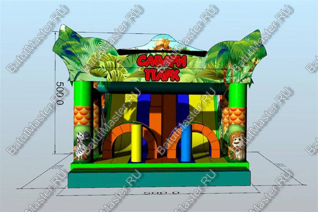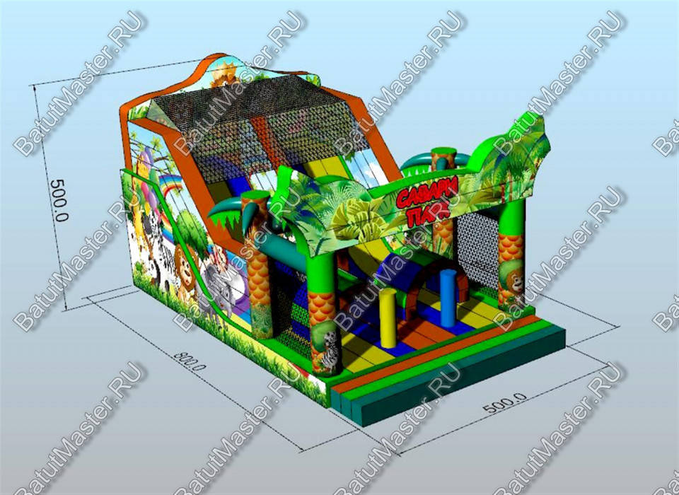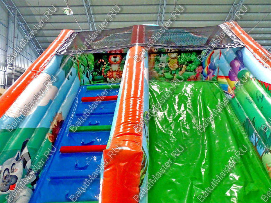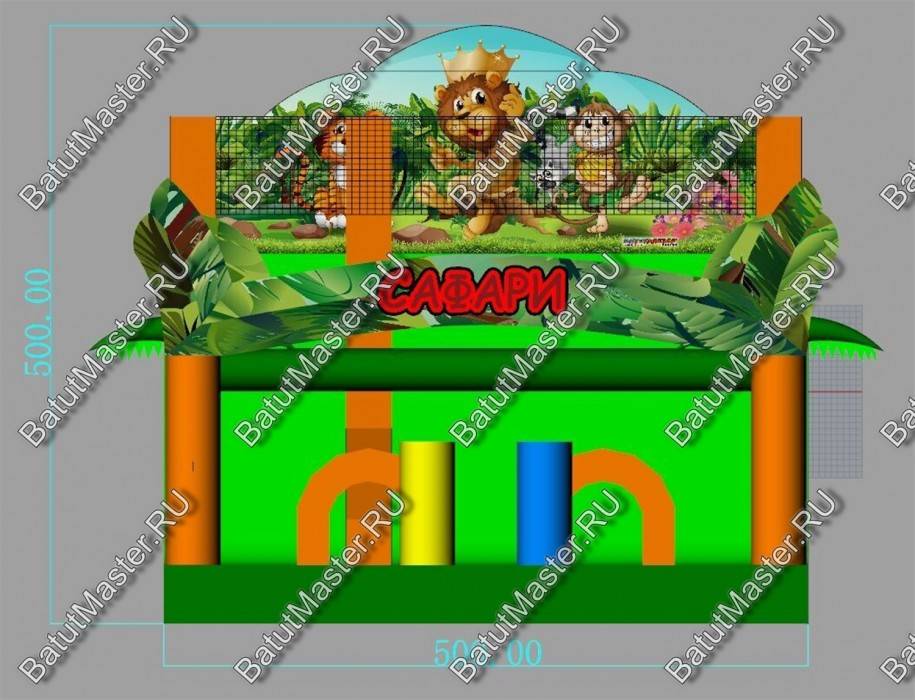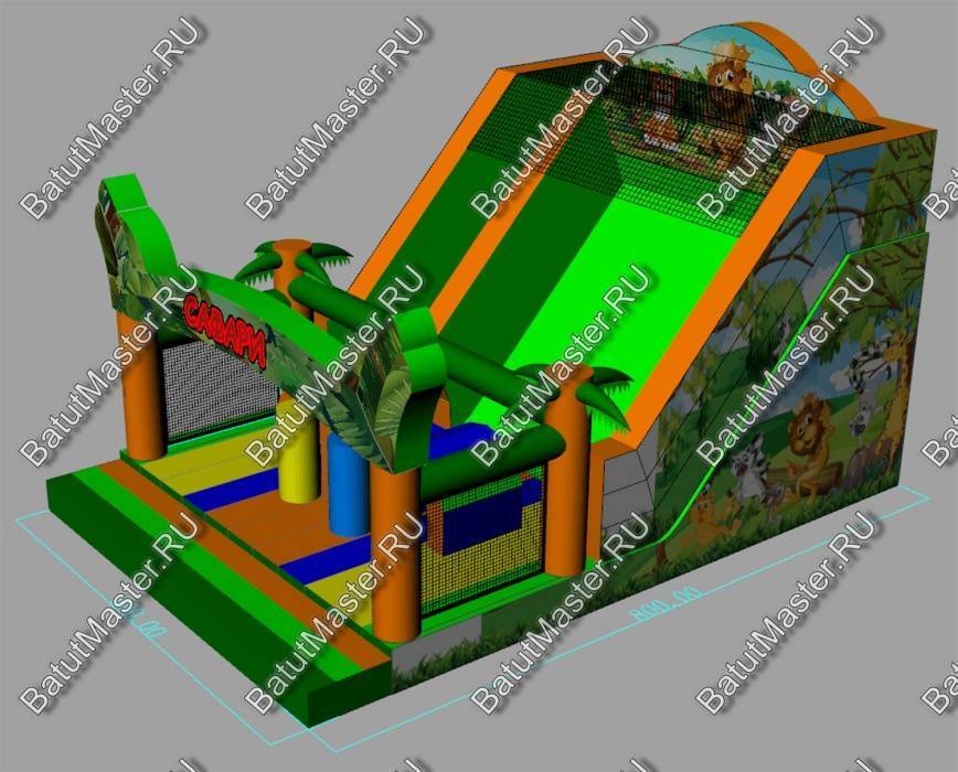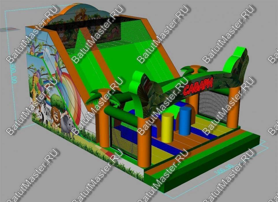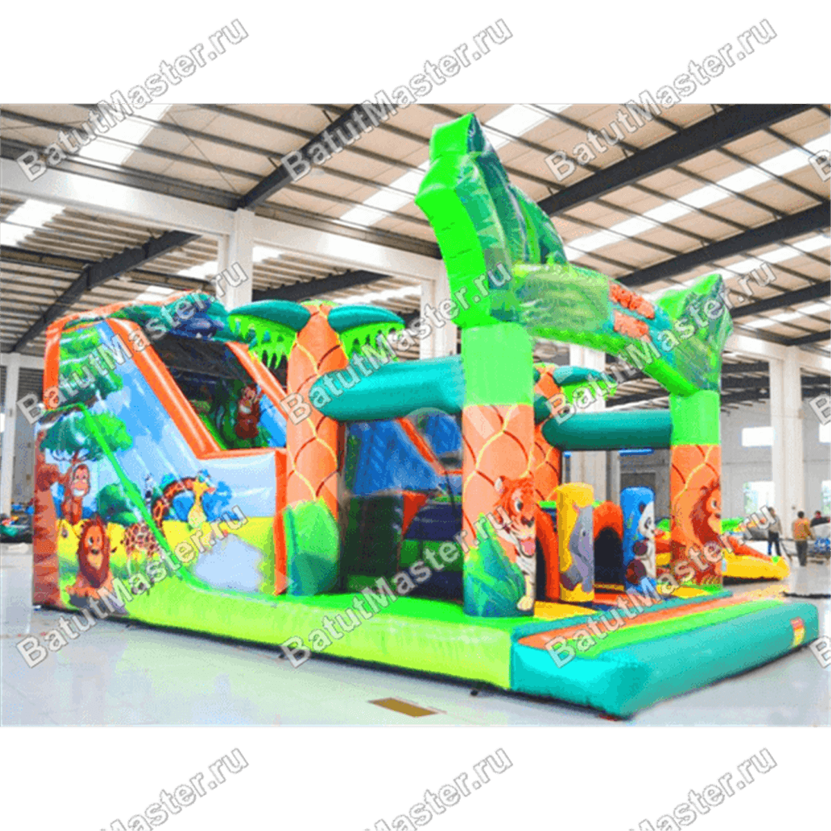 Интересный и познавательный надувной батут привлечет внимание маленьких детей. В юном возрасте забираться наверх мягких модулей, а потом спускаться вниз и снова забираться на них – это именно то, что нравится детям. Яркий, интересный, он оснащен модулями в виде тоннеля, колец, широкой горки. Здесь каждый ребенок найдет себе занятие по душе и с удовольствием проведет время. Он выполнен в стиле сафари парка, о чем говорят надувные модули с изображением обезьян, бегемотов, львов и других. Верх батута имитируют пальмы.