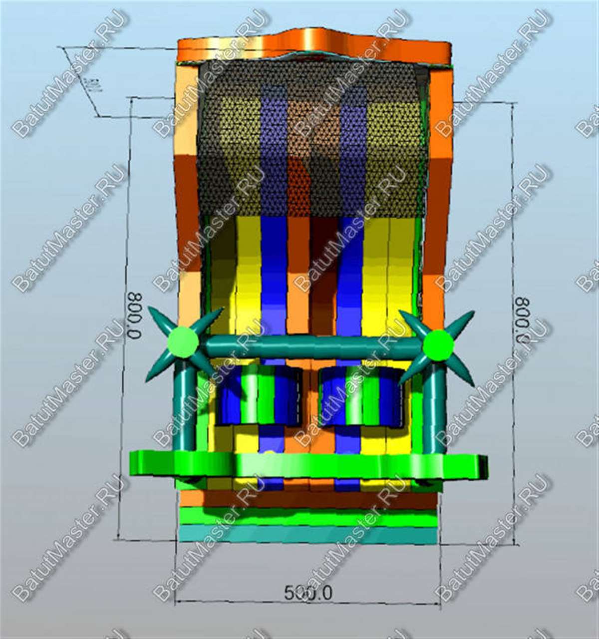 Батут выполнен из высококачественного ламинированного ПВХ, который устойчив к солнечным лучам и низкой температуре. Комплекс простой и неприхотливый в уходе. Предназначен для бизнеса. Может стать полноценной игровой зоной в торгово-развлекательном центре и даже на пляже.