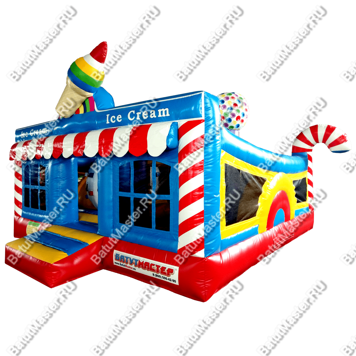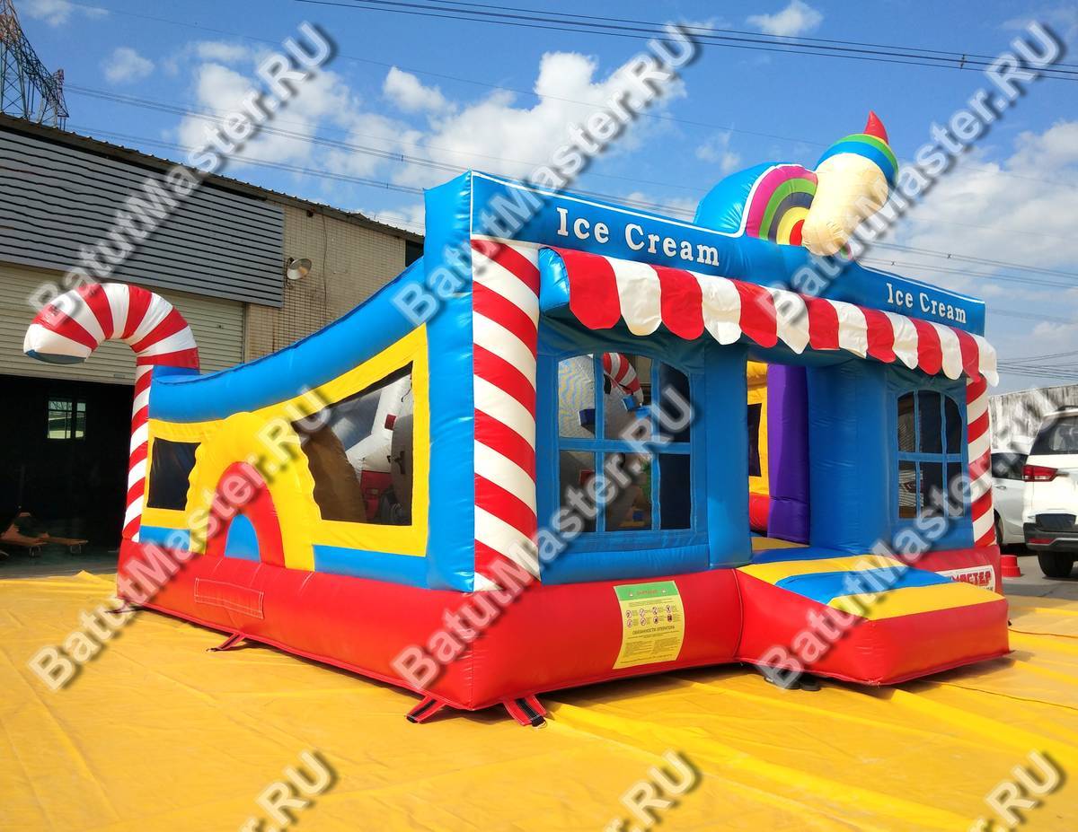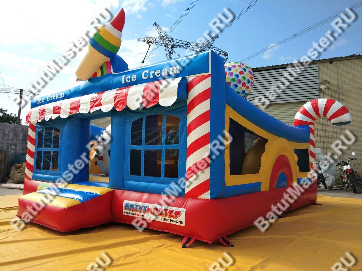Несмотря на то, что аттракцион сверху накрытый «крышей» из полотна ПВХ, внутри достаточно светло благодаря большим и высоким прозрачным «окнам». Зайдя внутрь, посетители обязательно обрадуются, ведь их ждет знакомство с огромным скалодромом в виде гигантского шарика мороженого. Также внутри имеются и другие игровые элементы, с которыми дети проведут весело время. По желанию просторную площадку внутри можно дополнить и другими игровыми фигурами (надувными). Задняя стенка аттракциона выполнена в виде огромной машины, которая развозит мороженое по специализированным магазинам. Углы батута украшены яркими надувными конфетами в спиралевидной расцветке. Над крышей имеется еще несколько ярких фигур, которые подтверждают, что внутри батута должно находиться настоящее мороженое.
