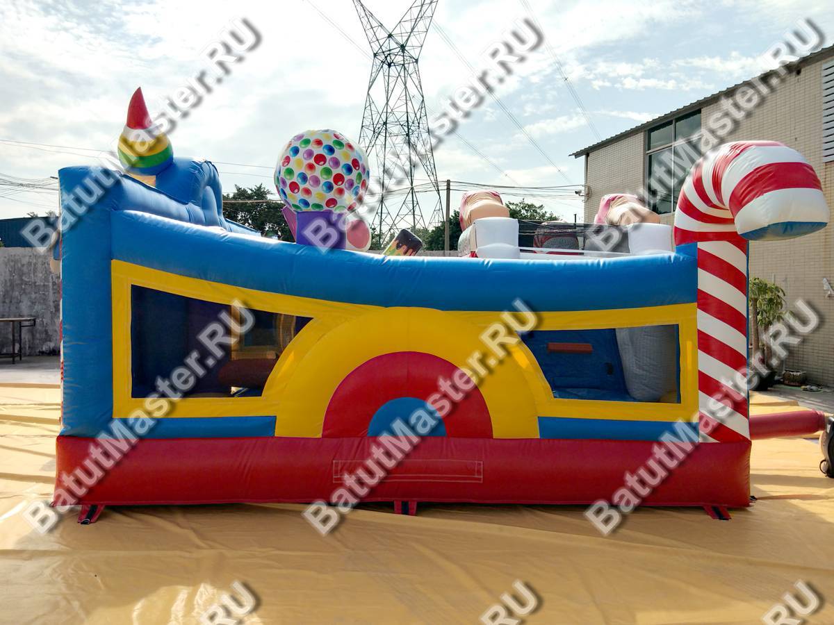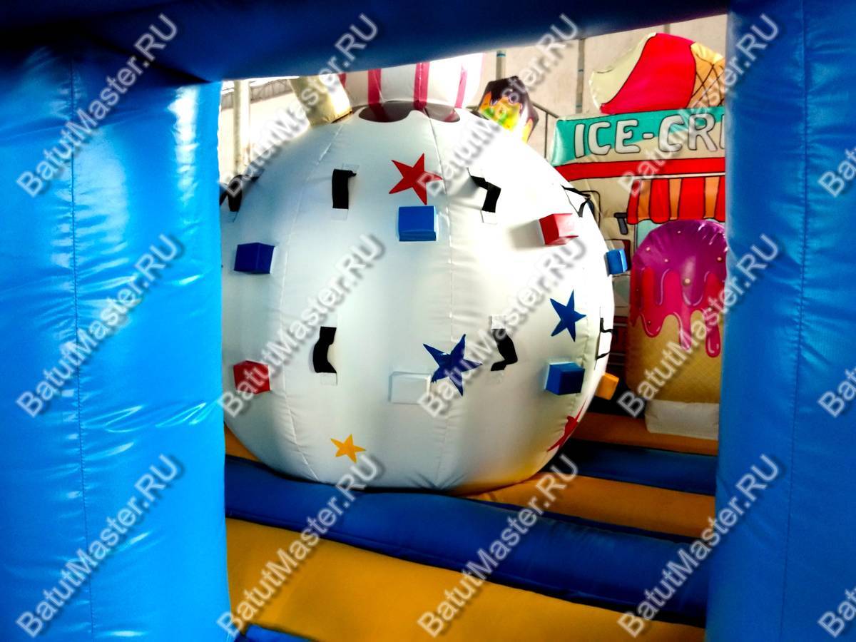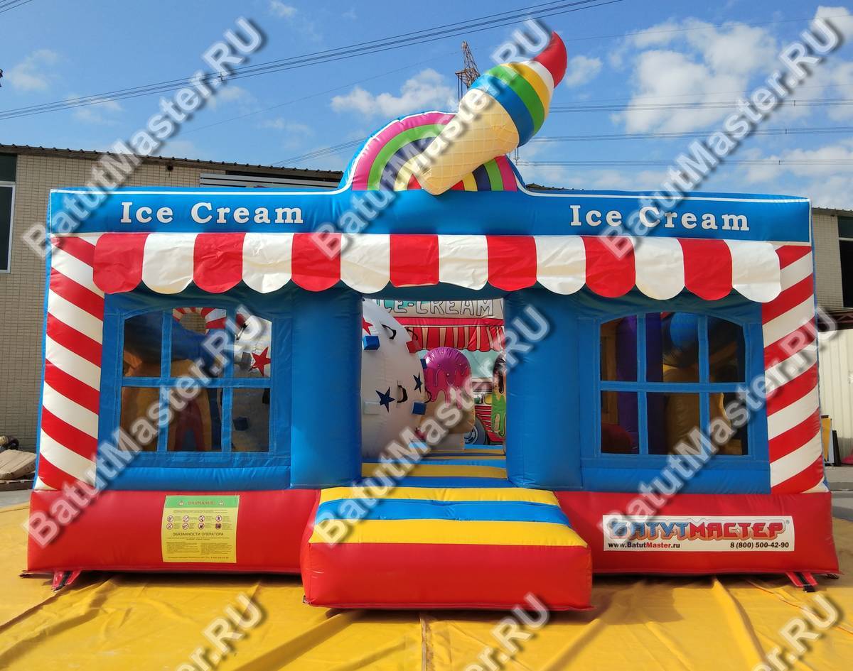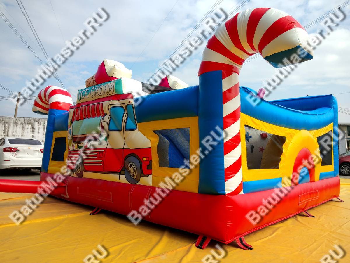 Несмотря на то, что аттракцион сверху накрытый «крышей» из полотна ПВХ, внутри достаточно светло благодаря большим и высоким прозрачным «окнам». Зайдя внутрь, посетители обязательно обрадуются, ведь их ждет знакомство с огромным скалодромом в виде гигантского шарика мороженого. Также внутри имеются и другие игровые элементы, с которыми дети проведут весело время. По желанию просторную площадку внутри можно дополнить и другими игровыми фигурами (надувными). Задняя стенка аттракциона выполнена в виде огромной машины, которая развозит мороженое по специализированным магазинам. Углы батута украшены яркими надувными конфетами в спиралевидной расцветке. Над крышей имеется еще несколько ярких фигур, которые подтверждают, что внутри батута должно находиться настоящее мороженое.