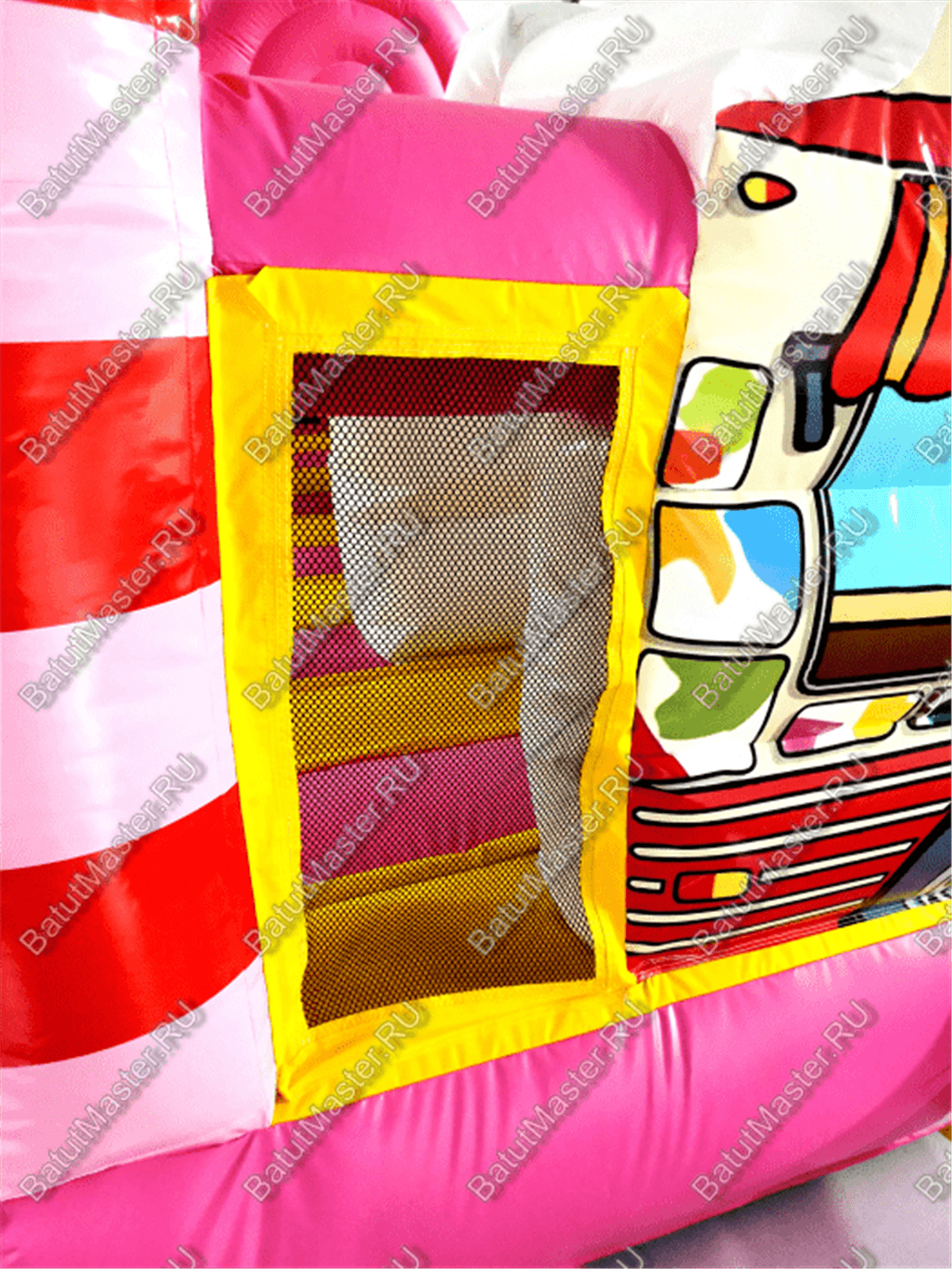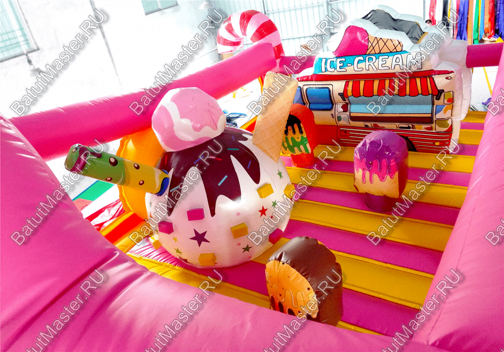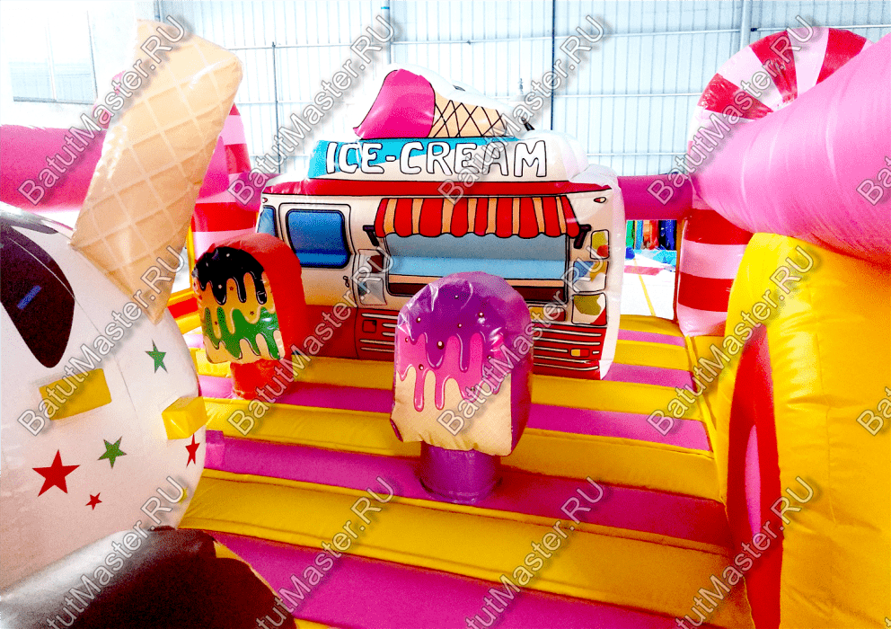Такой аттракцион предназначен для бизнеса и является беспроигрышным вариантом для зарабатывания денег. Фасадная стена представлена двумя прозрачными окнами и дверным проемом по центру, угловые колонны в розово-красной расцветке напоминают спиралевидные леденцы, а на самом верху установлены надувные фигуры мороженого. Одна из стен полностью передает изображения торгового фургончика с мороженым, поэтому можно сделать предположение, что перед нами не просто батут, а коммерческий прилавок сладостей.