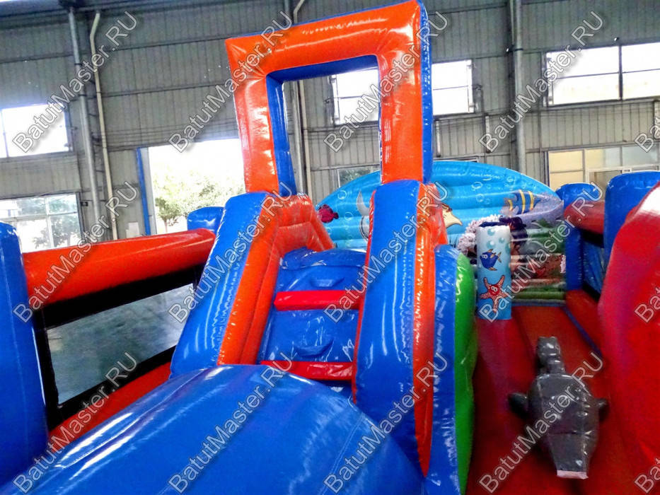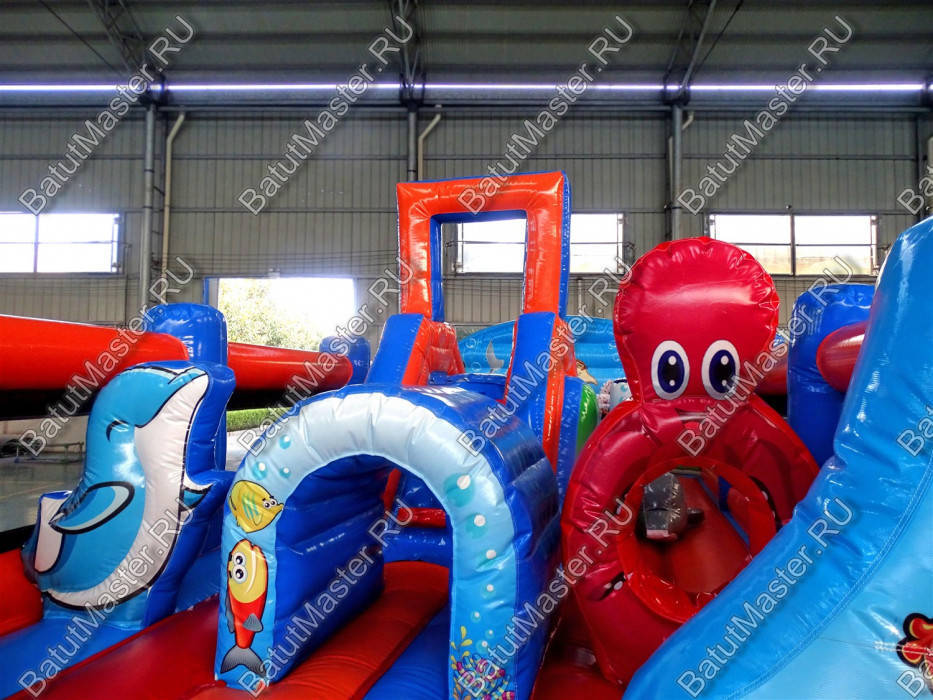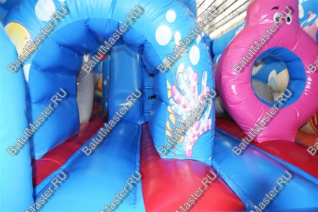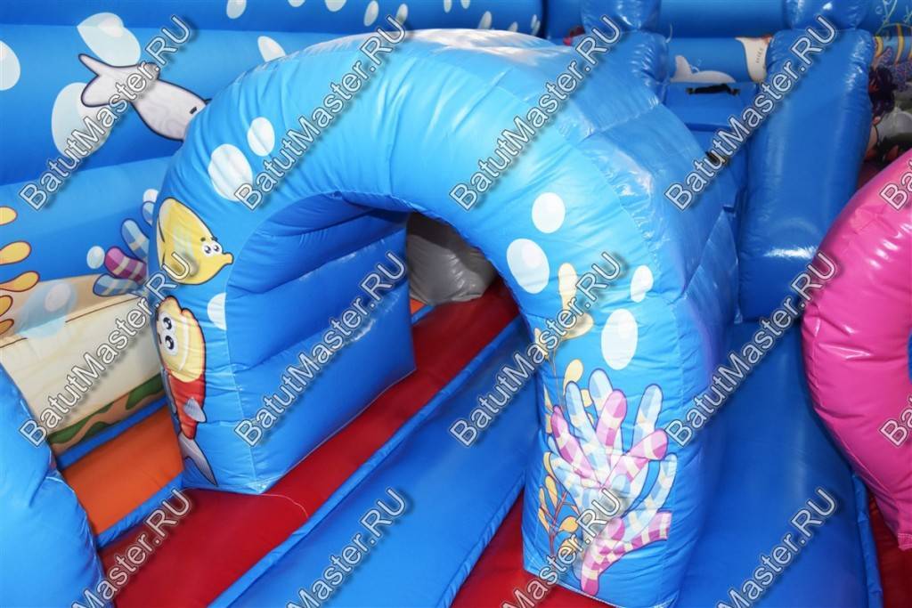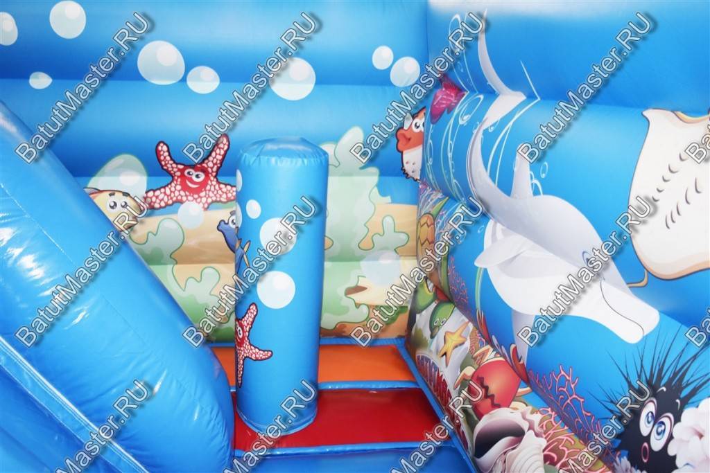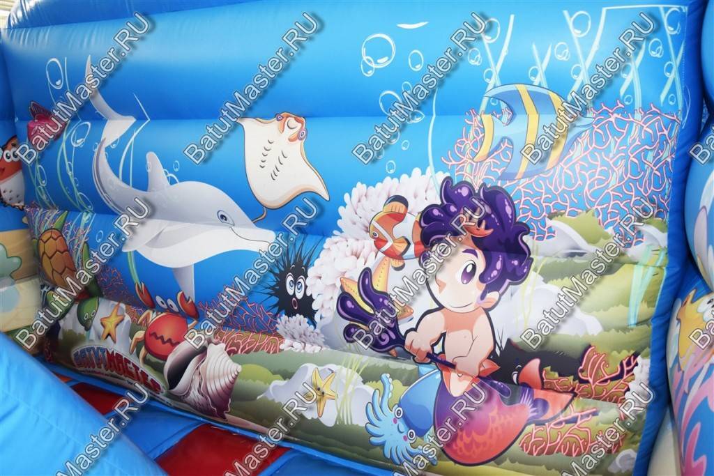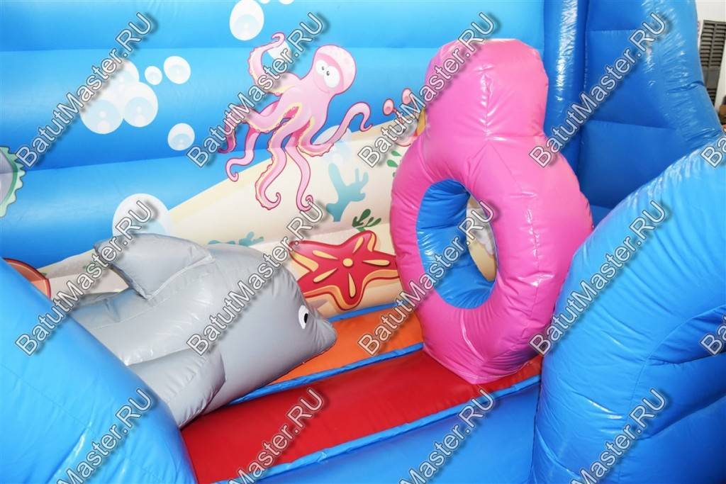 Яркие цвета батута можно увидеть издалека, ведь с них начинается сама подушка безопасности. В центре расположилась занимательная горка с таким же разноцветным подъемом, как и весь аттракцион. Все стены изнутри и снаружи изукрашены морскими подводными жителями. По всему периметру установлены высокие надувные стенки.